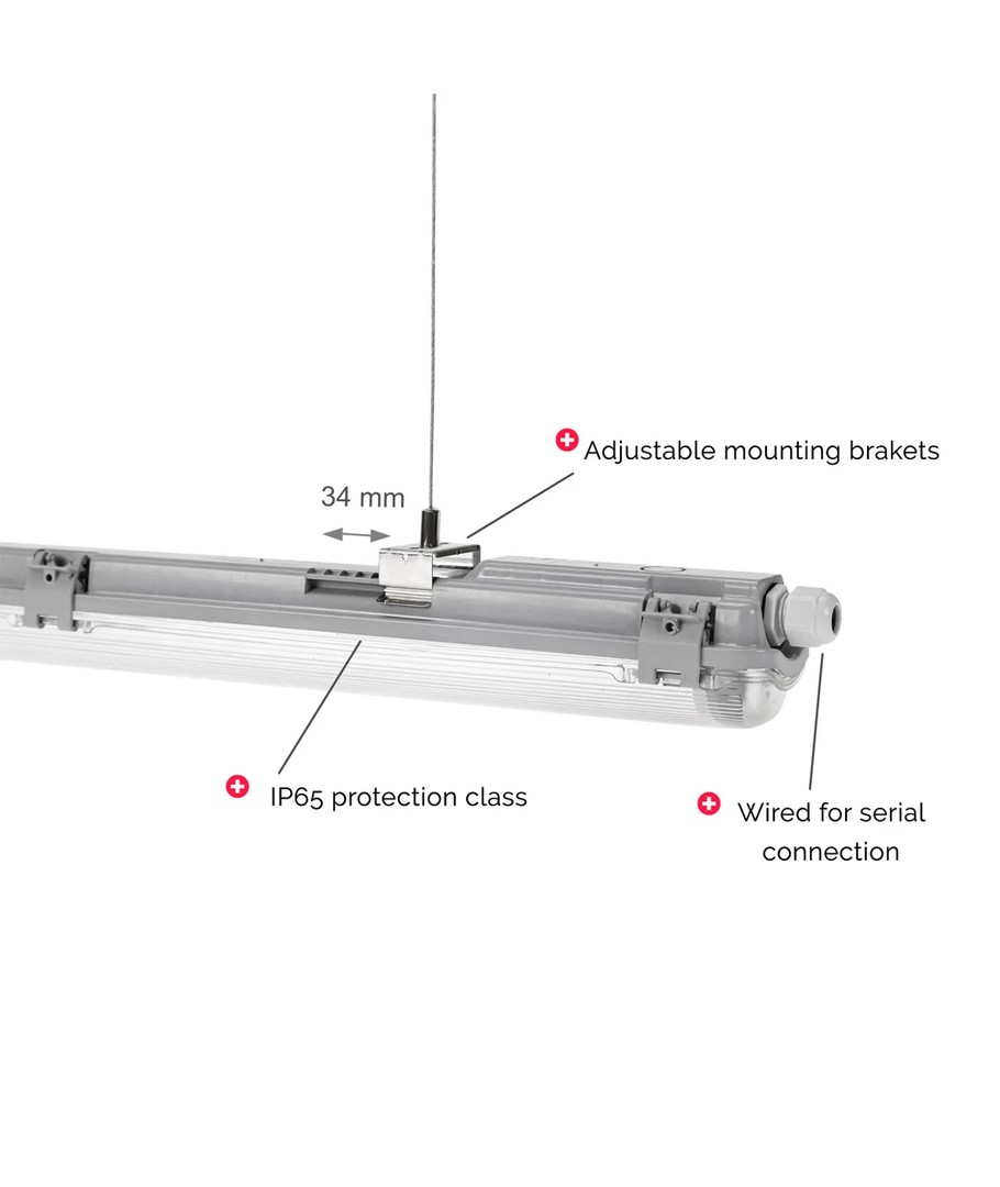 Dette armaturet er ideelt for deg som trenger en pålitelig og energieffektiv belysningsløsning. Det leveres med et 120 cm LED-rør og har en lysstyrke på 2000 lumen. LED-teknologien sørger for en høy lysspredning på 270 grader, noe som gir en jevn fordeling av lyset i rommet.