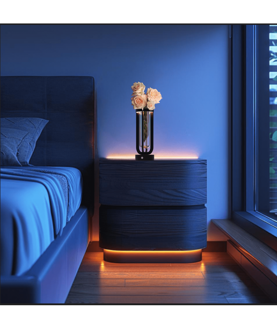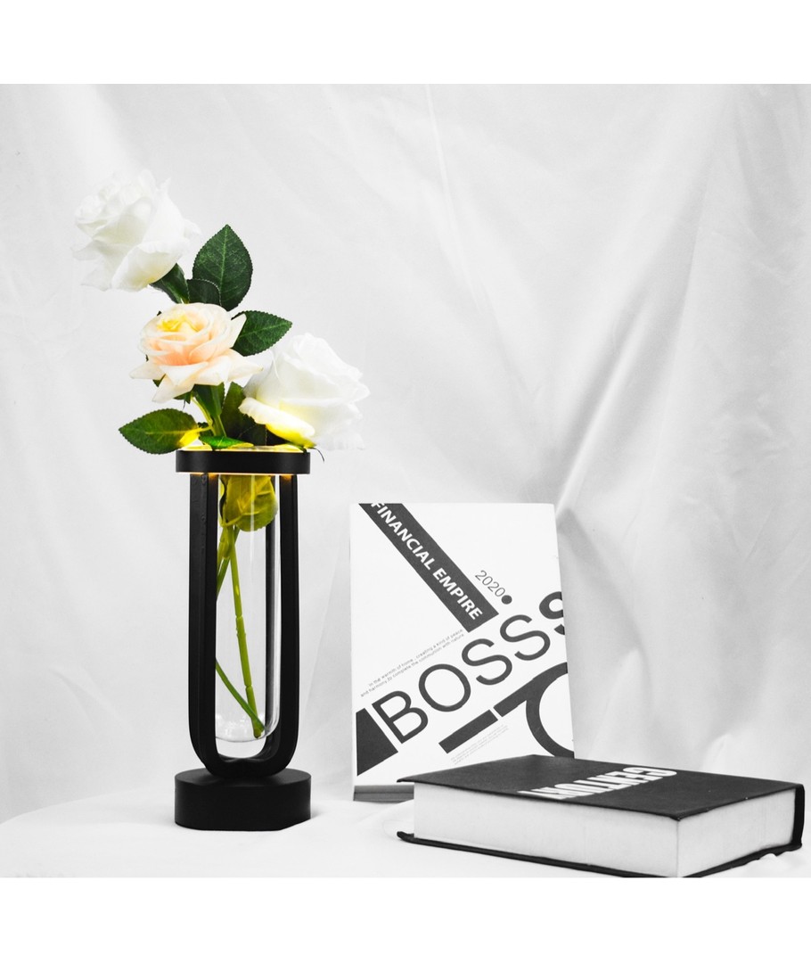 Oppgrader ditt dekorative uttrykk med en blomstervase som kombinerer eleganse med moderne teknologi. Denne vasen er ikke bare et stilfullt tillegg til rommet ditt, men den gir også et stemningsskapende lys uansett hvor du plasserer den, både innendørs og utendørs.