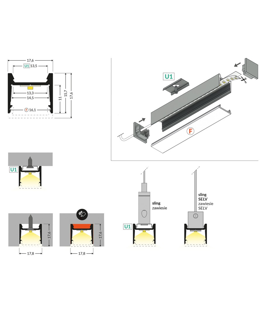 2m aluprofil HOOD14 F/U1 - Sort anodisert er en robust og elegant LED skinne for montering av lyskilder.