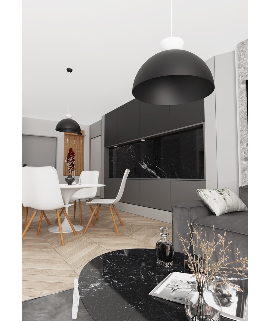 Det kontrastfulle svarte og hvite designet gjør denne lampen til et iøynefallende element i ethvert rom, enten det er over spisebordet, i stuen, eller på soverommet. Den gir deg fleksibiliteten til å velge hvilken type lyspære du ønsker, slik at du kan tilpasse lysstyrken etter ditt behov.