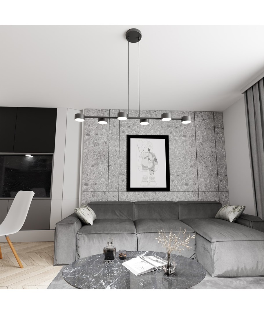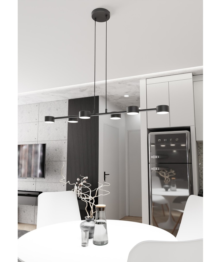 Megara 6 Sort pendellampe tilbyr en moderne belysningsløsning med et minimalistisk design, som tilfører et stilrent uttrykk til ditt hjem. Lampens seks sylindriske sokler er jevnt fordelt på en horisontal stang, som gir en utmerket lysfordeling. Med en elegant matt sort finish og justerbar høyde kan lampen tilpasses ulike rom, noe som gjør den ideell for både stue, spisestue og kontor. Megara 6 pendellampe er ikke bare en funksjonell lyskilde, men også en dekorativ tillegg som kombinerer stil med funksjonalitet.