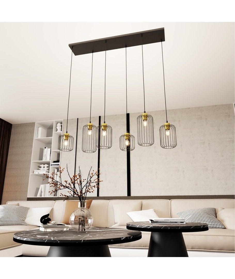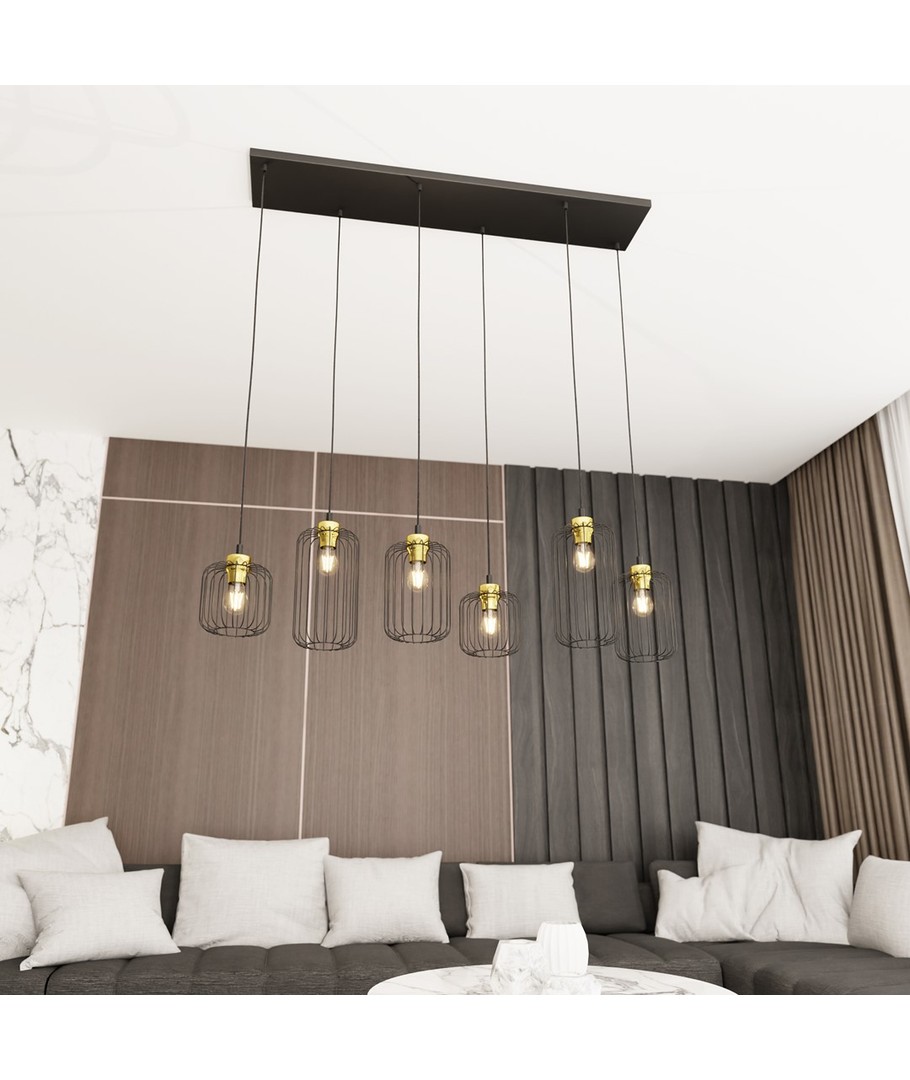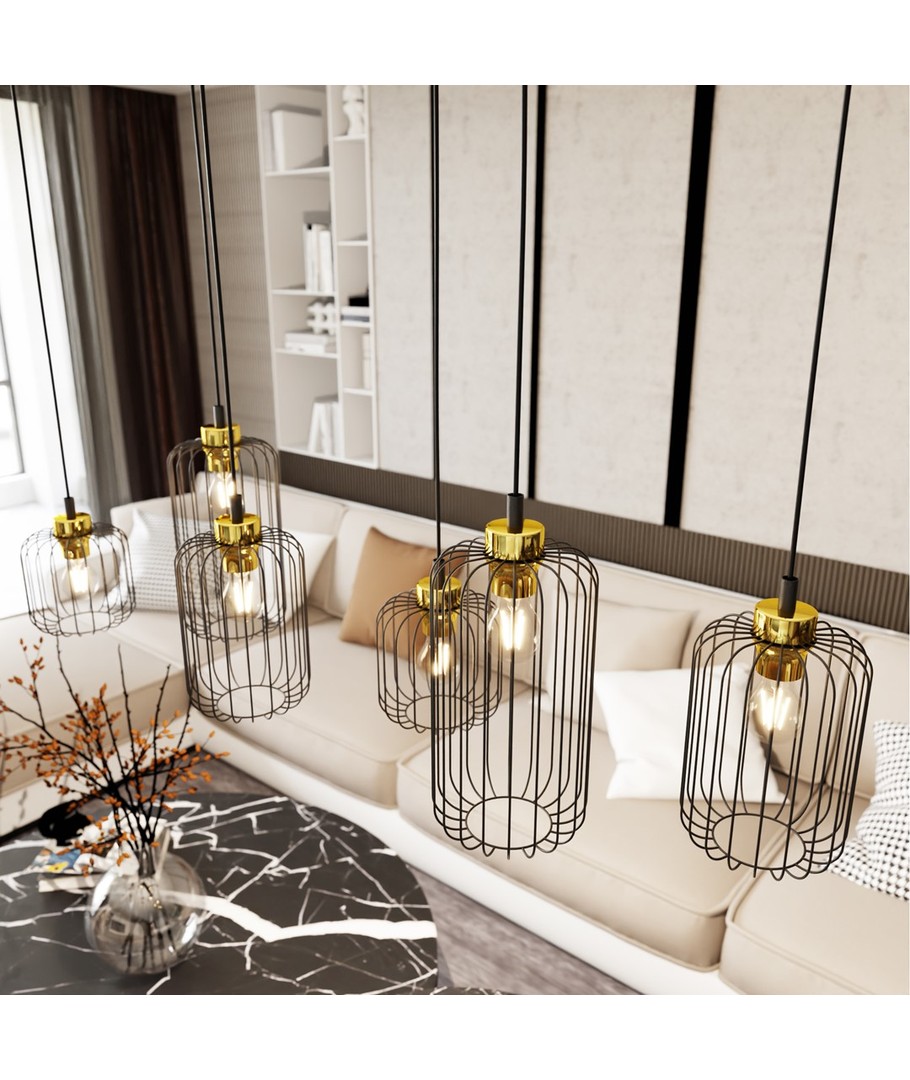 Vander 6 Sort/Gull pendellampe er det perfekte valg for deg som ønsker å legge til en kombinasjon av loft- og industriell stil til ditt hjem eller næringslokale. Lampen er laget av holdbart, pulverlakkert stål, som ikke bare sikrer lang levetid, men også et elegant uttrykk. De unike wireskjermene skaper fascinerende lyseffekter som fremhever lampens rå karakter. Denne lampen passer ideelt til stuen, spisestuen, kjøkkenet eller kommersielle rom og tilfører nytenkning og moderne design til enhver innredning.