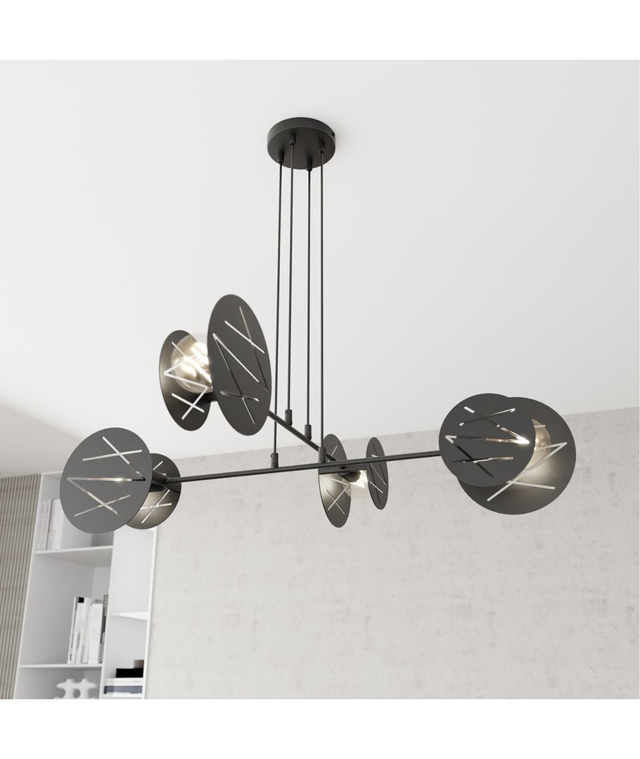 Xotic 4 Sort pendellampe er en moderne belysningsløsning, som skiller seg ut med sitt geometriske design og unike laserskårne detaljer på metalloverflaten. Denne lampen tiltrekker oppmerksomhet med sin originale form og tilfører en moderne karakter til enhver innredning. Ideell for stuer, spisestuer eller kontorer, hvor den avgir et imponerende lys som fremhever dens innovative stil. Perfekt for dem som verdsetter eksepsjonelt design og høy kvalitet.