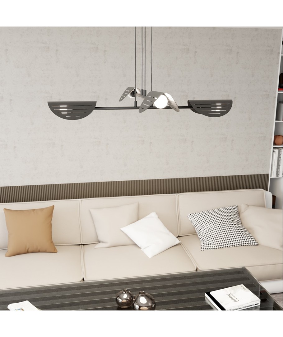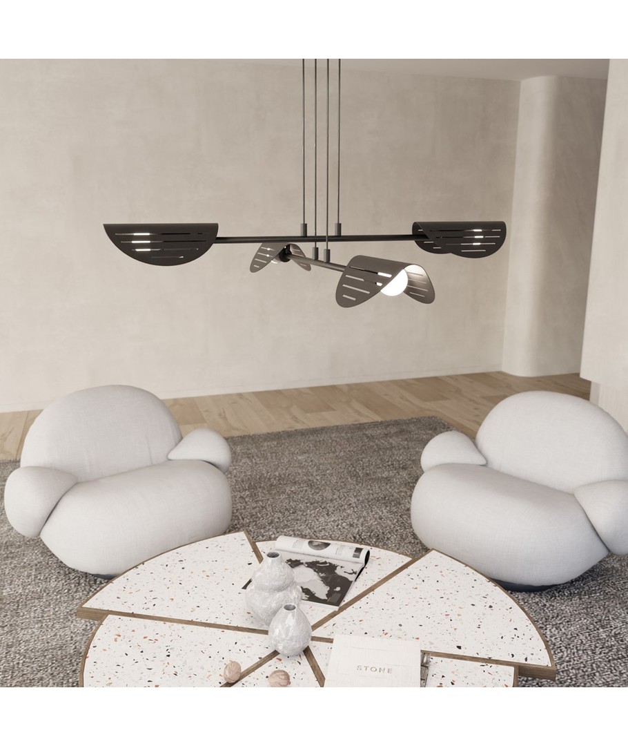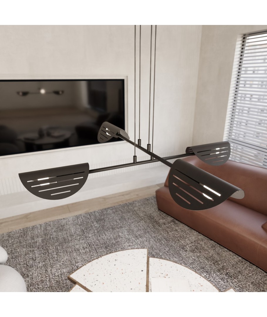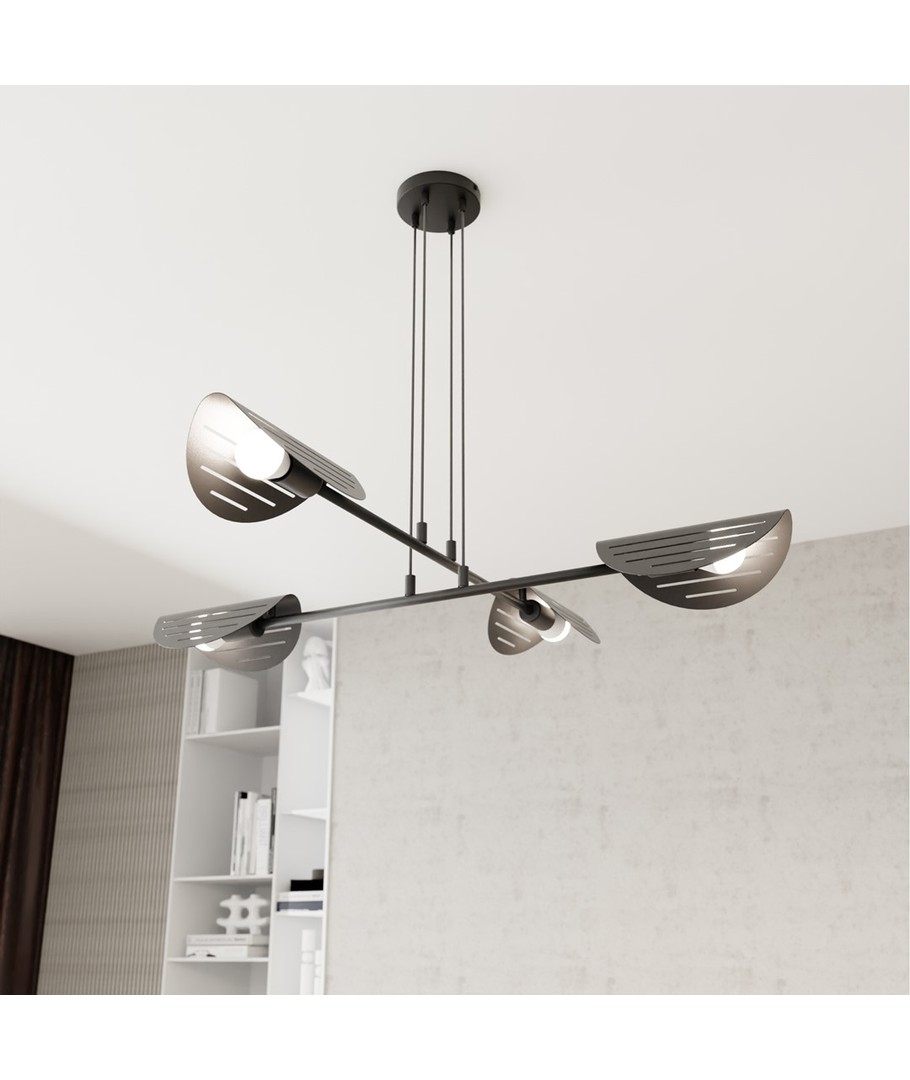 Saber 4 Sort pendellampe kombinerer moderne design med bemerkelsesverdige laserutskårne detaljer som fremhever lampens metaloverflate. Dens minimalistiske form og presise detaljer passer perfekt til tidsriktige interiørstiler. Med sin subtile belysning skaper den en unik atmosfære i stuen, spisestuen eller kontorområdene. Saber-lampen er det ideelle valget for de som ønsker en original og elegant lysløsning som forfiner og forsterker interiørets stil.