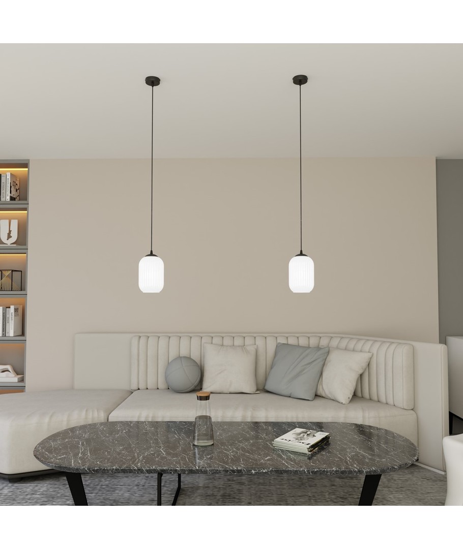 Skap en stemningsfull atmosfære i ditt hjem med denne stilrene pendellampen i sort og opal. Med sin enkle, men sofistikerte utforming, passer den perfekt til både moderne og klassiske interiørstiler.