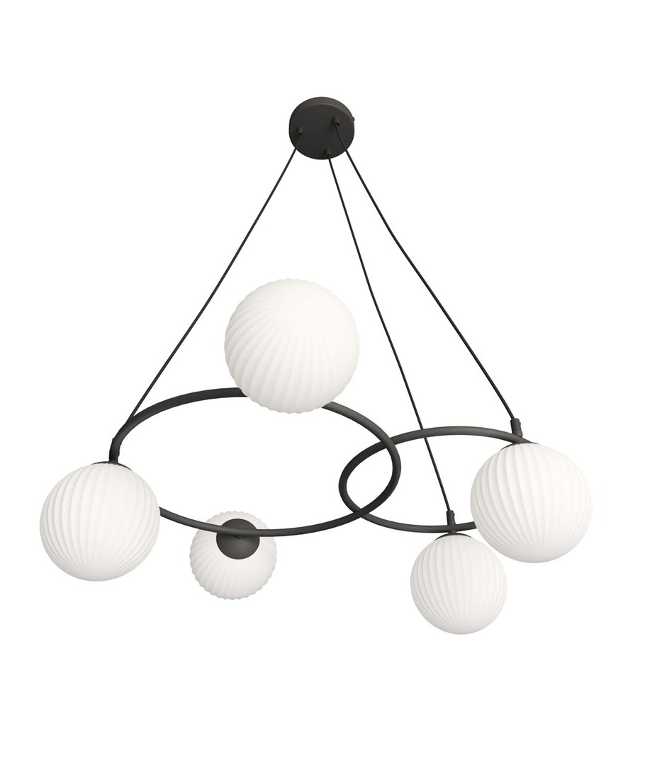 Libra 5 Sort/Opal pendellampe er en moderne belysningsløsning, som forener eleganse og funksjonalitet. Med sitt sofistikerte design bestående av to ringer, bringer den både letthet og harmoni til rommet. De opale glasskjermene avgir et varmt, behagelig lys, som skaper en hyggelig atmosfære, perfekt for stue, spisestue eller kommersielle områder. Lampens enkle, men stilige utseende gjør den enkel å integrere i forskjellige interiører, hvor den tilfører et moderne preg og klassisk eleganse.