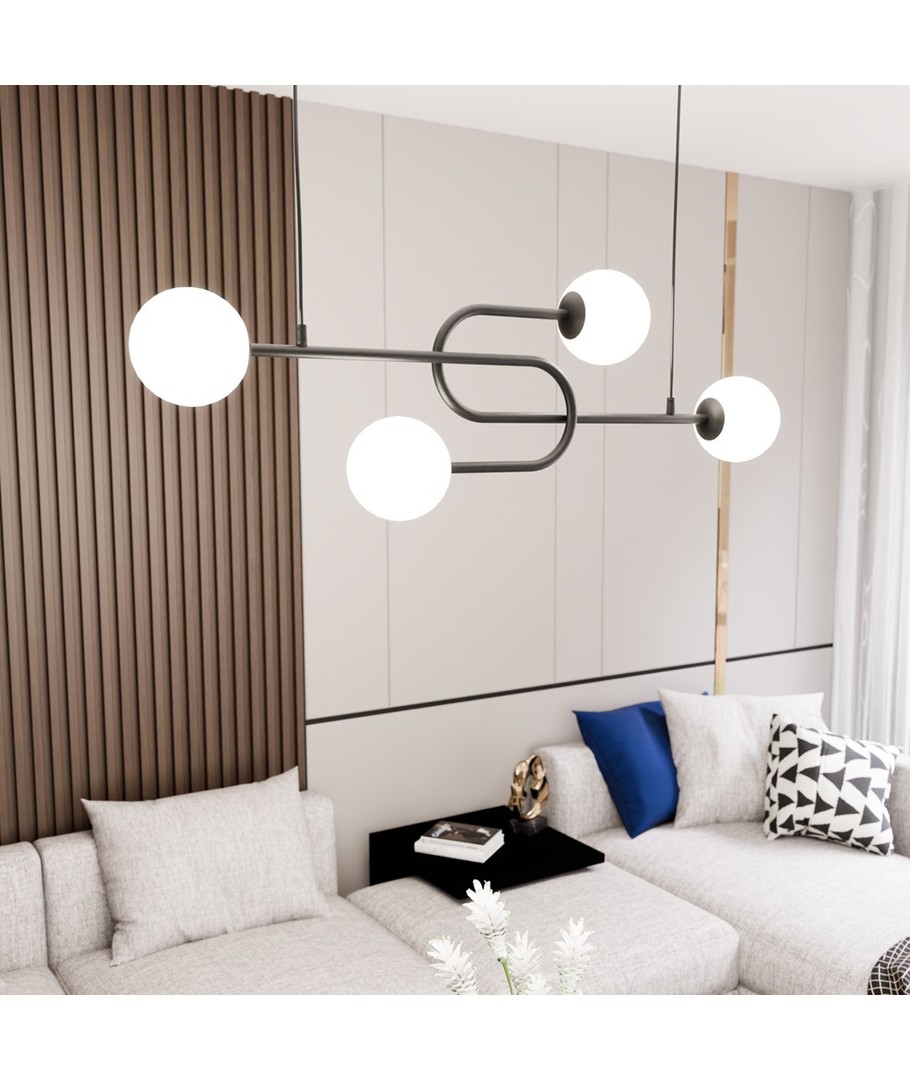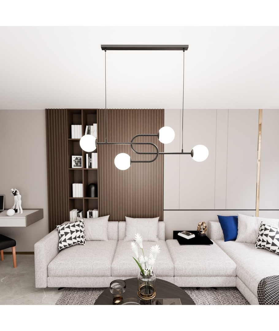 Atria 4 pendellampe tilfører en stilren eleganse til ethvert hjem eller kontor. Denne vakre lampen, utført i en kombinasjon av sort metall og opalhvitt glass, skaper en fascinerende balanse mellom moderne stil og tidløs sjarm.