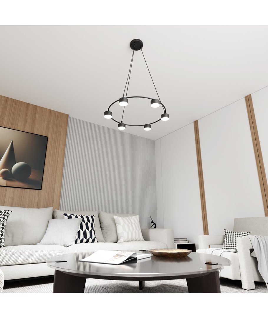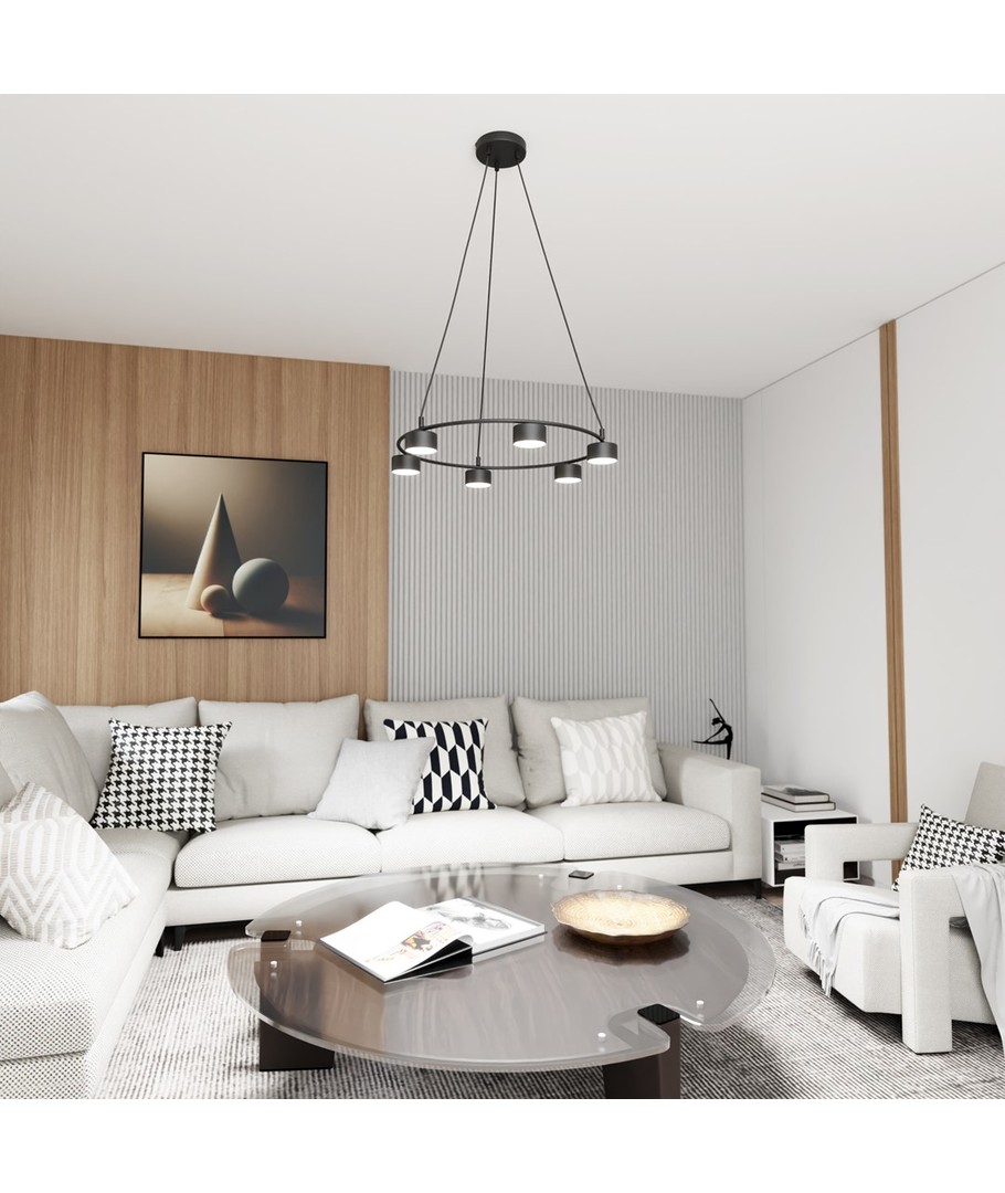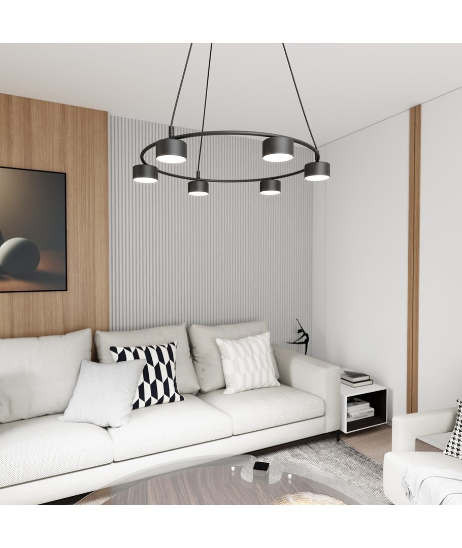 Starlit 6 sort pendellampe er det perfekte valg for dem som søker en moderne belysningsløsning med et minimalistisk design. Lampen kjennetegnes ved sin elegante sirkulære form, som lett tilfører rommet et sofistikert uttrykk. Den er fremstilt av høykvalitets pulverlakkert stål, noe som sikrer holdbarhet og en stilig overflate. Uansett om den brukes i stuen, spisestuen eller kjøkkenet, vil dens enkle linjer og design harmonisere perfekt med moderne innredning og skape en raffinert atmosfære.
