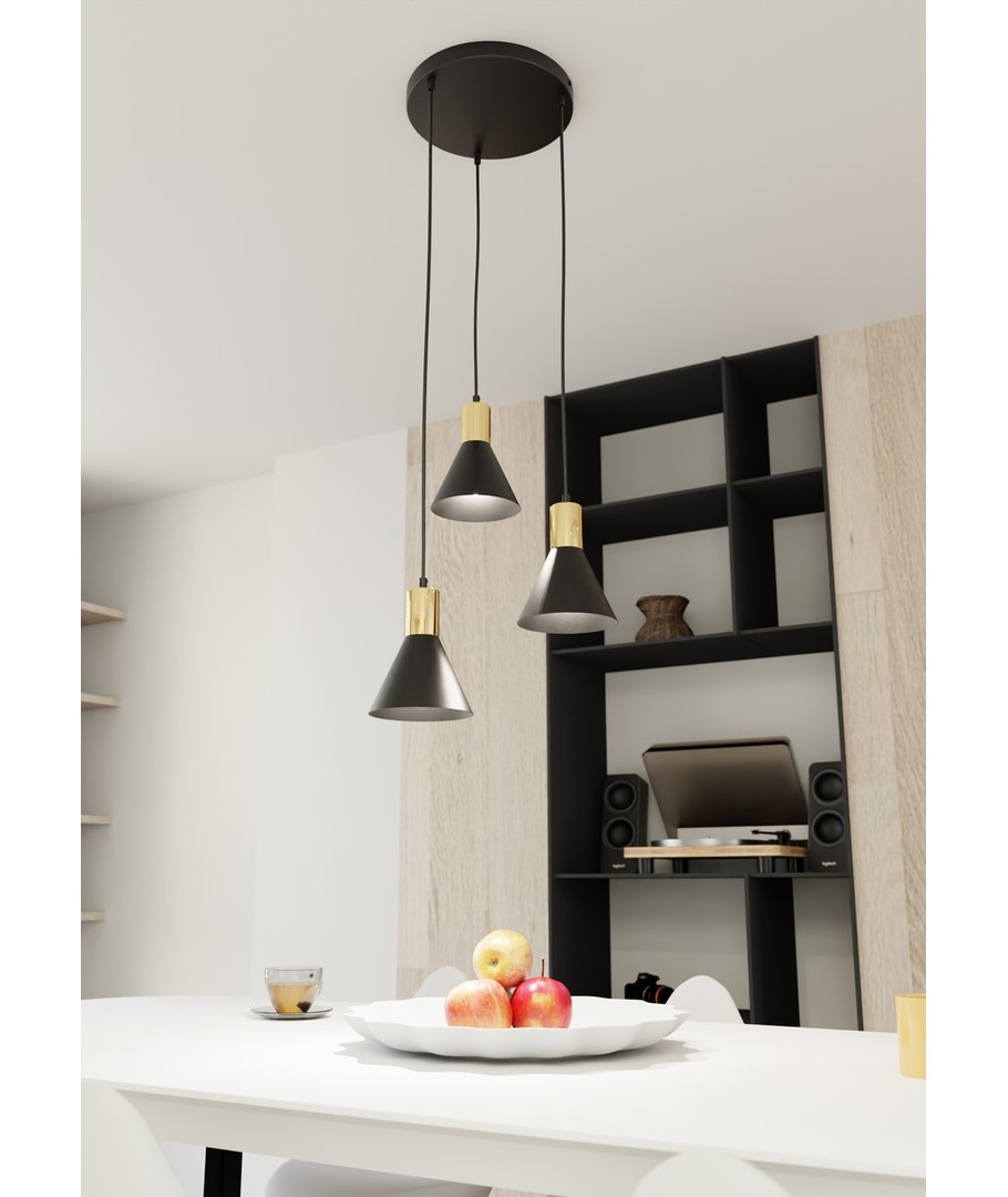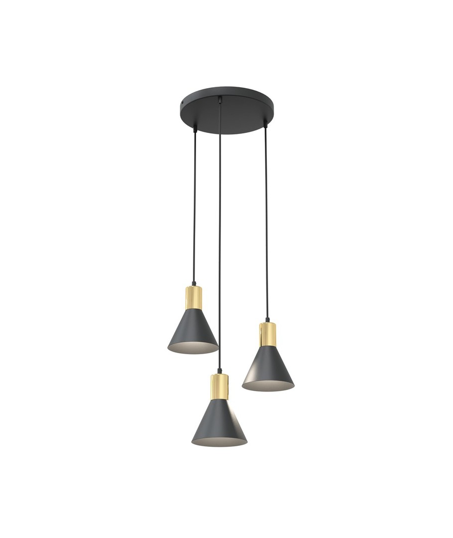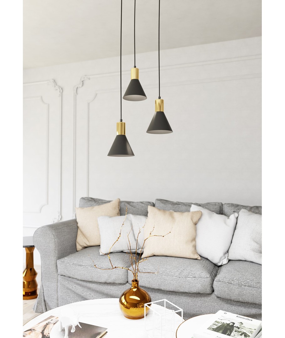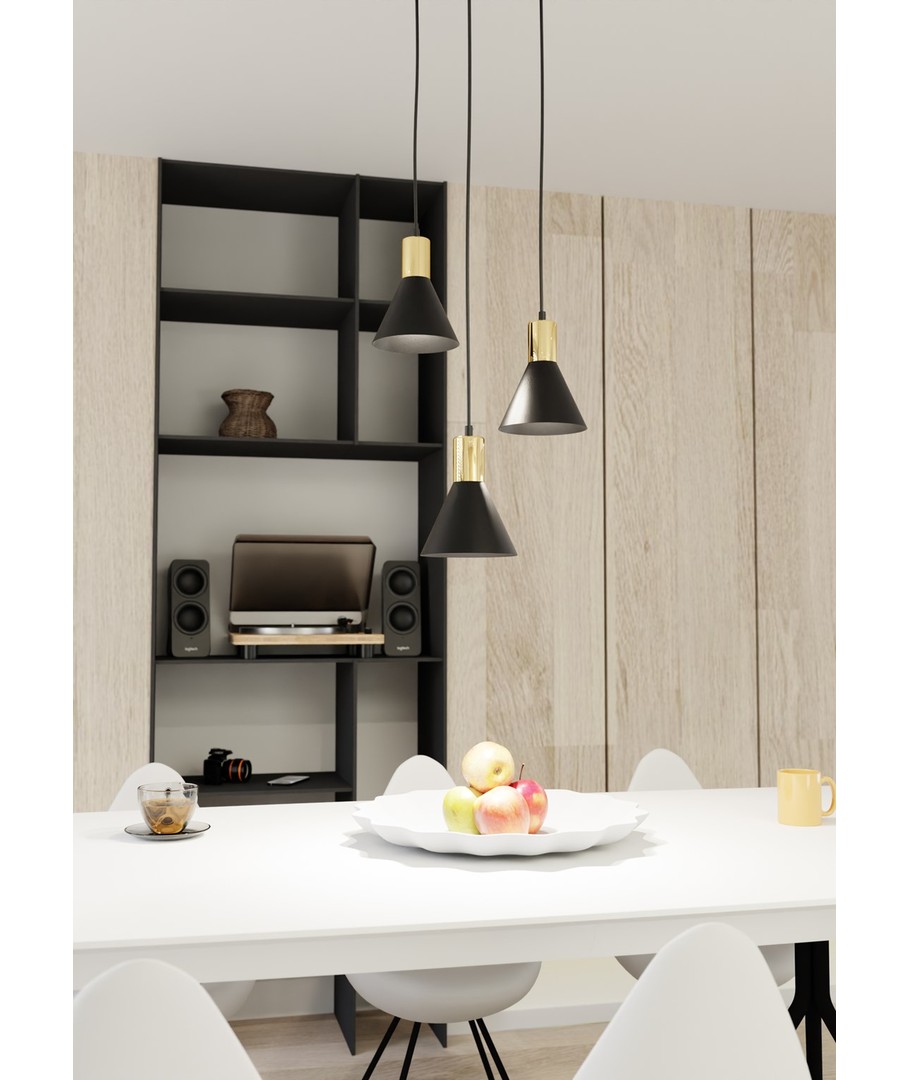 Opplev den stilfulle Rosa 3 Sort Prem pendellampe, som er et perfekt tillegg til en moderne loft-atmosfære. Med sitt enkle koniske metalldesign og elegante gulldetaljer, bringer denne lampen både varme og raffinement til ditt hjem.