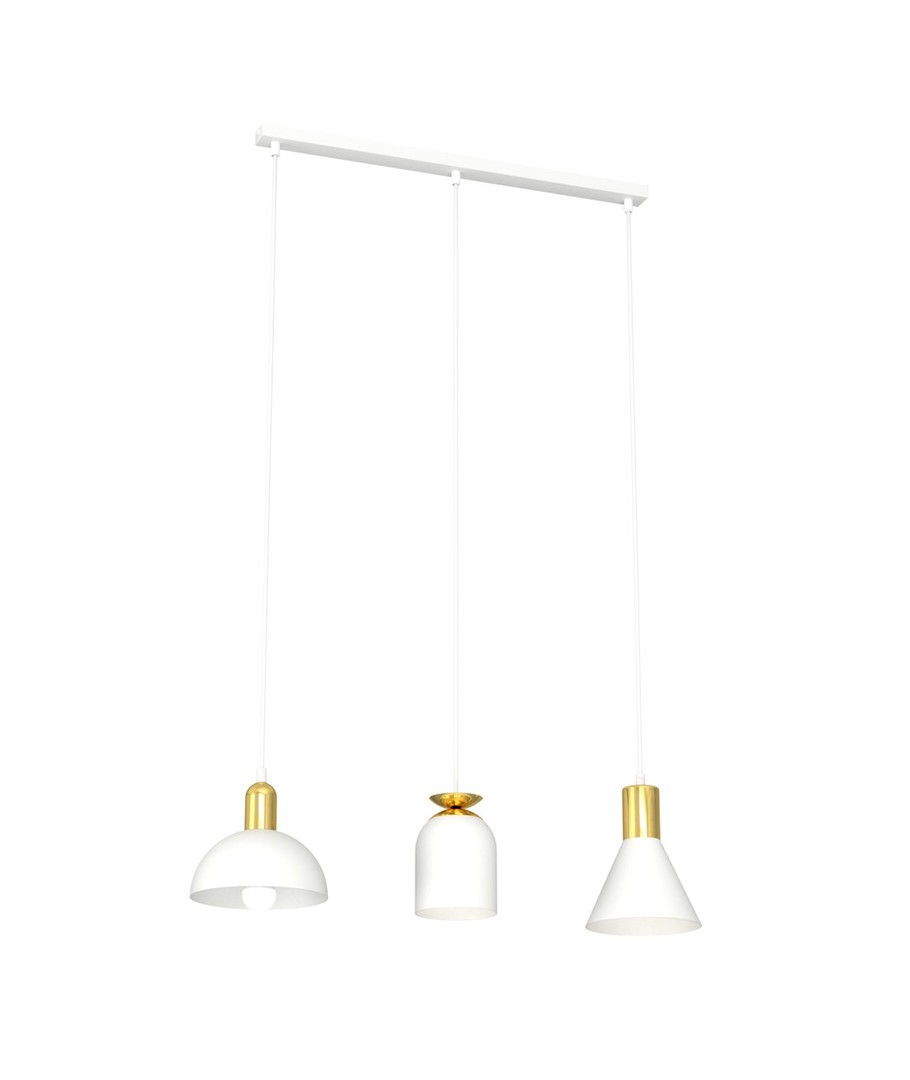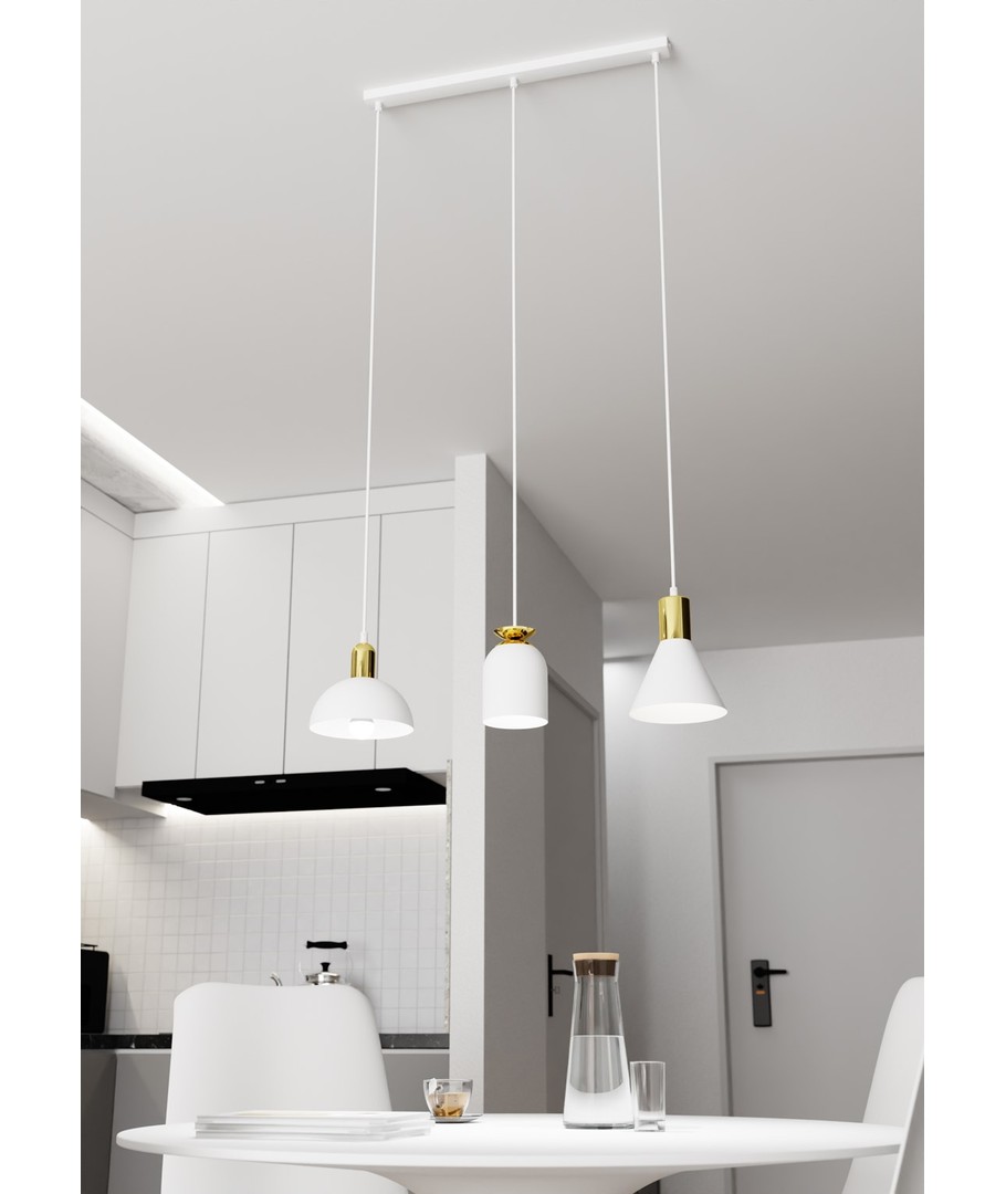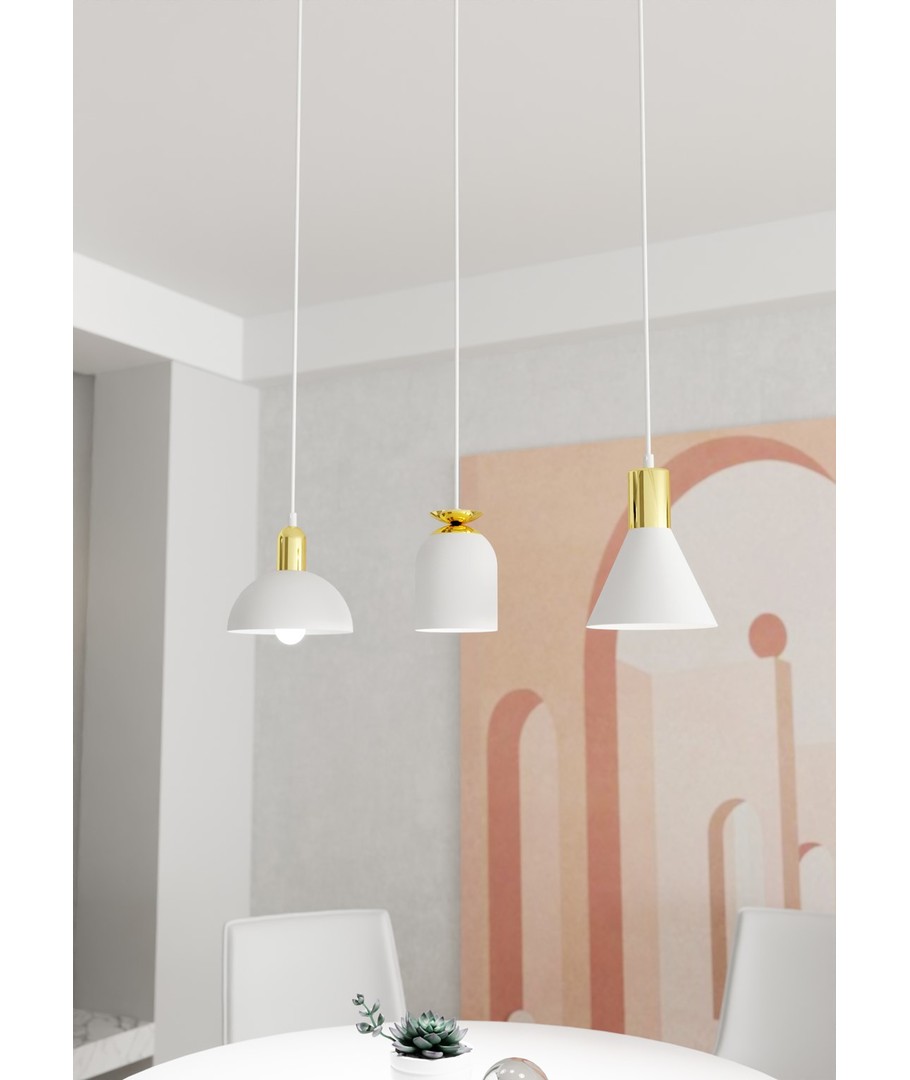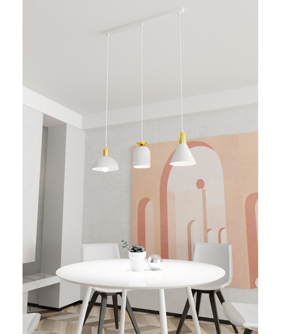 Fox 3 Hvit pendel er en unik tillegg til ethvert moderne hjem eller kommersielt miljø. Med tre metall skjermer i forskjellige former tilfører den en dynamisk karakter til rommet. De gyldne detaljene skaper en elegant kontrast til lampens rå design, noe som gir et snev av raffinement. Perfekt til stuer, spisesteder eller kontorer, hvor den industrielle stilen kombineres med sofistikert sjarm for å skape en unik atmosfære.