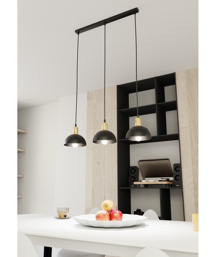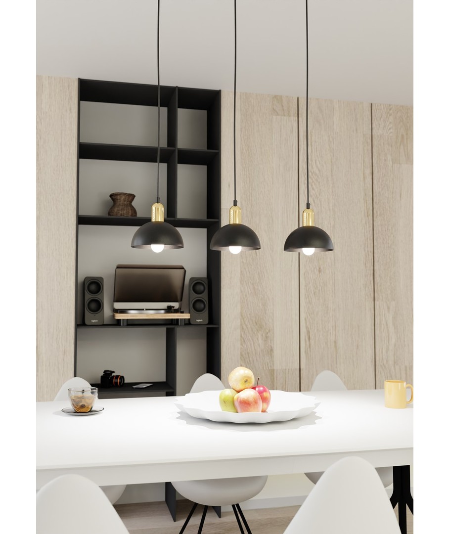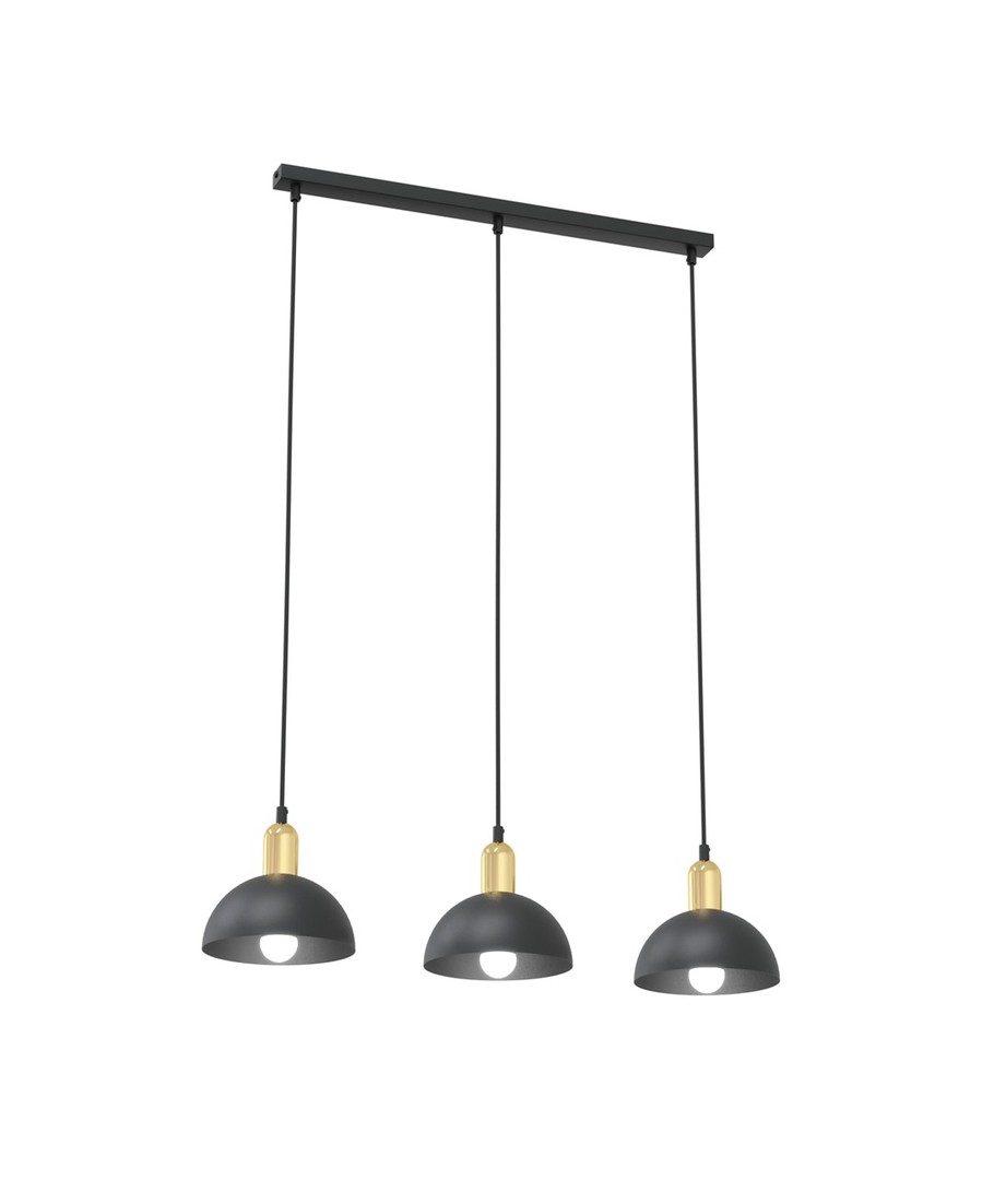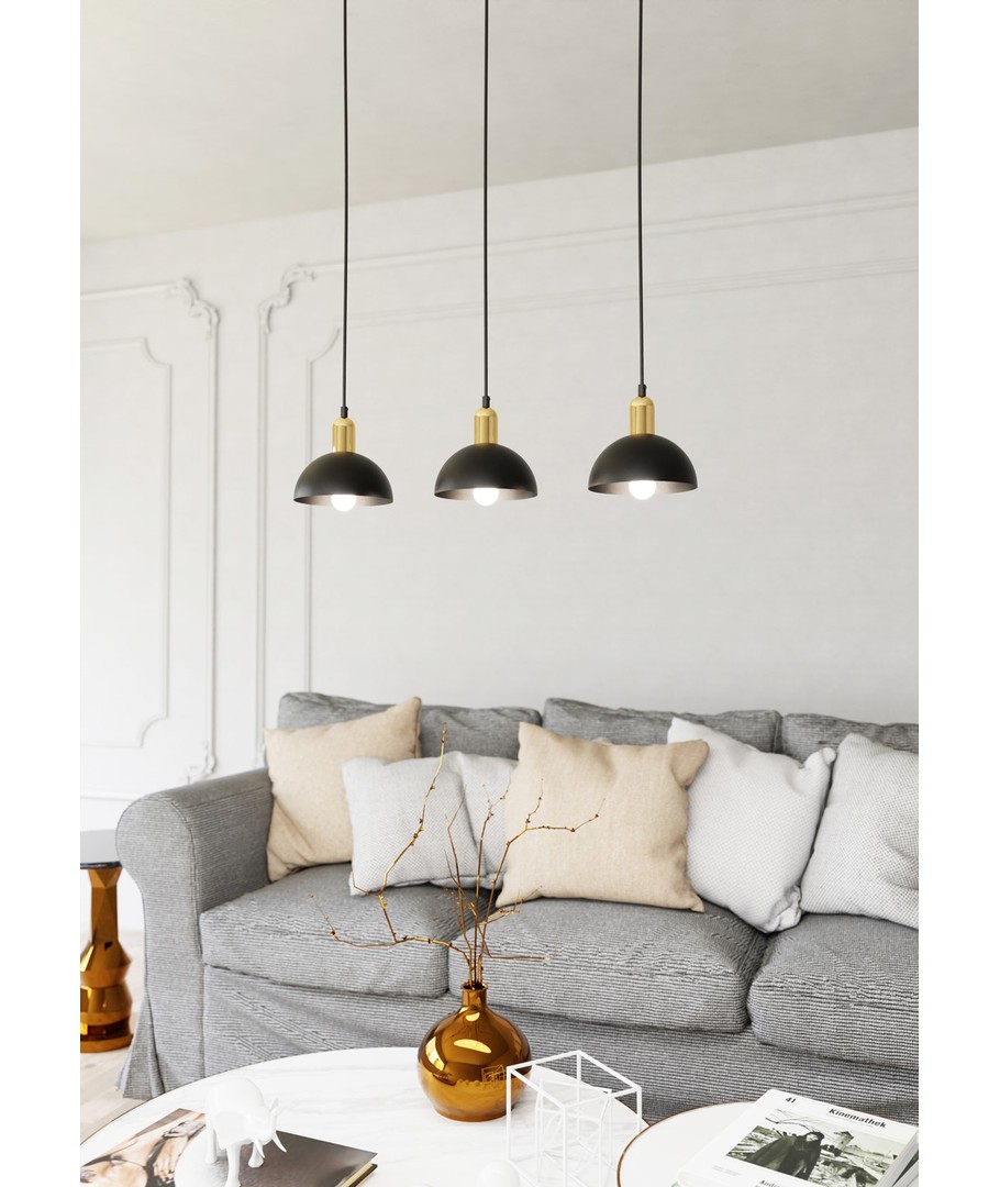 Den slanke formen og kombinasjonen av svart og gull gjør at denne pendellampen skiller seg ut, samtidig som den passer diskret inn i forskjellige interiørstiler. Med tre sokler sikrer den en jevn fordeling av lyset, noe som gjør den både praktisk og stilfull.