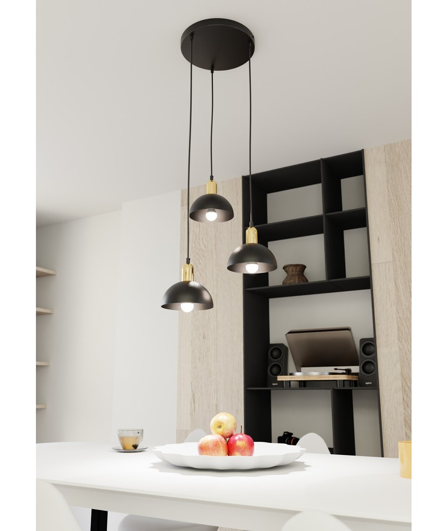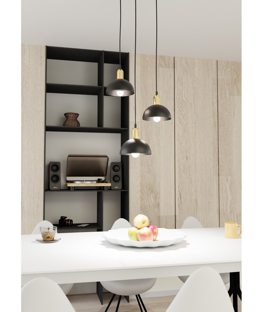 Moto 3 Sort Prem pendellampe kombinerer rått industrielt design med elegante detaljer. Med en metallskjerm som skaper en robust karakter, og en gulltopp som tilfører varme og sofistikert flair, er denne lampen et fremragende tilskudd til din innredning. Den er perfekt for å belyse stuen, spiseområdet eller kjøkkenøya og skaper en unik atmosfære og stilfull kontrast i rommet. Moto-lampen er det ideelle valget for dem som ønsker original belysning med et hint av eleganse.