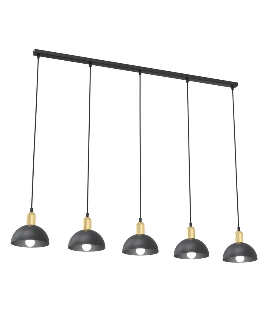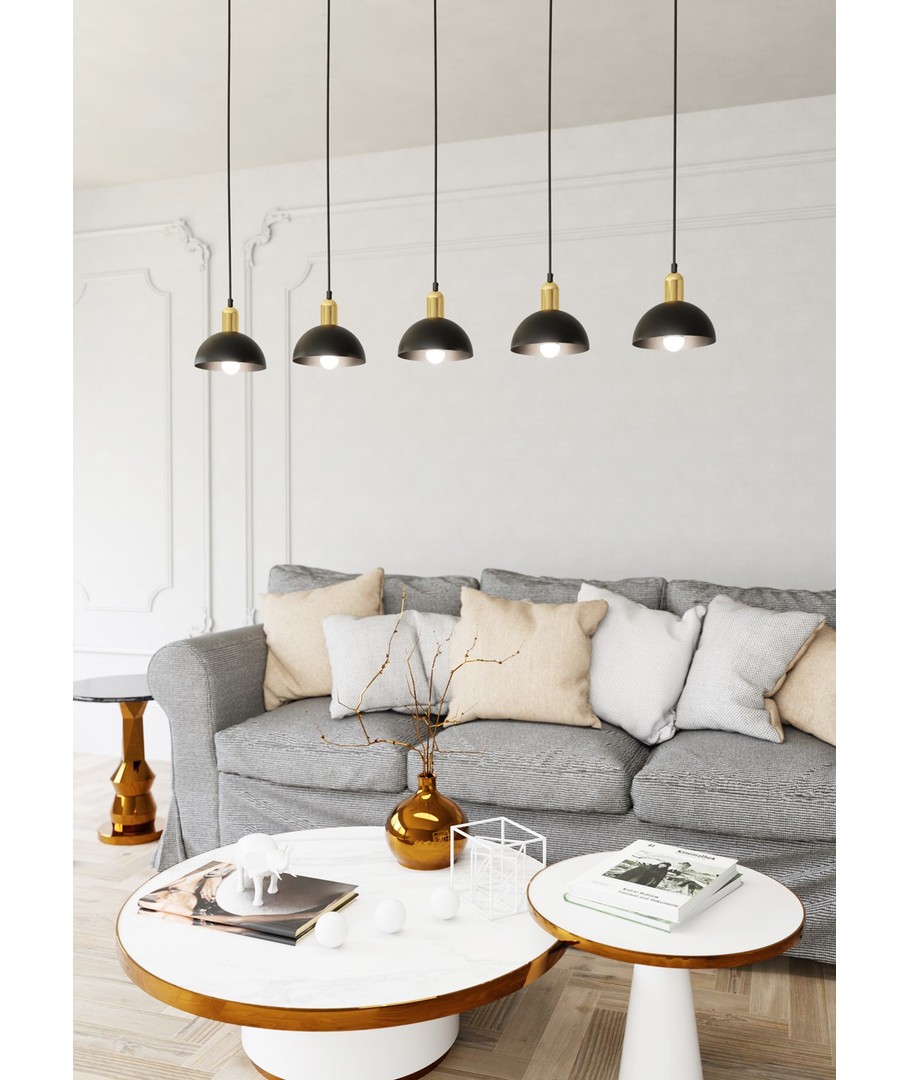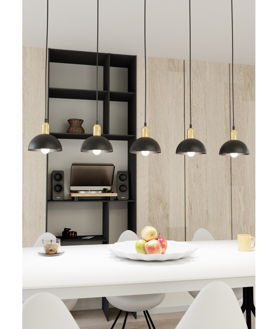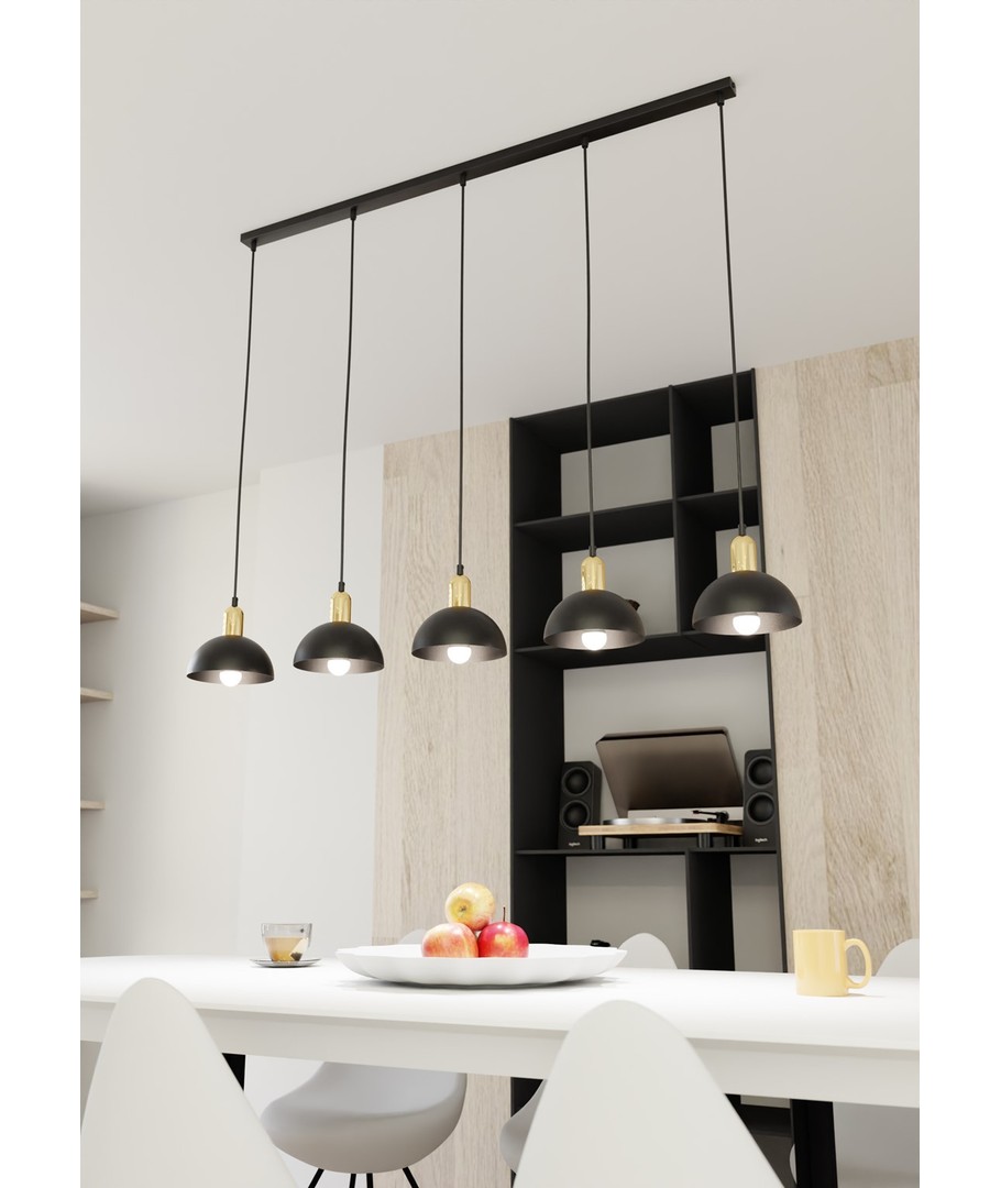 Opplev en fortryllende sammensmeltning av industrielt design og elegant stil med Moto 5 Sort pendellampe. Denne imponerende lampen har en metall lampeskjerm, som utstråler rå karakter, mens det gyldne elementet tilfører varme og raffinement. Perfekt for stuen, spisestuen eller over kjøkkenøya, der den skaper en unik atmosfære og stilfull kontrast. Moto lampen er det ideelle valget for dem som ønsker original belysning med et snev av eleganse.