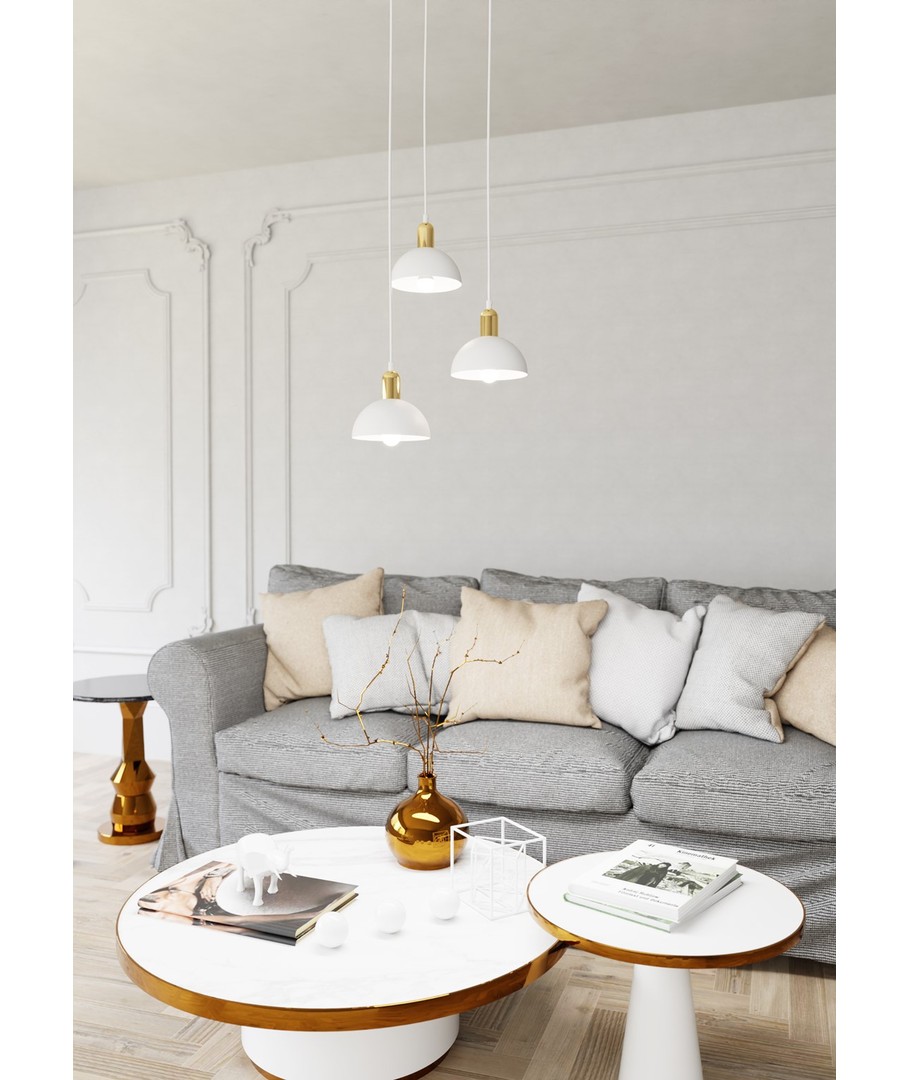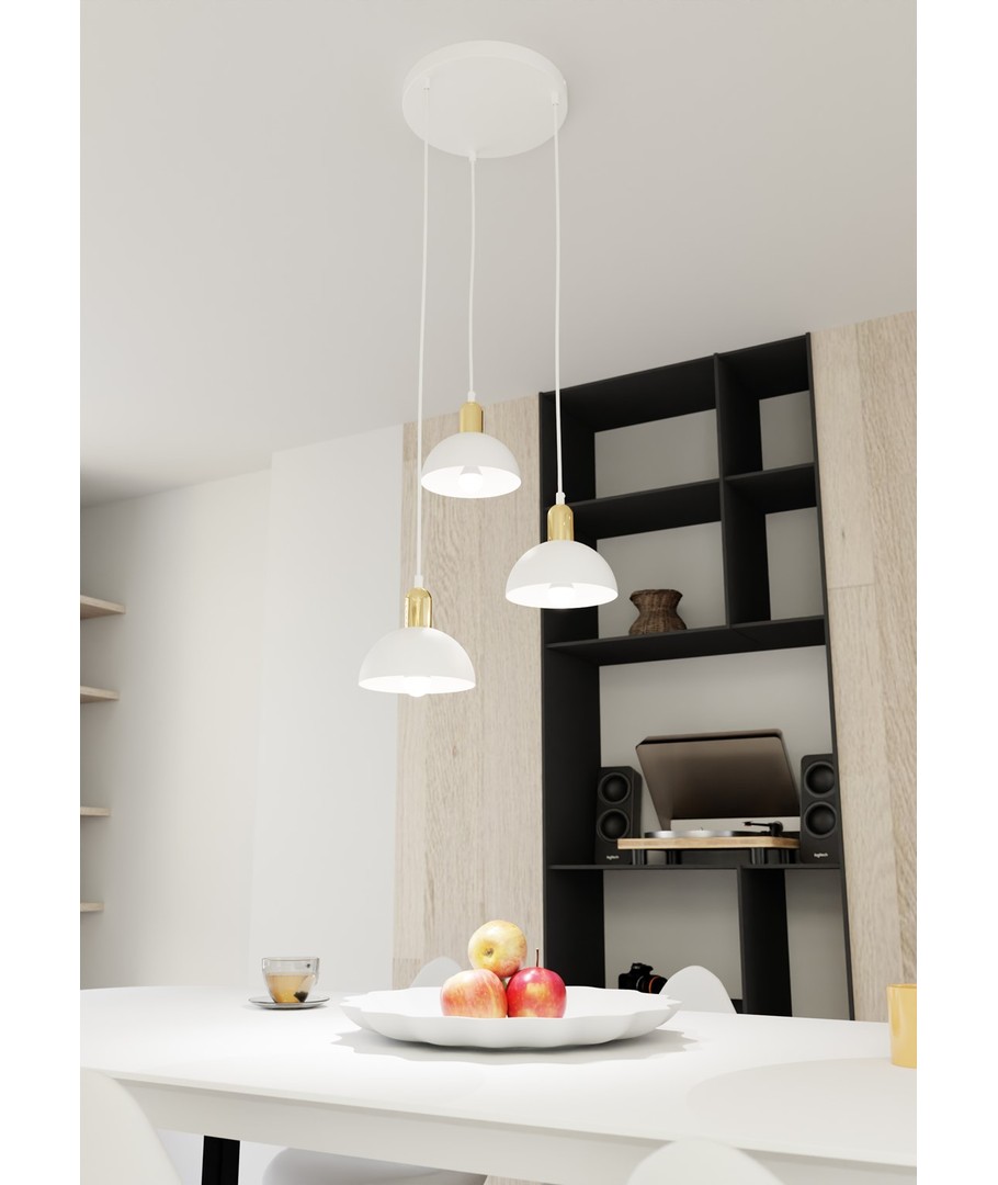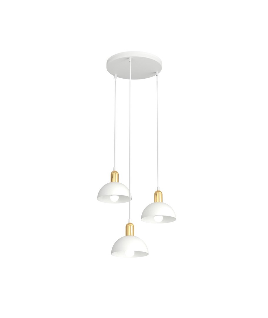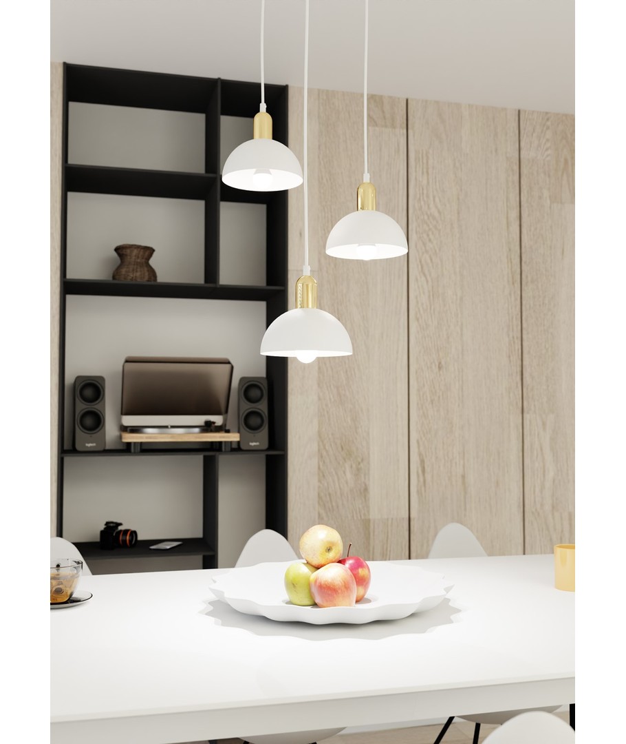 Moto 3 Hvit Prem pendellampe er en elegant kombinasjon av industrielt og klassisk design. Med sin metall lampeskjerm og gyldne detaljer tilfører den både en rå og raffinert sjarm til ethvert rom. Denne taklampen er ideell for stuen, spisestuen eller over kjøkkenøya, hvor den skaper en unik atmosfære og stilfull kontrast. Moto-lampen er perfekt for dem som ønsker en original belysningsløsning med en fin estetisk kant.