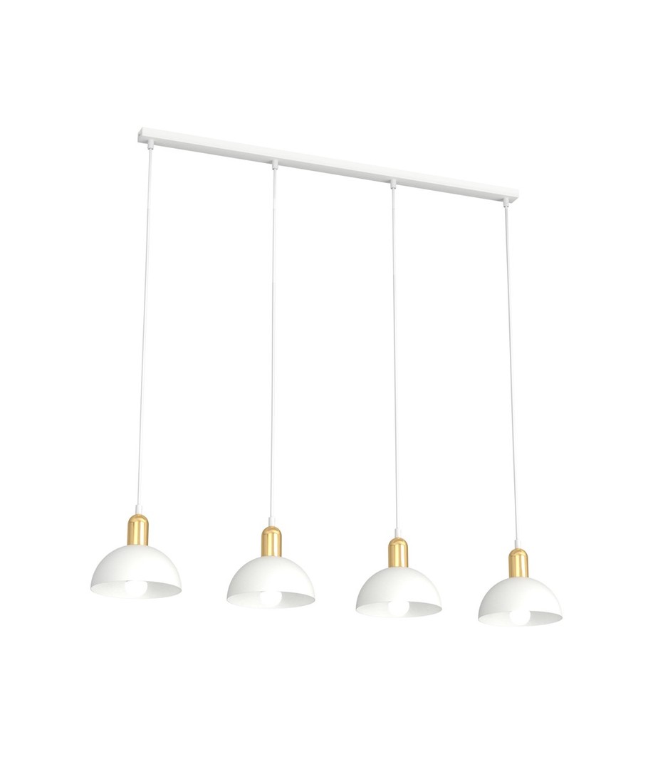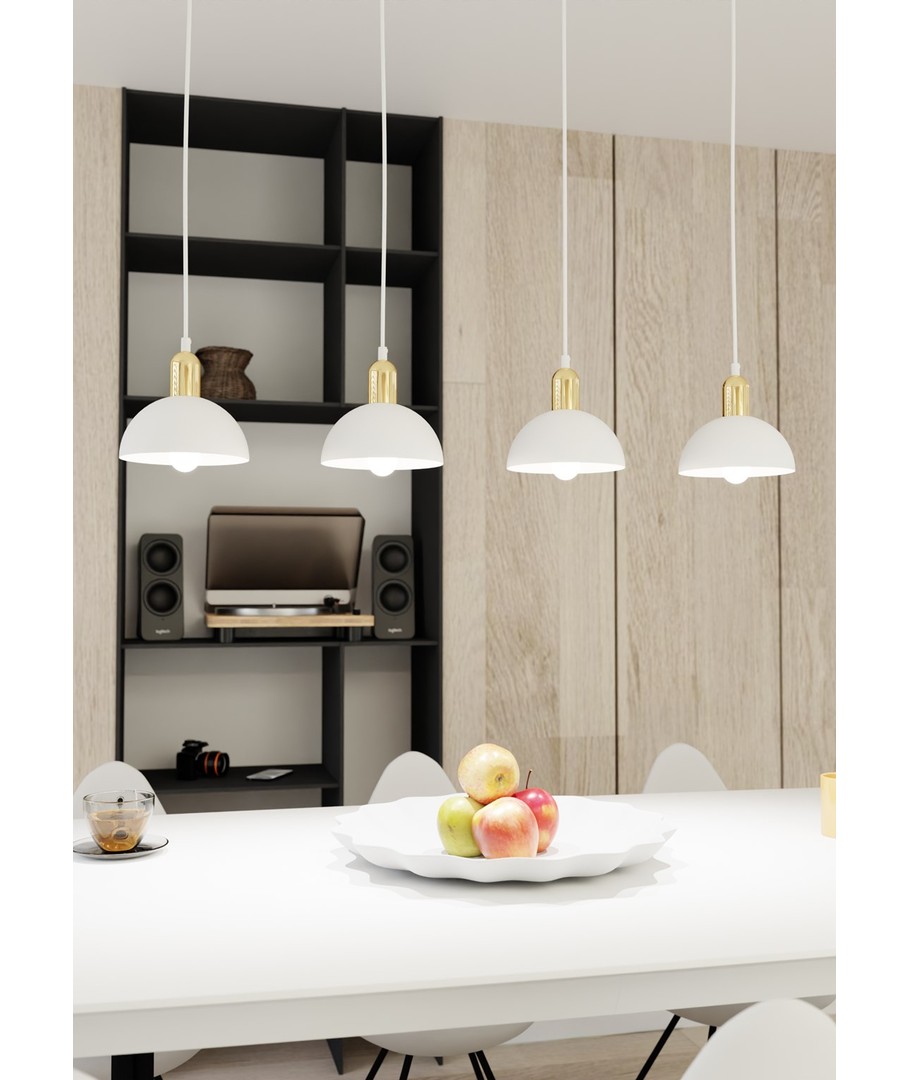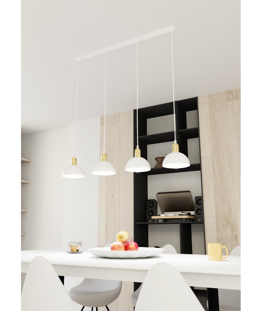 Moto 4 Hvit pendellampe er en sofistikert belysningsløsning som balanserer industrielt design med en elegant finish. Metalls kjermen gir et rått uttrykk, mens den gyldne toppen tilfører varme og subtil eleganse. Denne lampen er perfekt for stuer, spiseområder eller over kjøkkenøyer, hvor den skaper en unik atmosfære og et stilfullt kontrastspill. Moto lampen henvender seg til dem som ønsker original belysning med finesse.