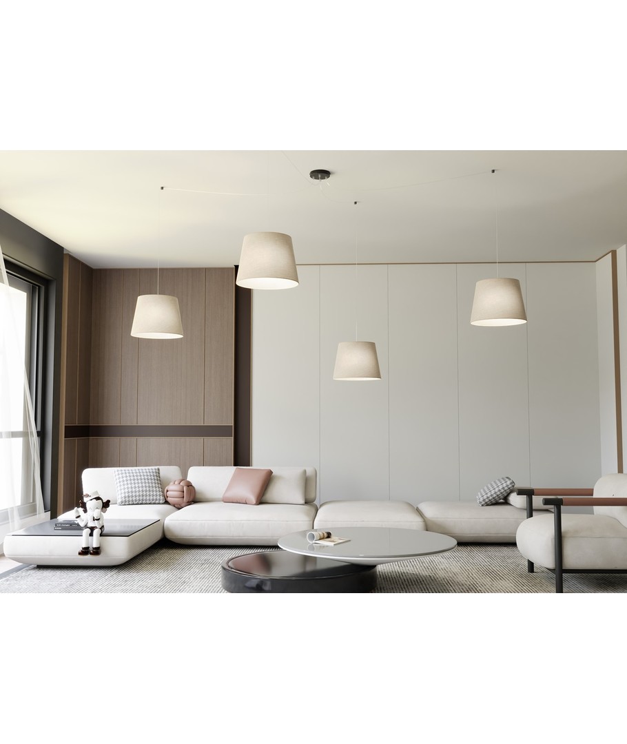 Ascot 4 Beige pendellampe er et vakkert eksempel på minimalistisk design som kombinerer enkelhet med moderne stil. Den subtile beige stoffskjermen utsender et behagelig, diffust lys som skaper en varm atmosfære i ethvert rom. Denne lampen er ideell for stuer, spiseområder eller kjøkken og passer perfekt inn i forskjellige innredningsstiler. Ascot-lampen er et fremragende valg for dem som verdsetter estetikk og funksjonalitet i sine belysningsløsninger. Den stilfulle karakteren gjør den til en nødvendighet i moderne hjem.