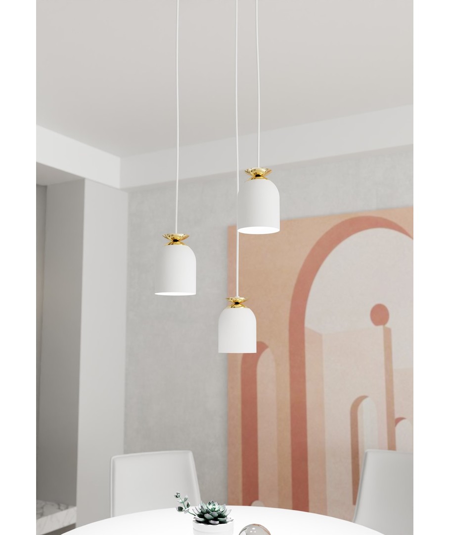 Lampens justerbare høyde gjør det enkelt å tilpasse den til ditt rom, og den passer perfekt til en moderne innredning. Den slående kombinasjonen av hvitt og gyldne detaljer gjør denne lampen til et elegant valg som forbedrer enhver innredning.