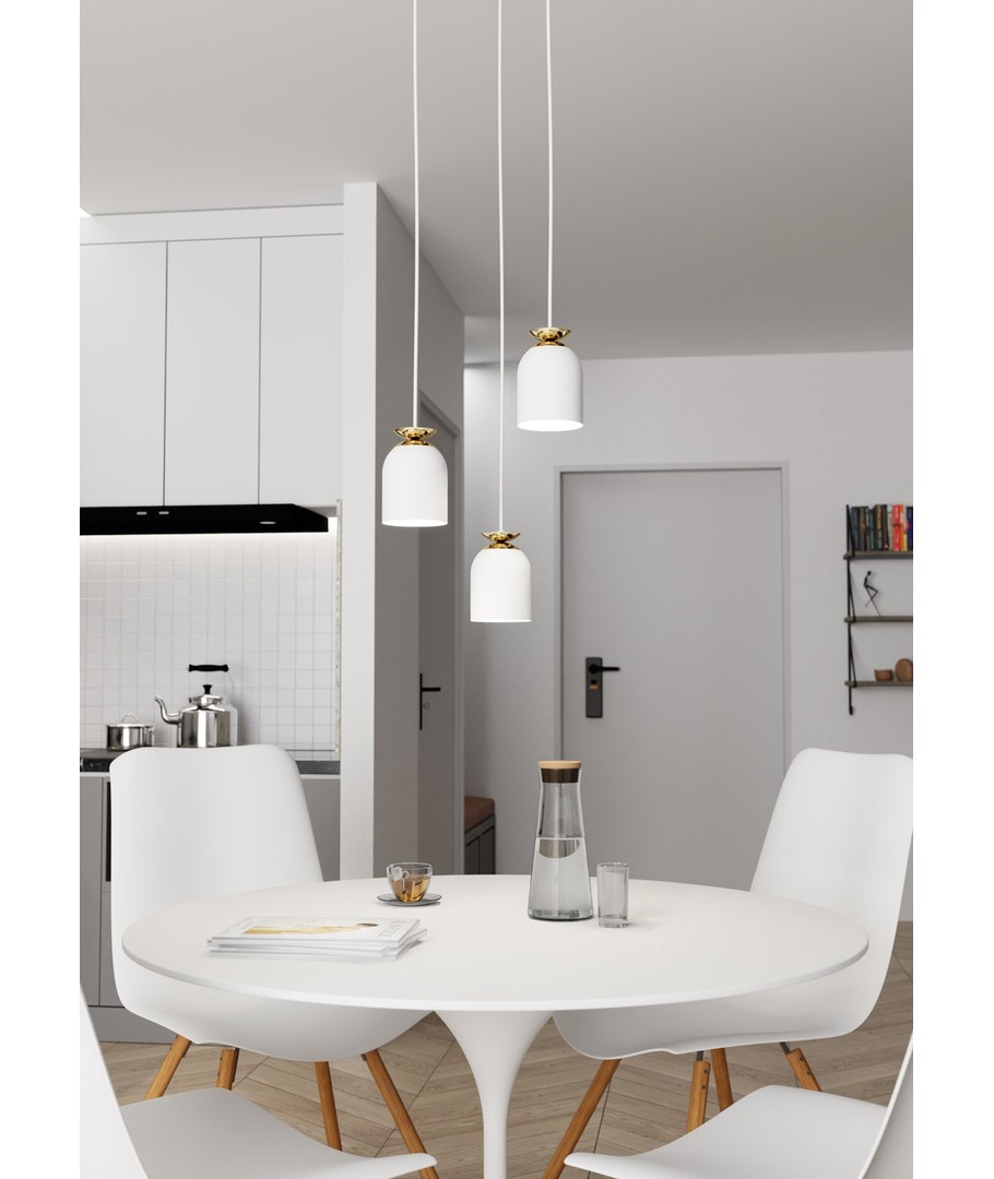 Viktige funksjoner:Den hvite finishen gir en tidløs eleganse, samtidig som den sikrer at lampen lett kan integreres med eksisterende fargeskjemaer i hjemmet. Enten du vil belyse et spisebord eller et leseområde, gir denne pendellampen et konsentrert, men likevel behagelig lys.