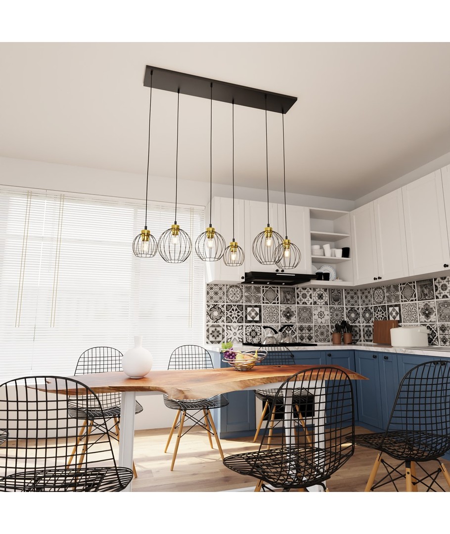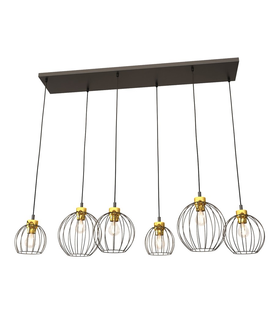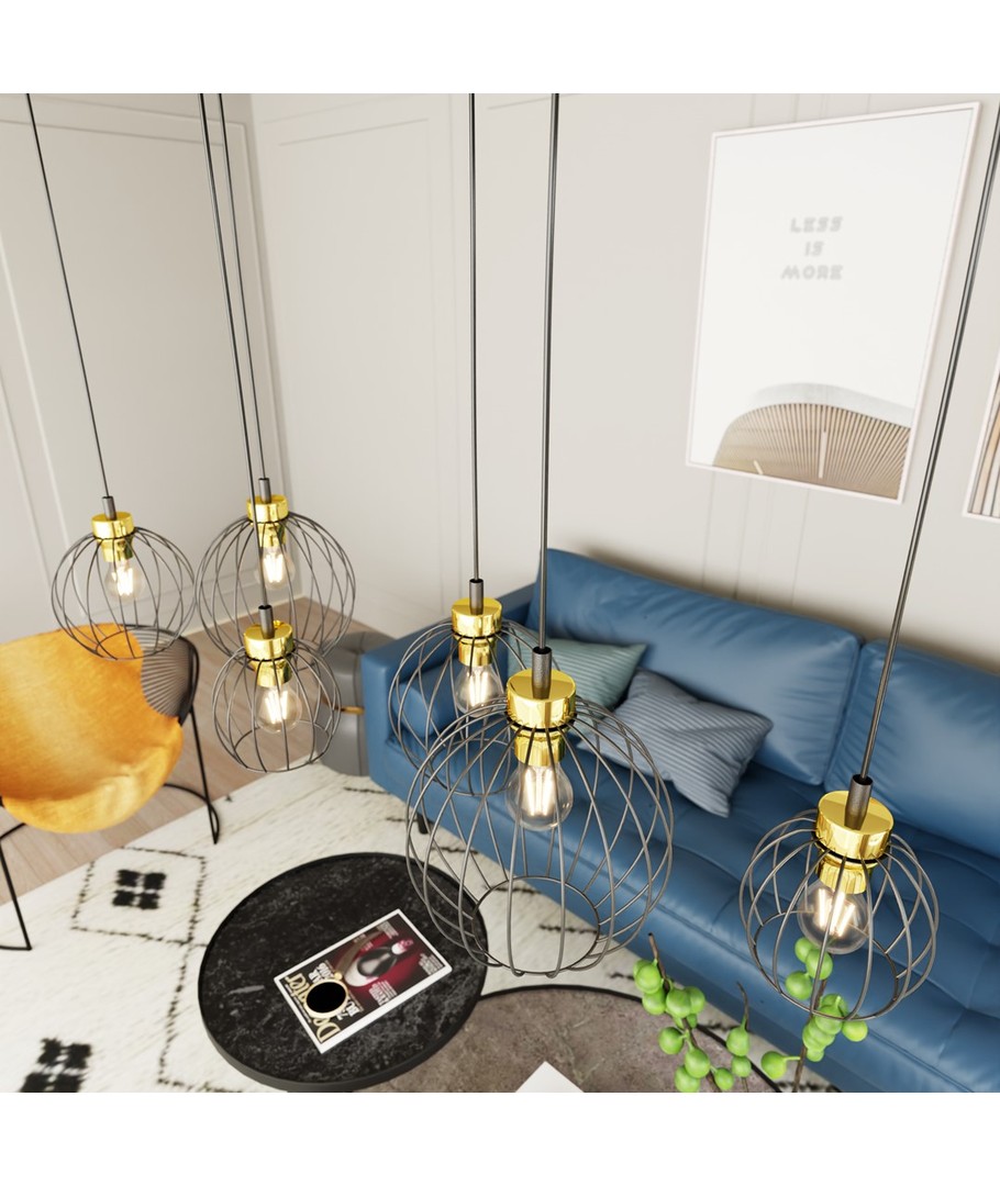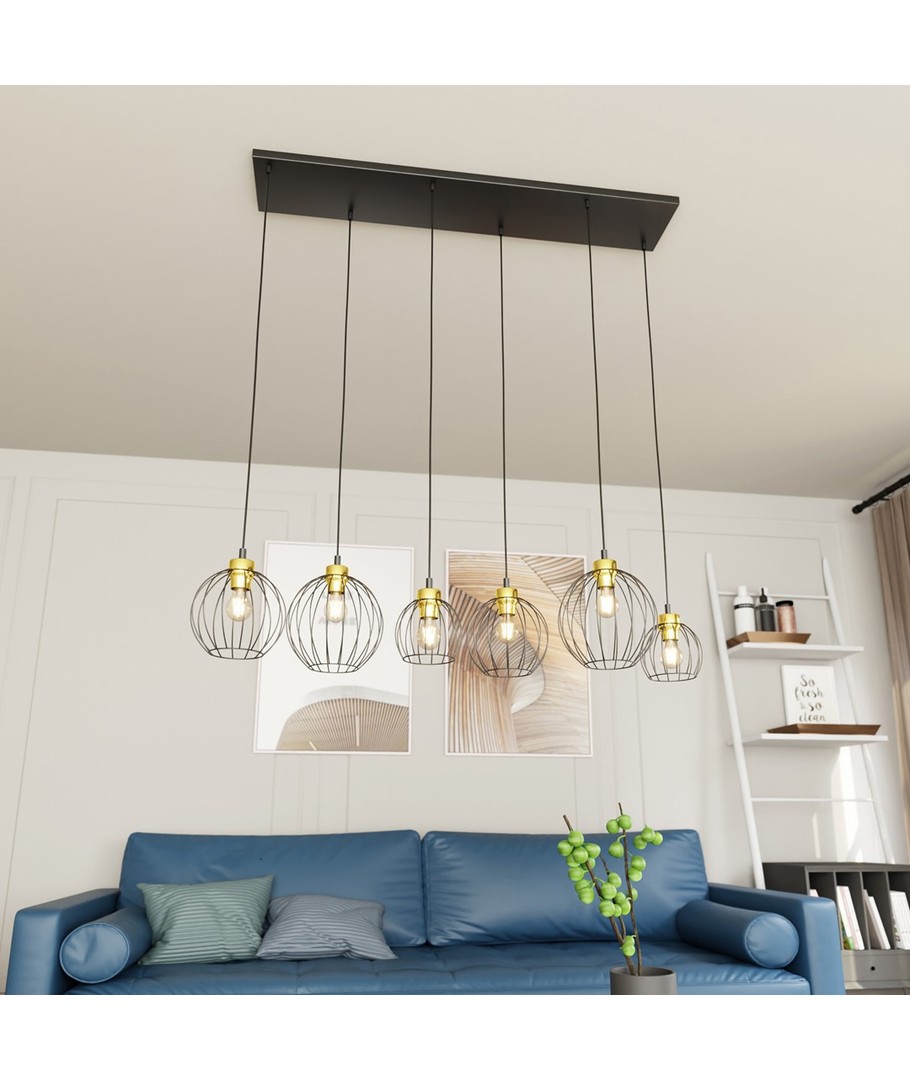 Nando 6 Sort/Gull pendellampe er en moderne tolkning av den rå loftstilen, som bringer et industrielt preg til ditt hjem. Lampen er laget av solid pulverlakkert stål, og de trådflettede lampeskjermene skaper interessante lyseffekter som gir originalitet til ethvert rom. Med sine justerbare høyder er den perfekt for både stue, spisestue og kjøkken, hvor den gir en unik atmosfære og stil. Det stilige designet i sort og gull gjør lampen til et markant element som fremhever og komplimenterer innredningen i hjemmet.