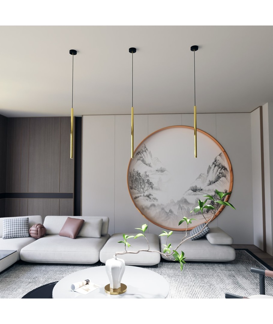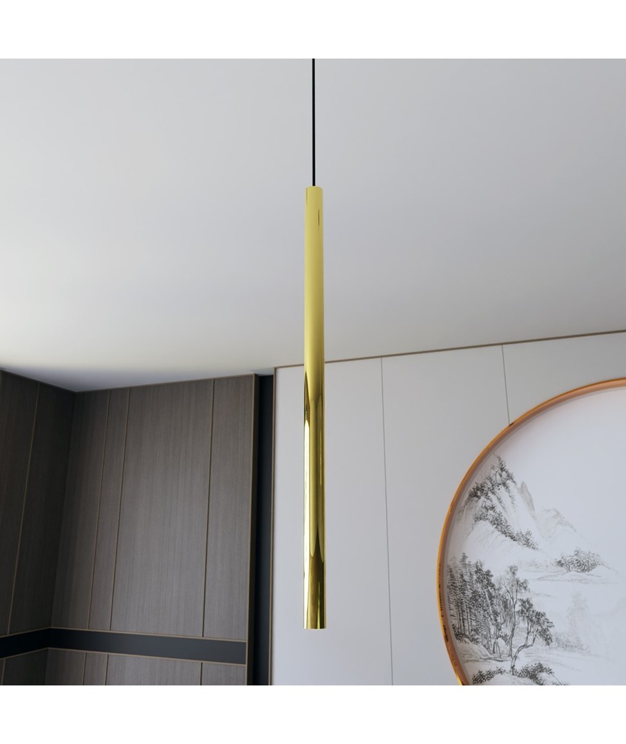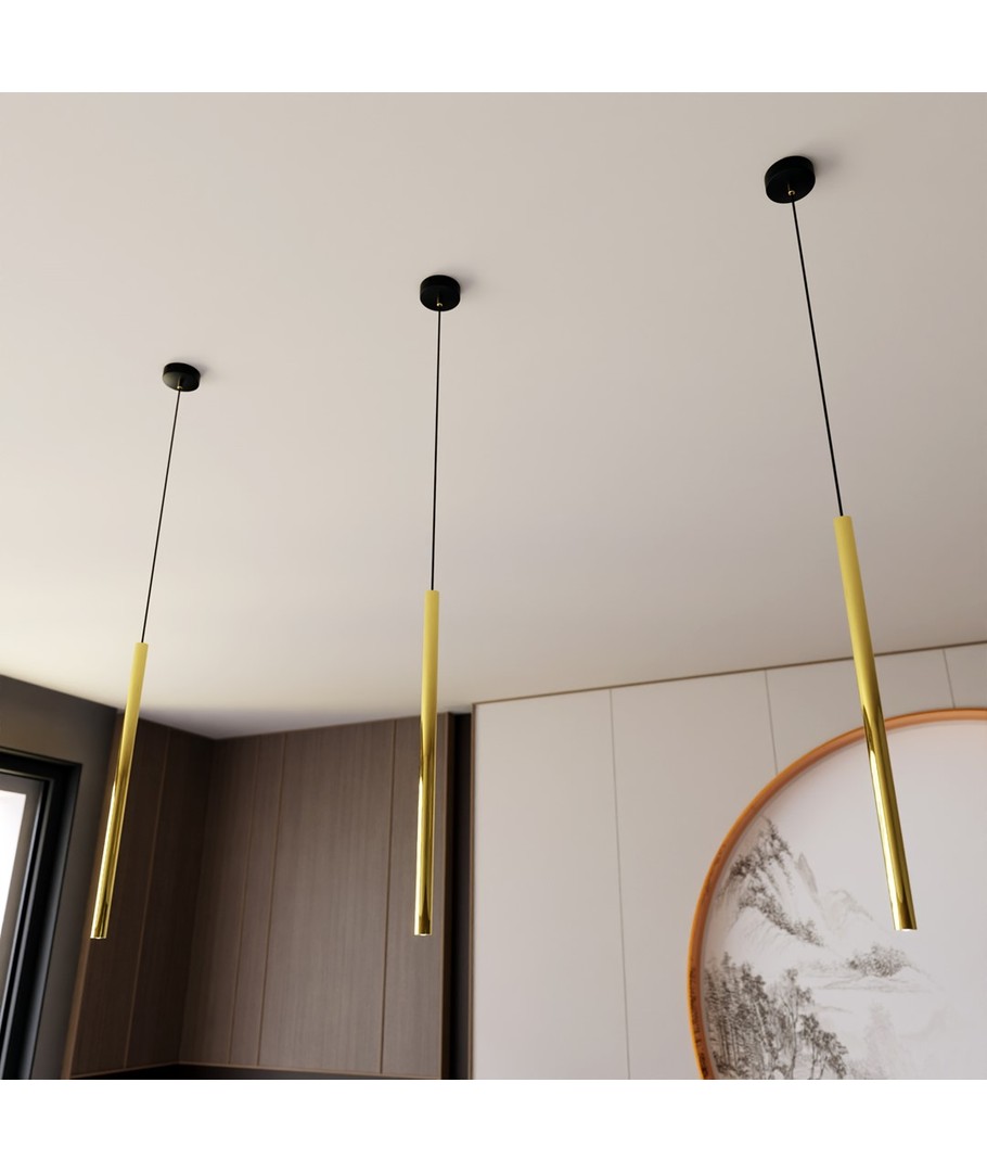Spesifikasjoner:Lampens slanke form med en diameter på bare 2 cm gjør den til et smakfullt valg for de som ønsker et minimalistisk uttrykk. Den gyldne finishen tilfører et snev av luksus, og passer perfekt over kjøkkenøya, spisestuebordet eller i gangen som et iøynefallende kunstverk.