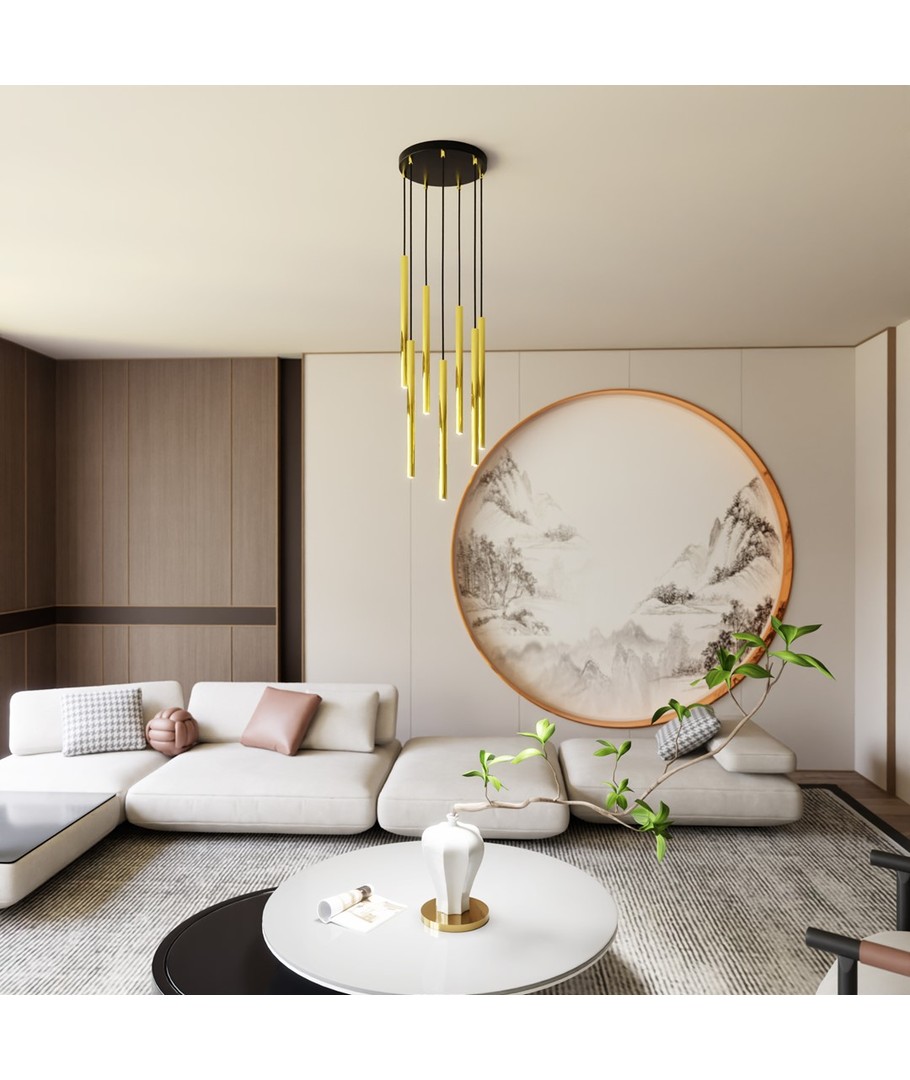 Opplev tidløs eleganse med Selter 7 Premium Gull pendellampe, som bringer en unik kombinasjon av glamour og moderne design inn i ditt hjem. Denne eksklusive lampen prydes av gylne rør, som skaper en elegant struktur og gir den et unikt skinn. Ikke bare en lyskilde, men også en luksuriøs dekorasjon som tilfører sofistikert sjarm og subtil glamour til ethvert rom. Selter-serien er det ideelle valget for dem som ønsker å integrere raffinert eleganse i sin innredning.