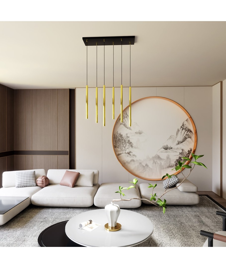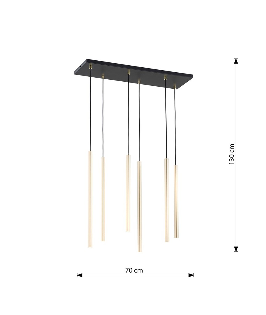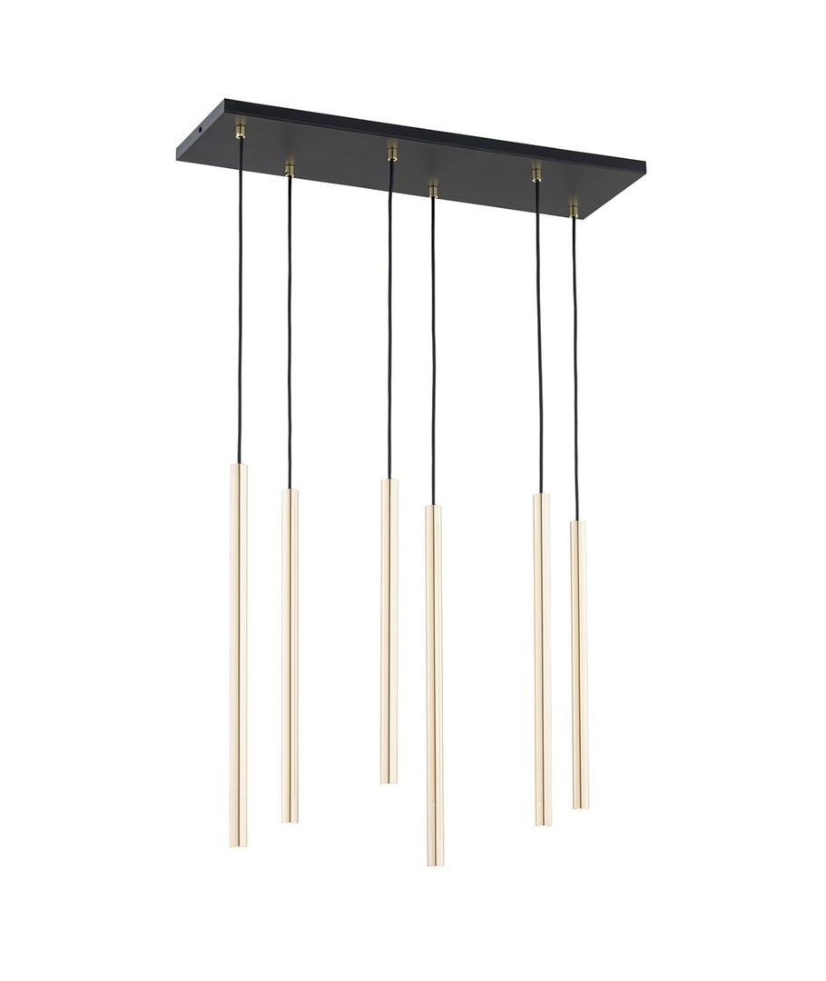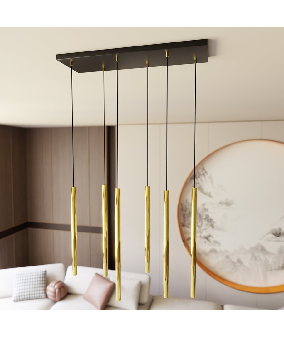 Oppgrader innredningen din med Selter 6 Gull pendellampe, som med sin kombinasjon av glamour og moderne design tilfører et raffinert preg til hjemmet ditt. De gylne rørene skaper ikke bare en kilde av lys, men også et luksuriøst element som fanger øyet og tilfører eleganse i ethvert rom. Denne lampen er den perfekte løsningen hvis du ønsker å tilføre diskret glans og subtil sjarm til innredningen din.