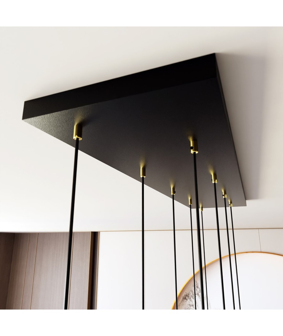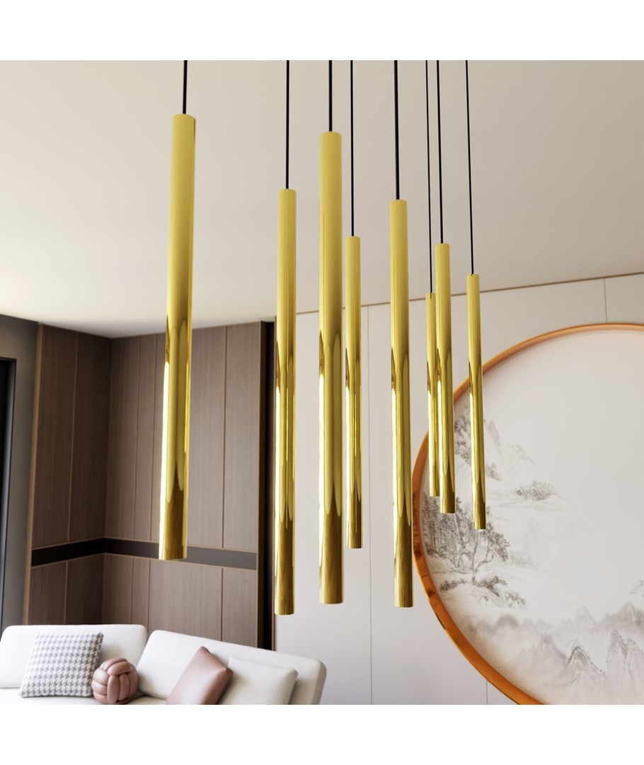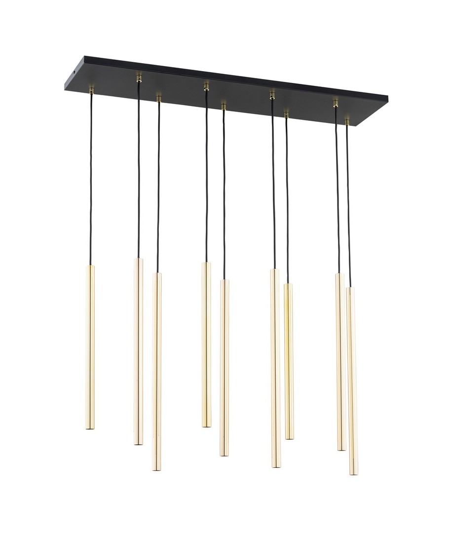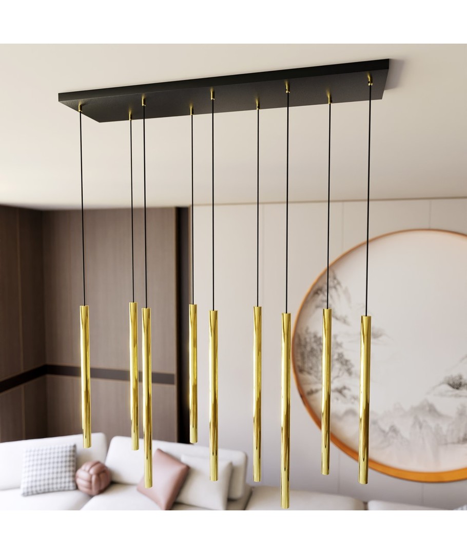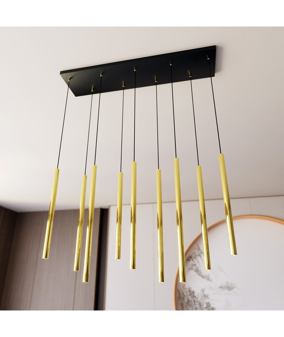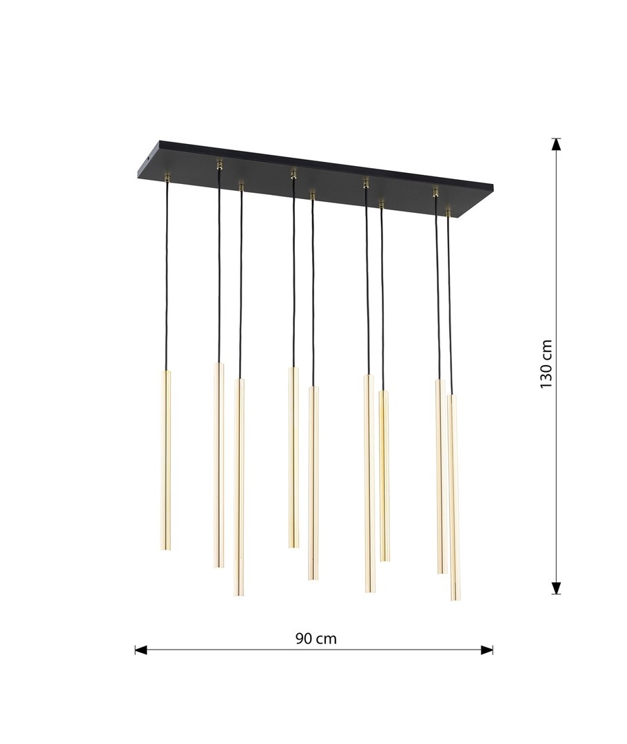 Selter 9 Gull pendellampe er det perfekte valget for dem som ønsker å legge til både klasse og moderne stil til sitt hjem. Med sine gyldne rør som elegant henger fra en sort ramme, bringer denne lampen ikke bare lys til ditt rom, men også en følelse av glamour og raffinement. Det unike designet fungerer som et luksuriøst fokuspunkt, som forvandler enhver stue eller spiseområde til en stilfull oase. Selter-serien er ideell for dem som ønsker et snev av subtil eleganse og tidløs skjønnhet.