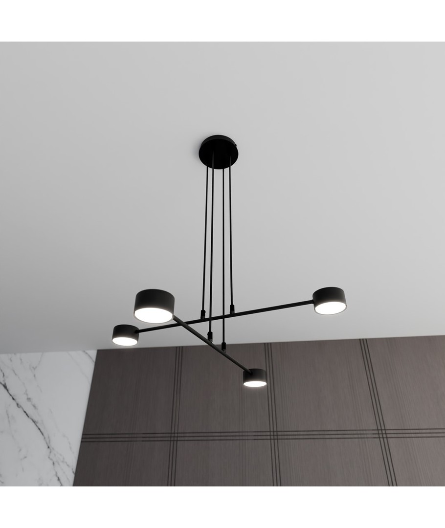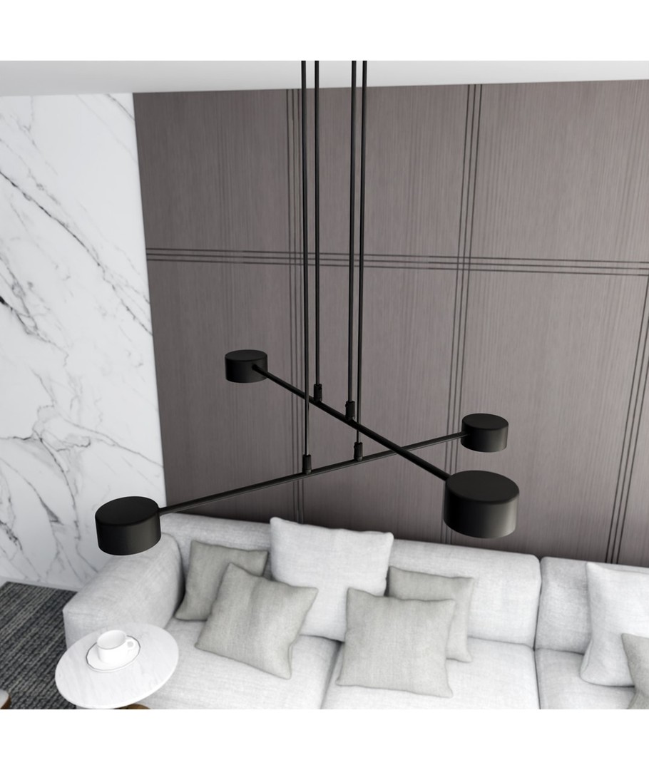 Modus 4 Sort pendellampe kombinerer minimalistisk design med skandinavisk estetikk. Med sin gjennomtenkte konstruksjon og kryssende armer skaper den en unik og harmonisk innredning, som passer perfekt inn i det skandinaviske stiluniverset. Denne lampen utstråler enkelhet og eleganse og fungerer både som belysning og en diskret dekorativ detalj, som tilfører ro og modernitet til rommet ditt. Enten den henger i stuen eller over spisebordet, vil Modus pendellampe tilføre et snev av stilfull klasse.