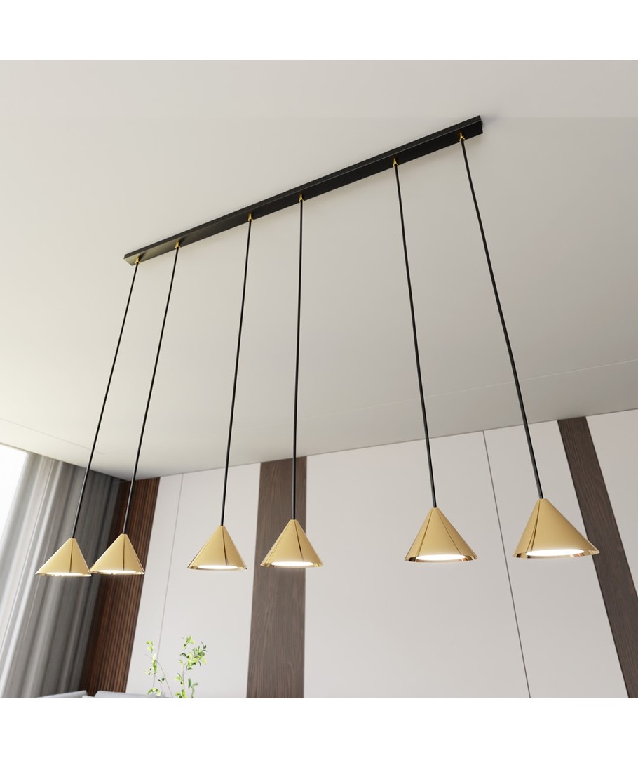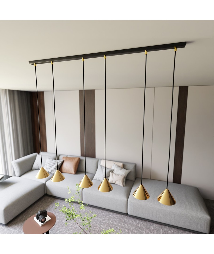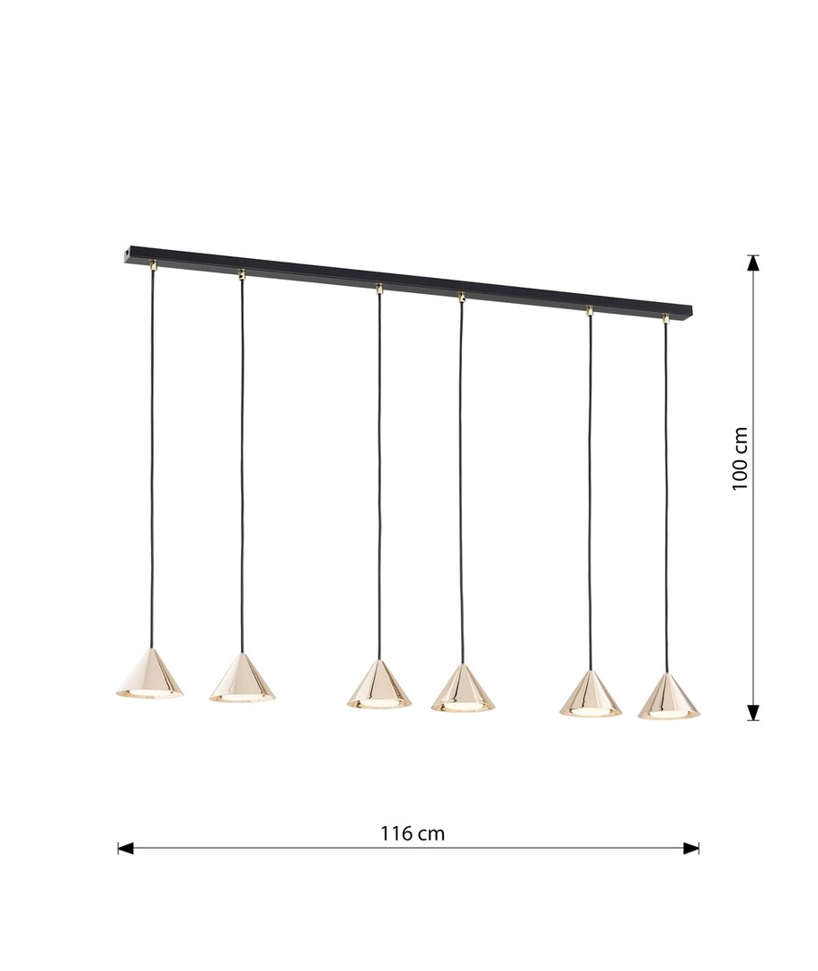 Elit 6 Sort/Gull pendellampe kombinerer moderne stil med utsøkt eleganse. Med sine gullfargede, kjegleformede skjermer tilfører lampen et minimalistisk preg som passer perfekt til dagens interiørtrender. Denne pendellampen belyser ikke bare rommet ditt, men fungerer også som et designelement som gir et luksuriøst preg. Den universelle utformingen sikrer at lampen glir ubesværet inn i mange forskjellige interiørstiler, og tilfører dermed en unik karakter. Elit-serien forener funksjonalitet og estetikk, og fremhever det distinkte uttrykket i enhver stue.