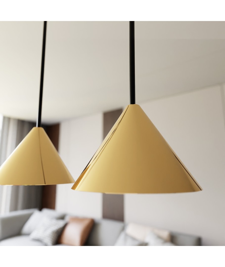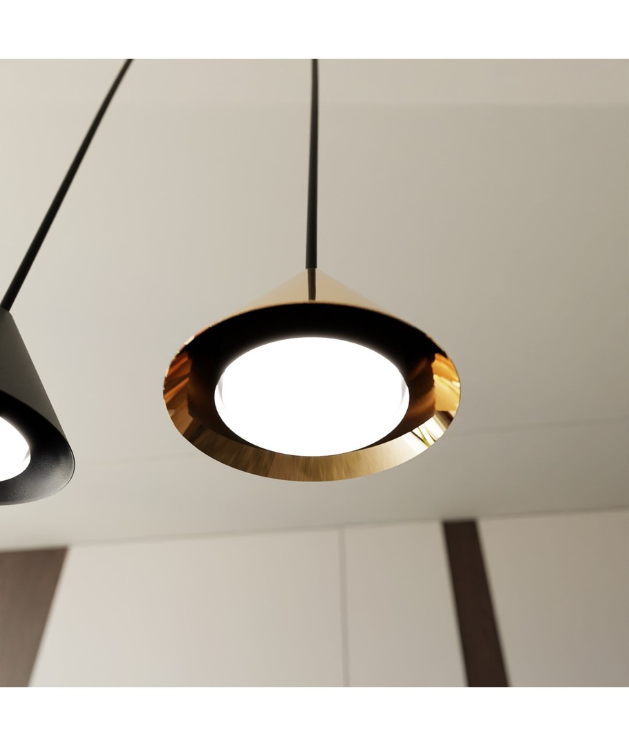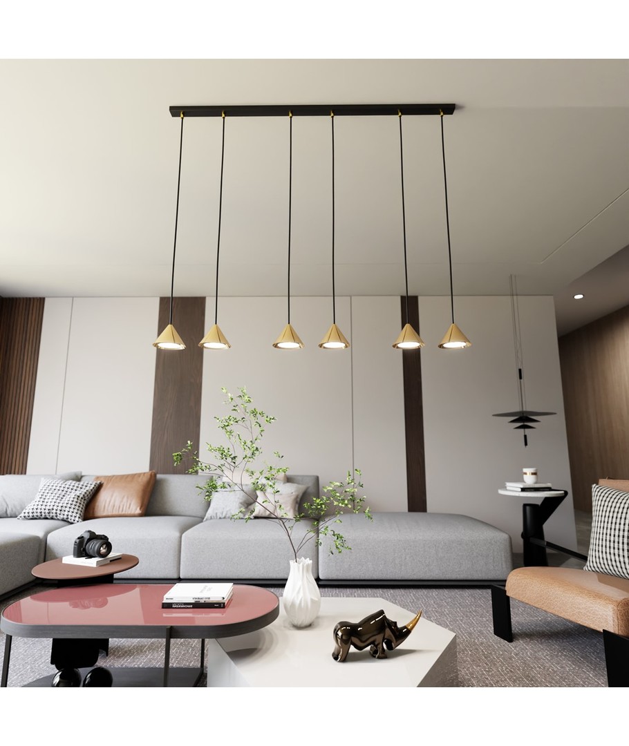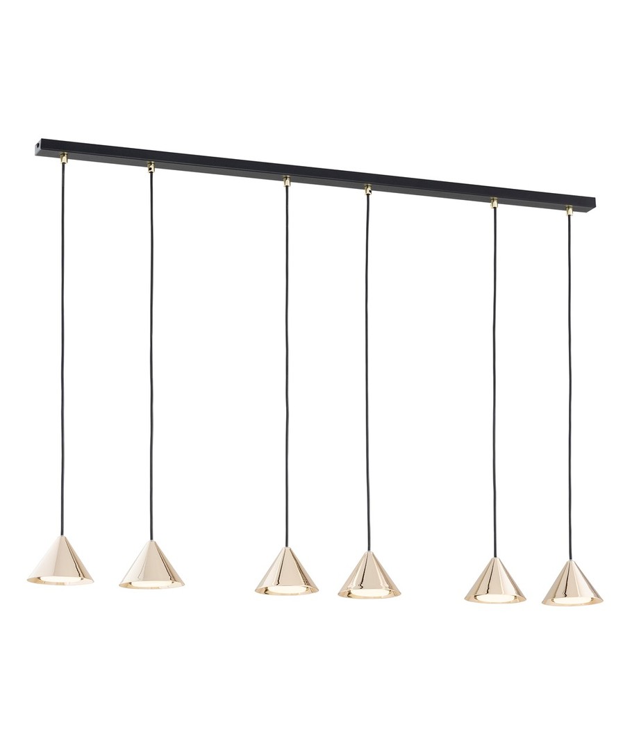 Elit 6 Sort/Gull pendellampe kombinerer moderne stil med utsøkt eleganse. Med sine gullfargede, kjegleformede skjermer tilfører lampen et minimalistisk preg som passer perfekt til dagens interiørtrender. Denne pendellampen belyser ikke bare rommet ditt, men fungerer også som et designelement som gir et luksuriøst preg. Den universelle utformingen sikrer at lampen glir ubesværet inn i mange forskjellige interiørstiler, og tilfører dermed en unik karakter. Elit-serien forener funksjonalitet og estetikk, og fremhever det distinkte uttrykket i enhver stue.
