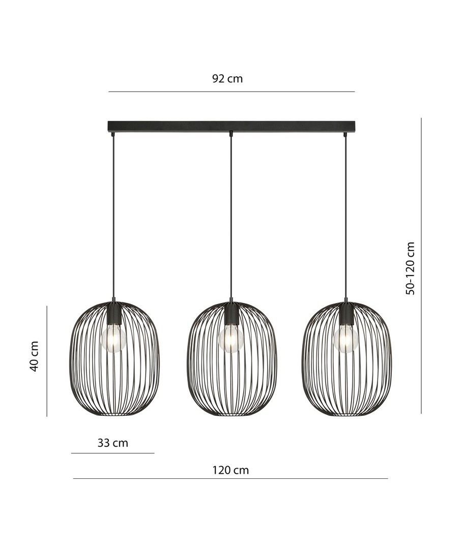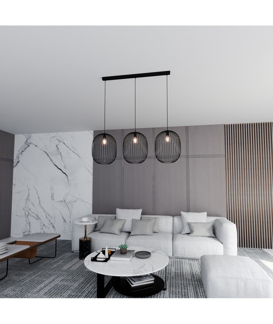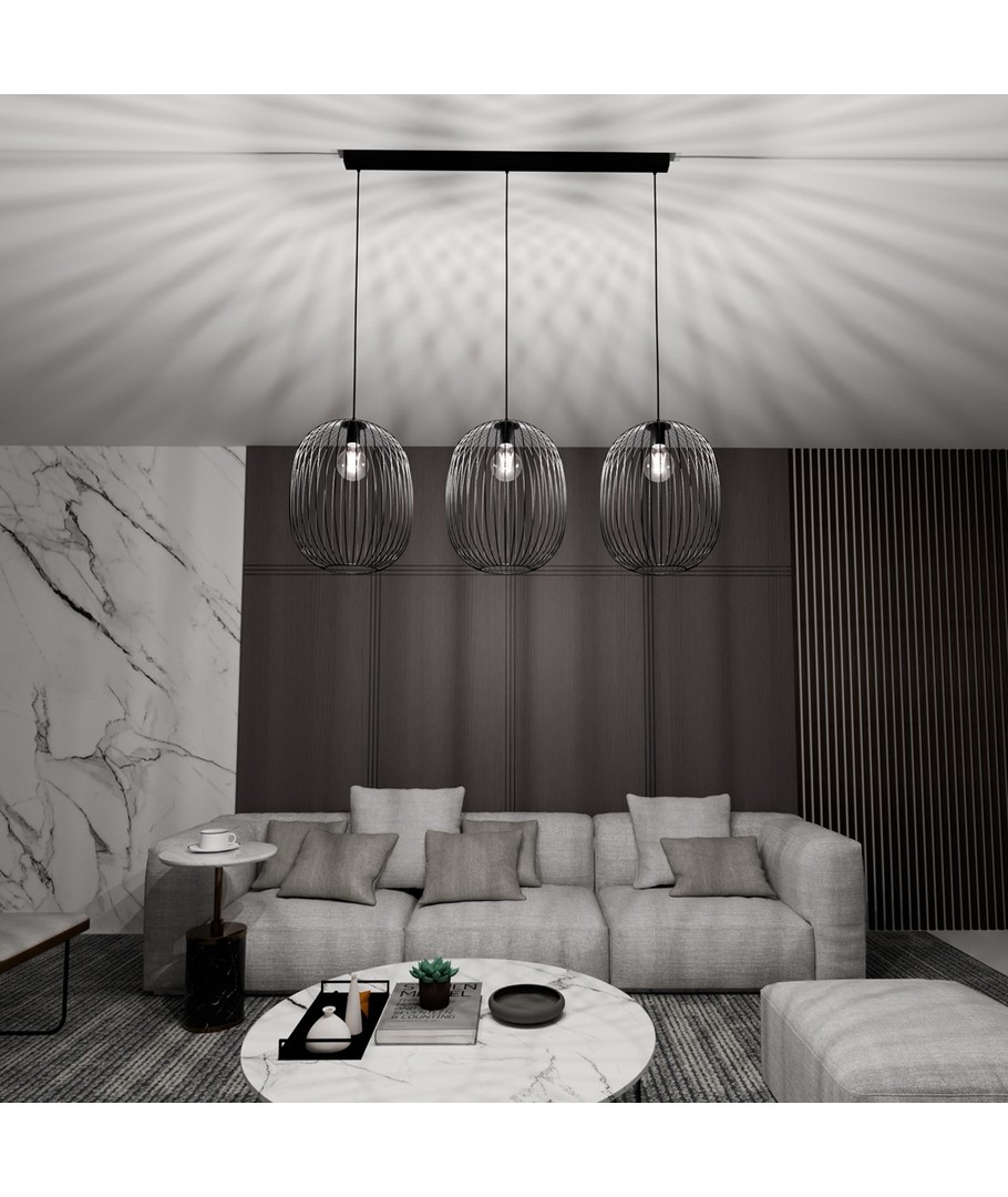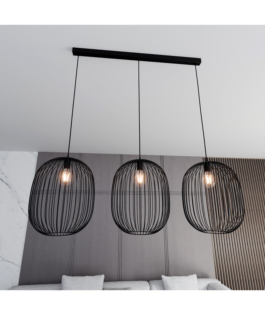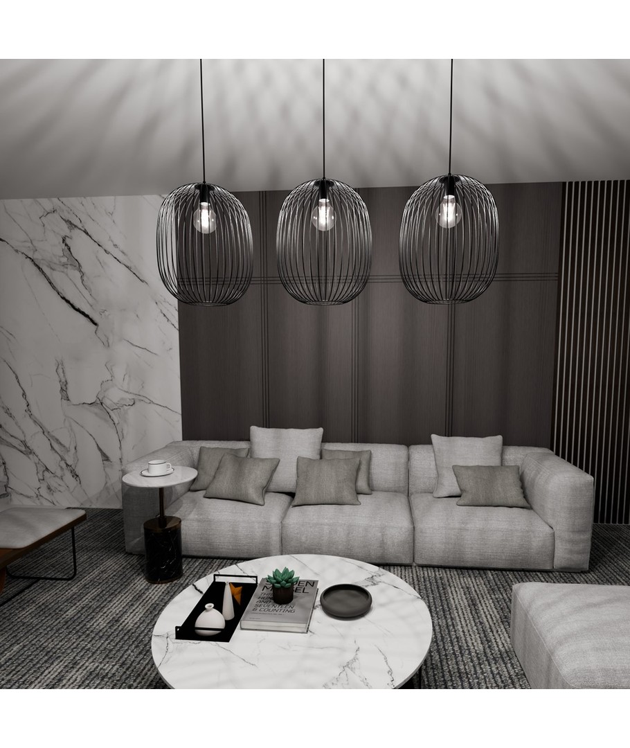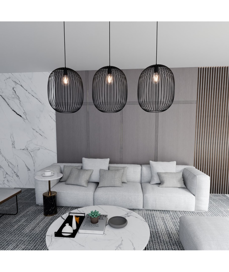 Gi interiøret ditt karakter med Onyx 3 svart pendellampe. Denne pendelen er laget av holdbart, pulverlakkert stål og kombinerer et minimalistisk og industrielt design. Den store, ovale trådrede lampeskjermen i svart gir lampen en rå sjarm, samtidig som den skaper unike lyseffekter. Onyx-lampen passer perfekt inn i trenden med industrielt design og tilfører en følelse av råhet og modernitet til rommet ditt. Den er et utmerket valg for dem som søker en utradisjonell belysning som både er funksjonell og stilfull.