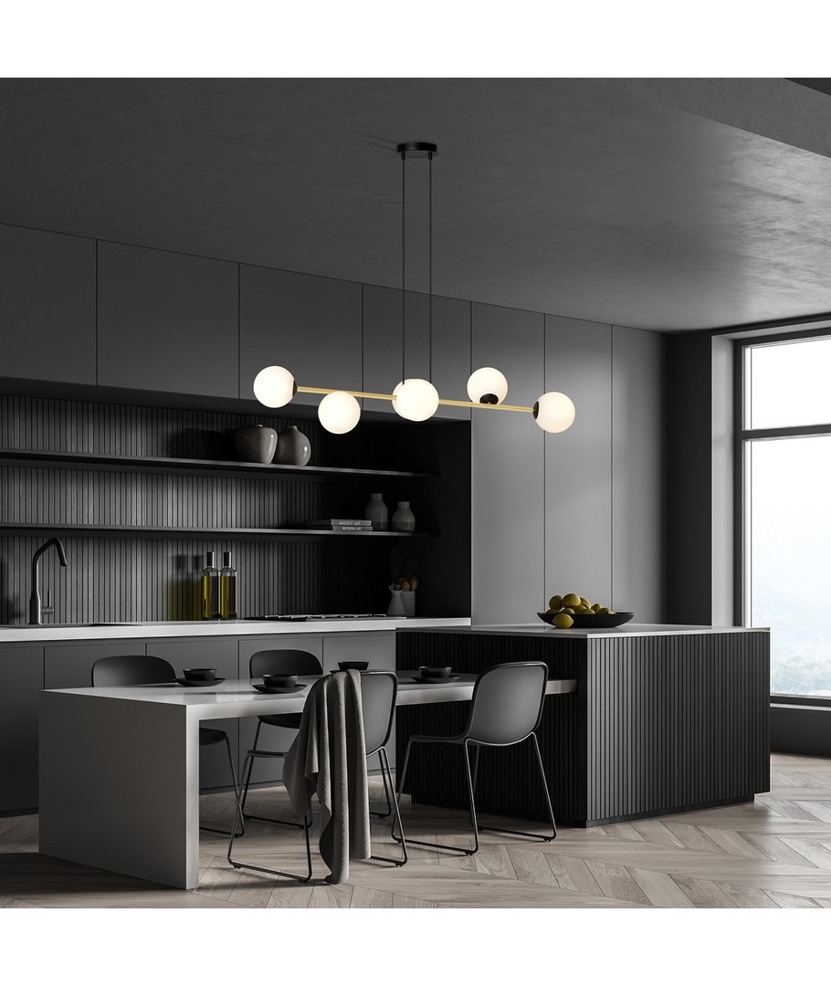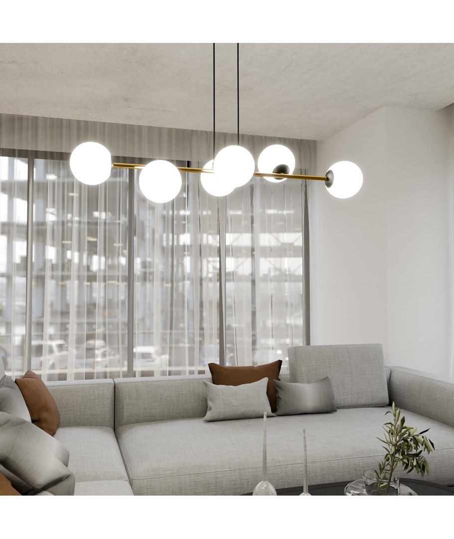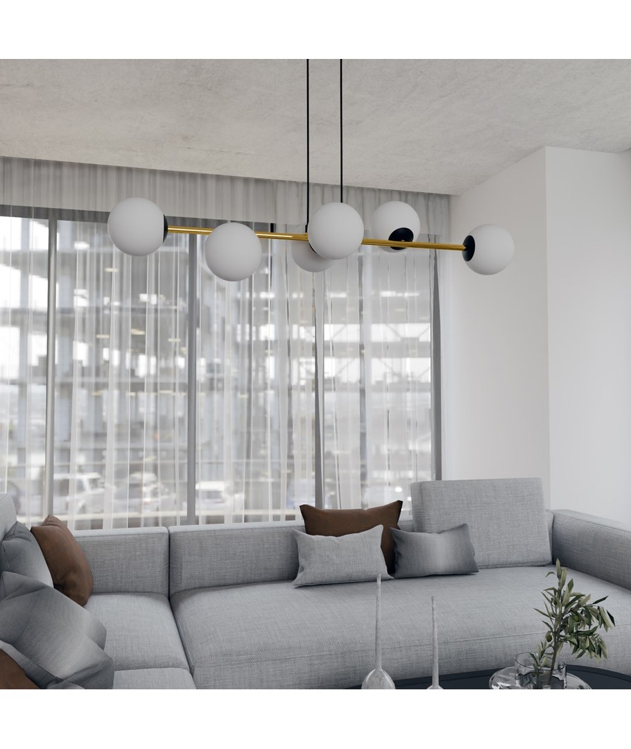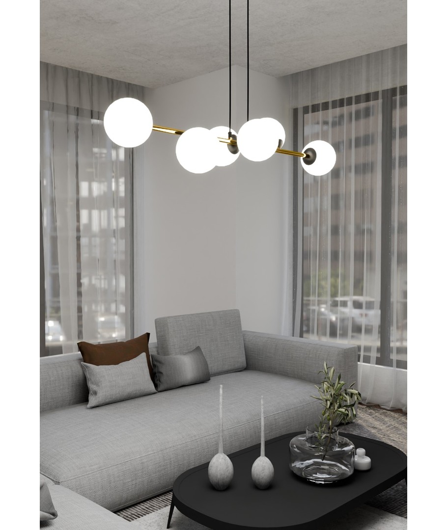 Gravity 6 Sort/Opal pendellampe er en sofistikert kombinasjon av minimalistisk design og glamorøse gulldetaljer. Denne pendellampen tilfører et snev av eleganse til både moderne og klassiske interiører. Med sine nøye utvalgte materialer sikrer Gravity-lampen både holdbarhet og et tidløst, elegant utseende. De gylne aksentene står i flott kontrast til lampens enkle form, noe som gir rommet en forfriskende glød og liv. Denne lampen er perfekt for å skape en spesiell atmosfære som kombinerer stil og funksjonalitet.