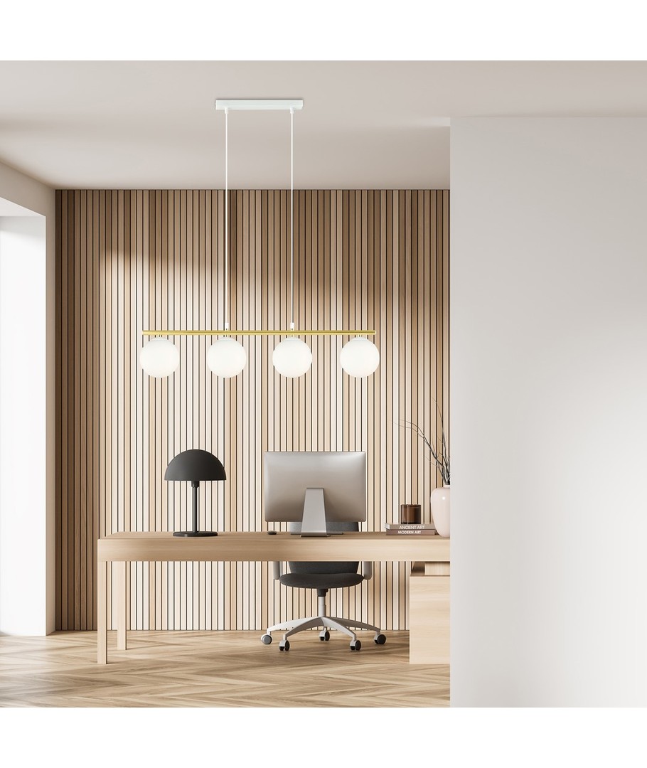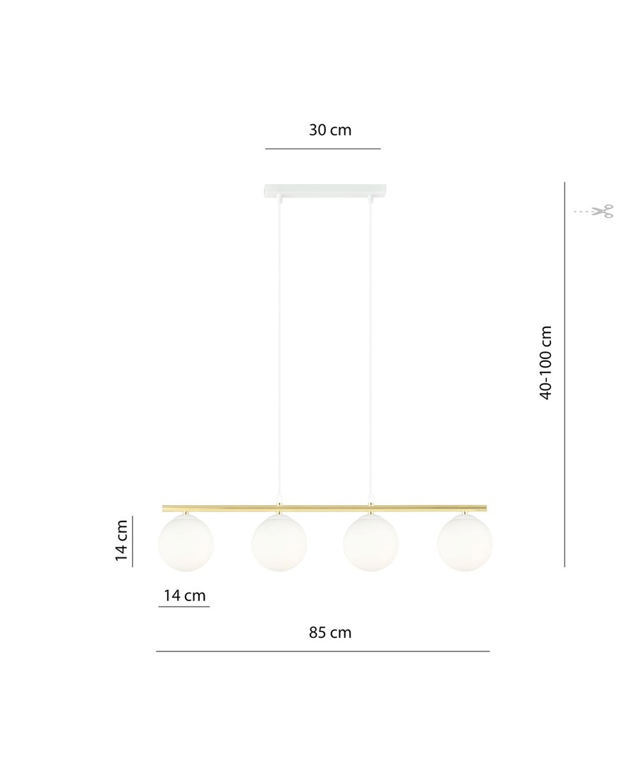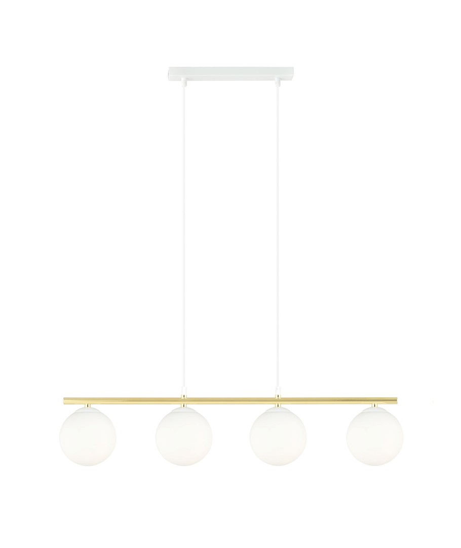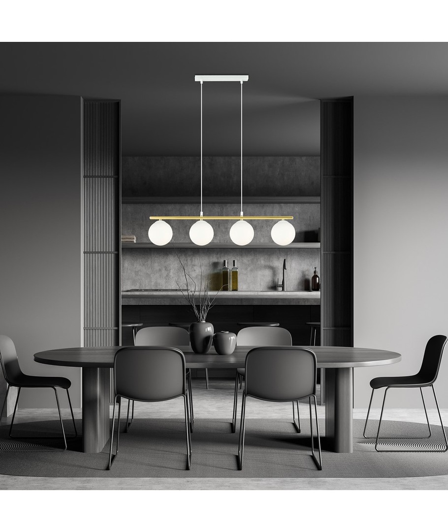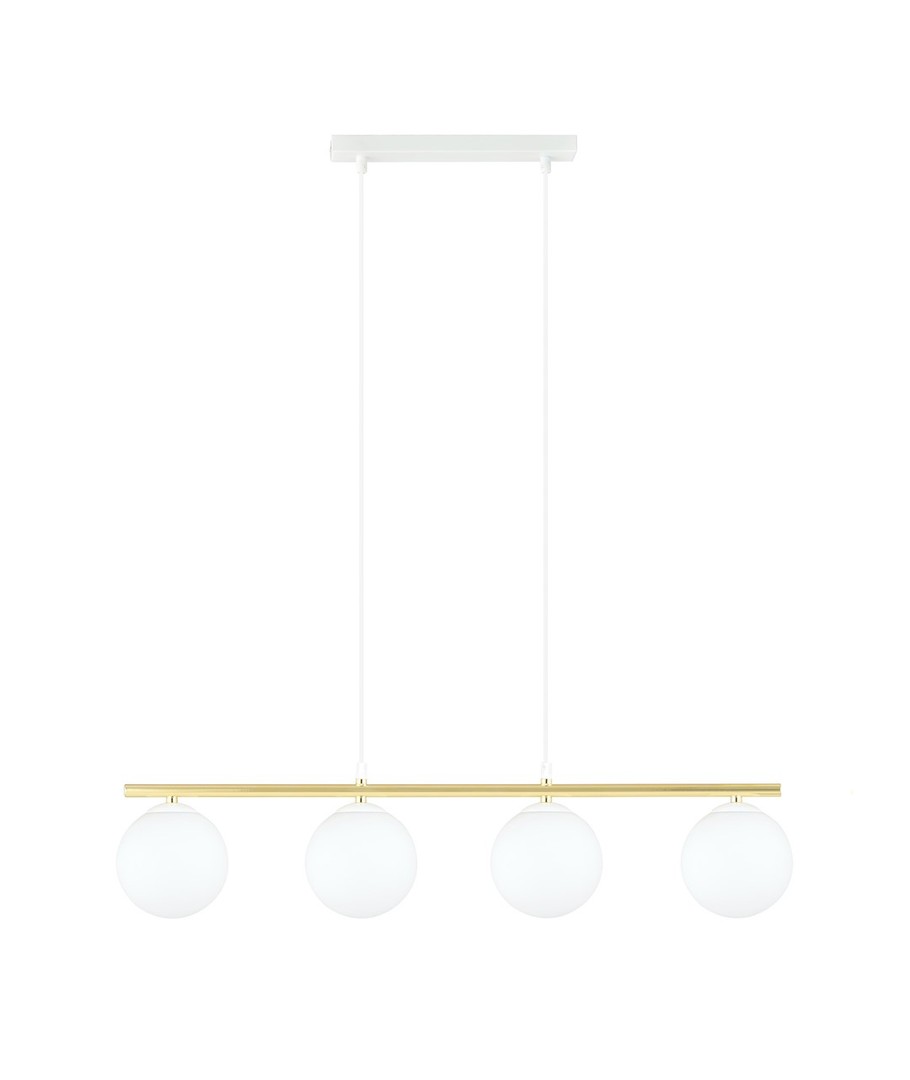 Allora 4 pendellampe bringer en kombinasjon av eleganse og stil til ditt hjem. Med sitt moderne design, som vakkert forener glamorøse detaljer, skaper denne lampen en unik visuell opplevelse. De subtile og delikate formene, komplettert med elegante gulldetaljer, gir lampen en særegen karakter som med sikkerhet vil fremheve både moderne og tradisjonelle interiører. Den justerbare høyden gjør det mulig å tilpasse lampen til forskjellige rom, mens skjermens hvite farge sikrer et behagelig og diffust lys.