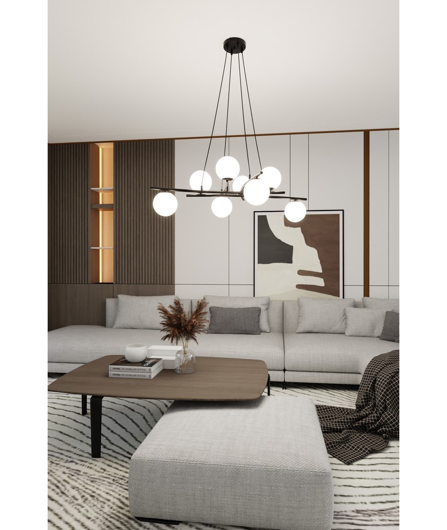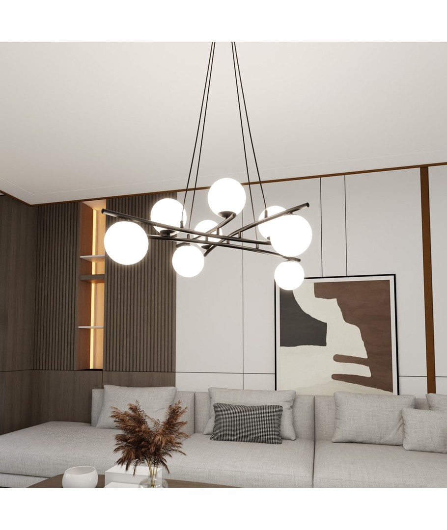 Essa 8 Opal pendellampe er en del av en spesiell serie taklamper som imponerer med sin enestående og originale form. Denne lampen tiltrekker oppmerksomhet med sin ekspansive konstruksjon og passer perfekt i stuen, hvor den tilfører unikt karakter og stil. Med sine glasslampeskjermer fremstår Essa lampen lett og elegant, noe som bidrar til en grasiøs belysning av selv store rom. Det er en funksjonell lyskilde som vakkert lyser opp dine omgivelser og tilfører en unik sjarm til innredningen.