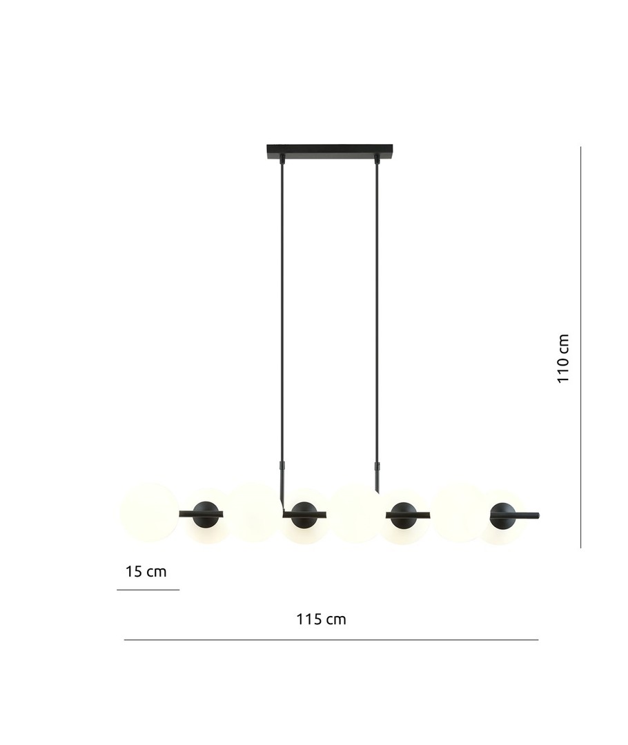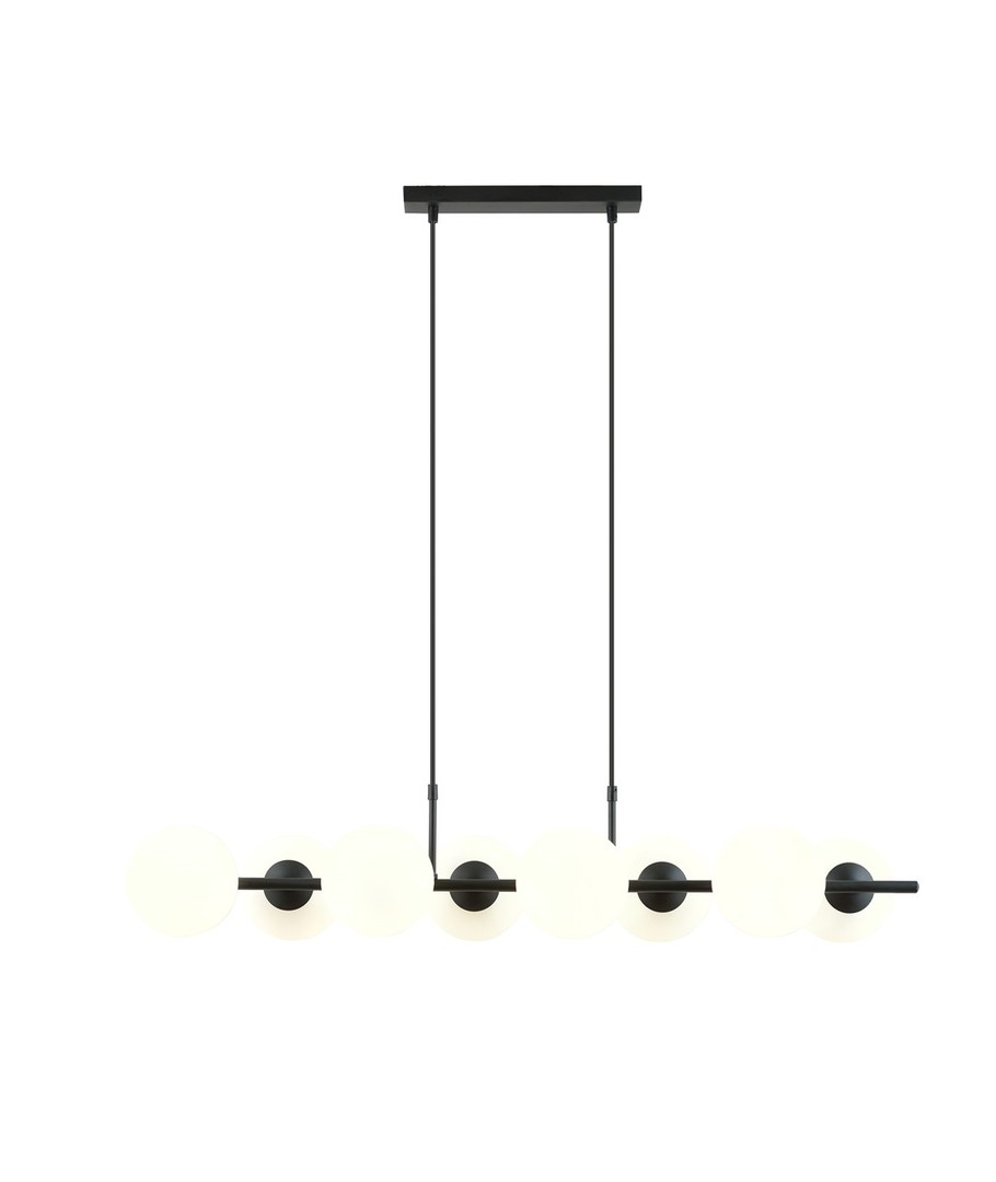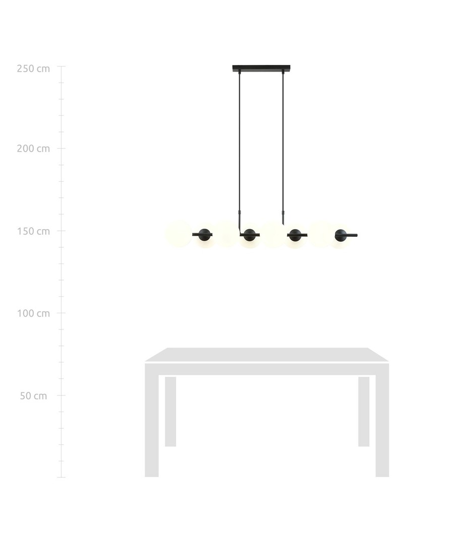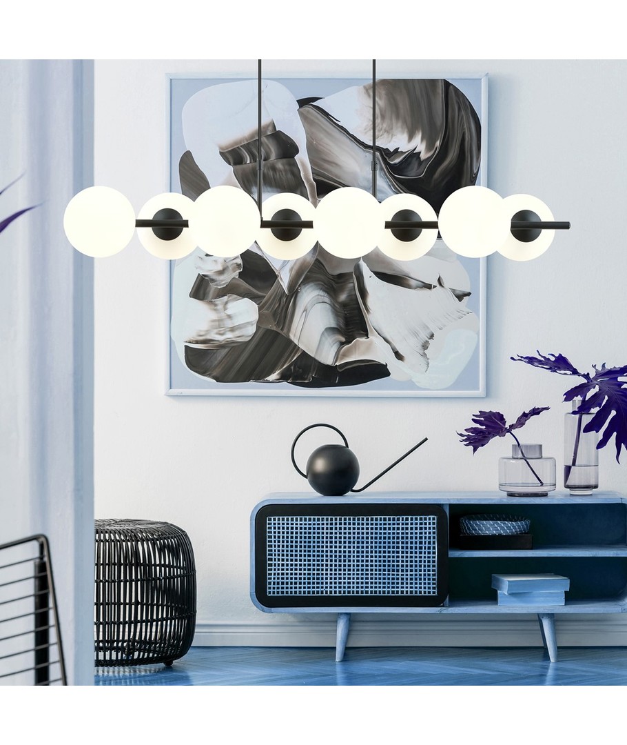 Pendellampen Rory 8 Opal er det perfekte valg for både moderne og klassiske interiører. Med sitt trendy design og lette glasskjerm fungerer den som en stilig dekorasjon som effektivt lyser opp selv store rom. Når den er plassert over et bord eller en kjøkkenøy, fungerer den som et markant fokuspunkt og tilfører en unik karakter til rommet. Lampens form harmonerer perfekt med rene linjer og åpne rom, noe som gjør den ideell for stilrene hjem.
