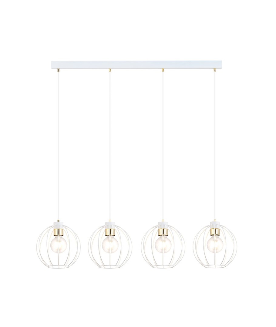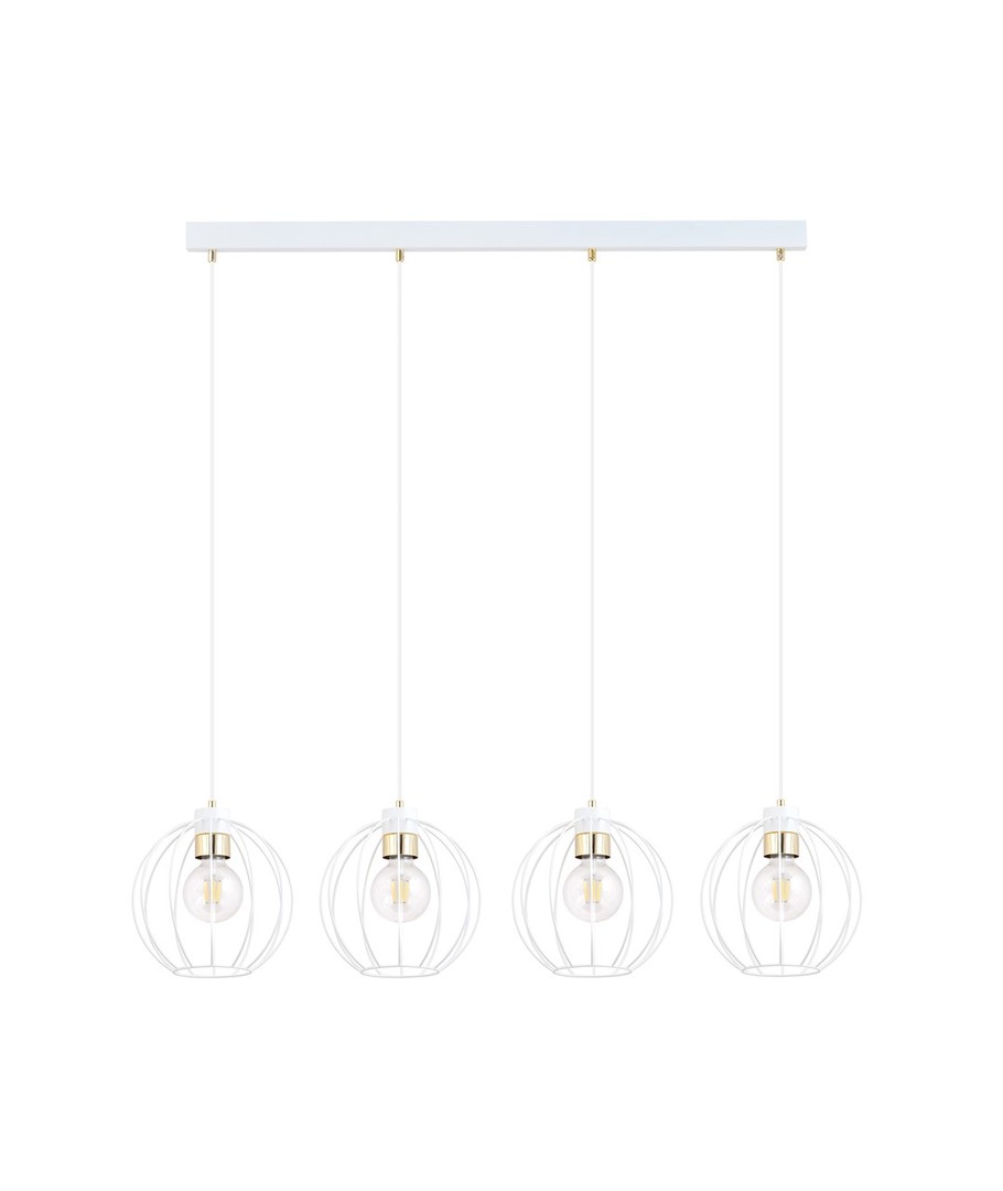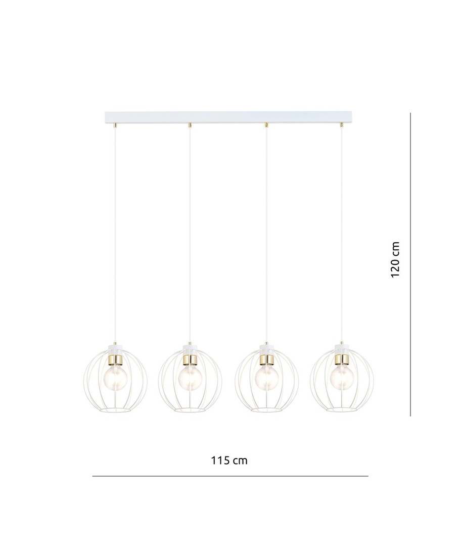 Gino 4 pendellampe i hvit og gull er en moderne belysningsløsning som passer perfekt til både stuer og loftsrom. Lampen skaper en unik atmosfære og gir jevn belysning i større rom takket være den justerbare ledningsoppheng. Med sine store metallkupler og dekorative gulldetaljer tilfører denne lampen en lett eleganse til ethvert interiør. Det stilige design gjør det enkelt å integrere lampen i de fleste hjem, mens de rene linjene og fargekontrastene skaper et visuelt tiltalende uttrykk.
