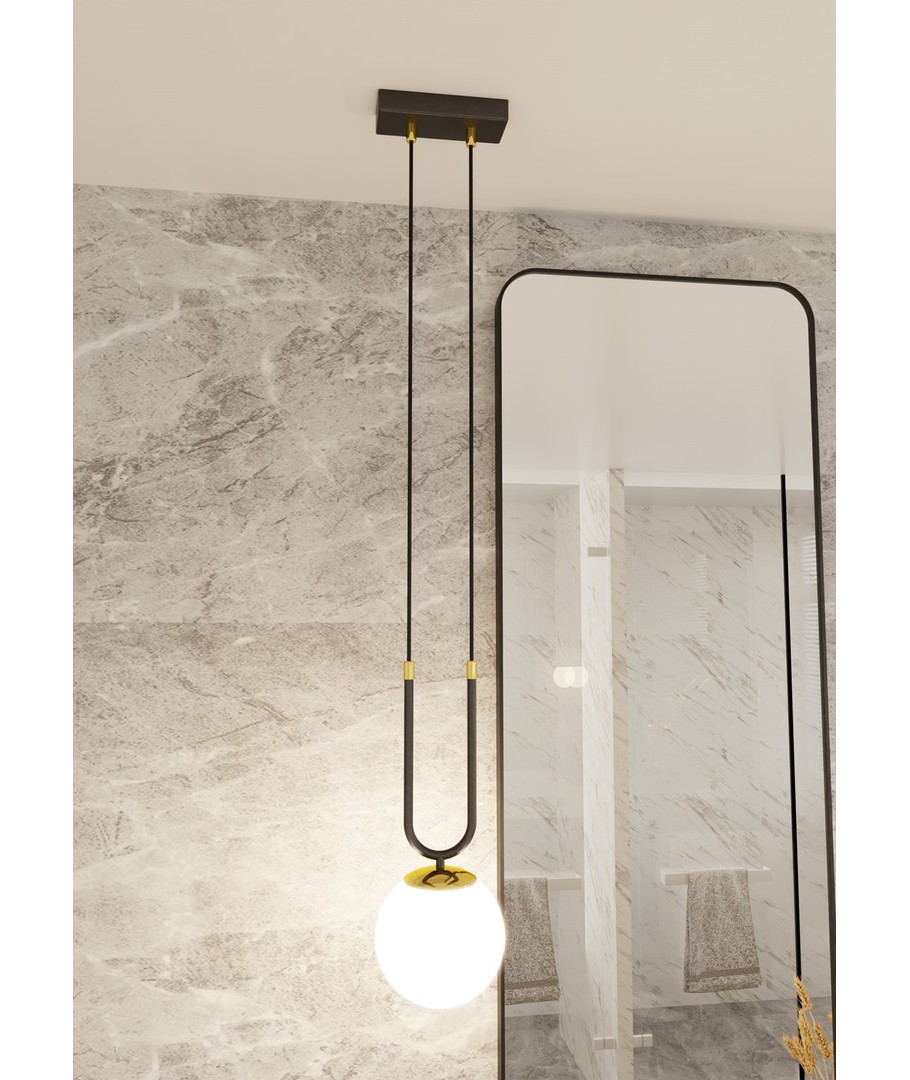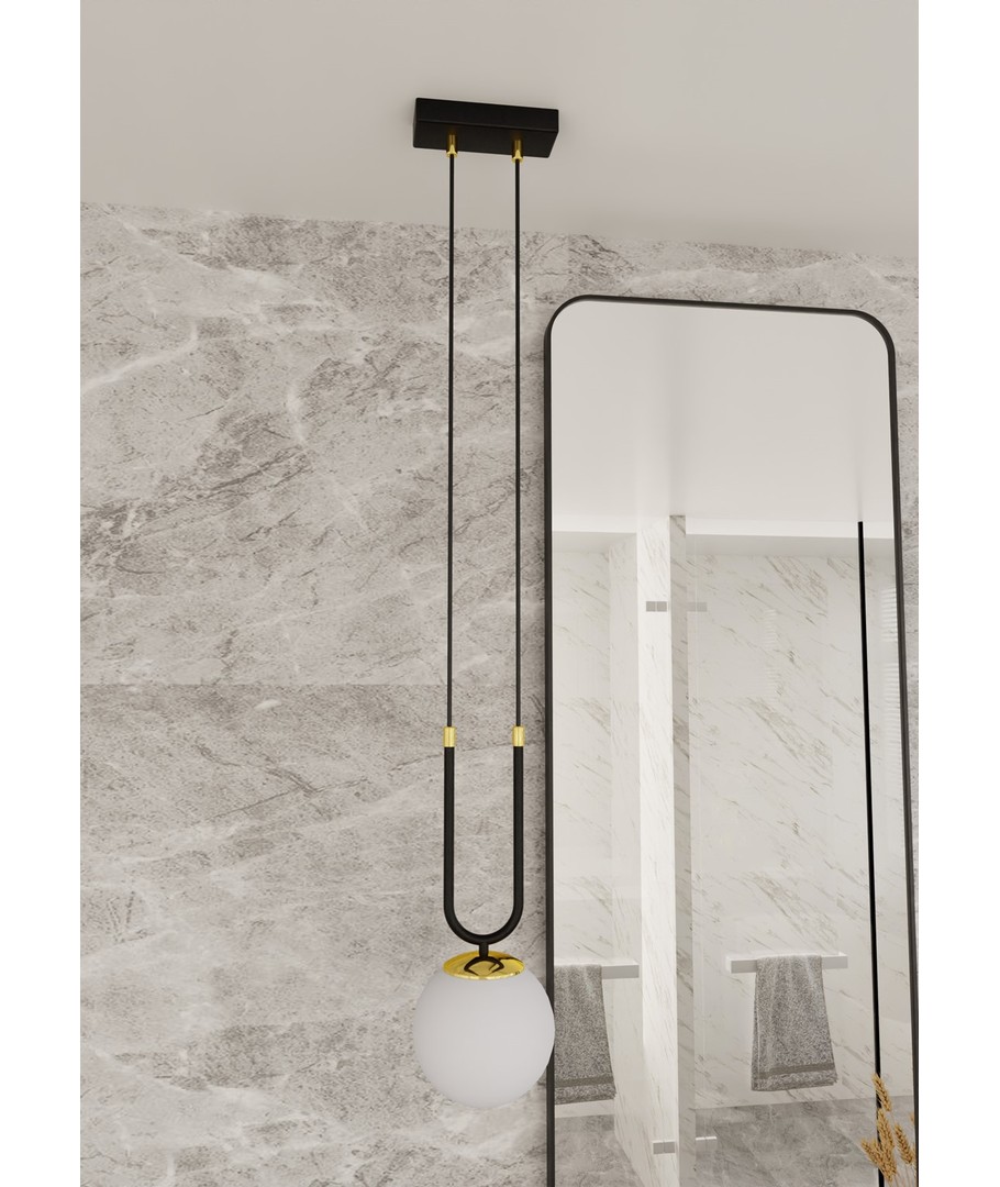 Opplev den sofistikerte elegansen med Glam 1 Svart/Opal pendellampe, designet for å tilføre et snev av glamour til ditt hjem. Denne moderne lampen er en del av den trendy GLAM-serien, som er kjent for sitt stilige utseende og luksuriøse detaljer. Perfekt for de som verdsetter skjønnhet og overdådighet, forener dens glasslampeskjerm delikatesse med de gyldne dekorative elementene, som lyser opp og livliggjør rommet. Enten den plasseres over spisebordet eller i stuen, skaper den en enestående atmosfære som vil imponere enhver gjest.