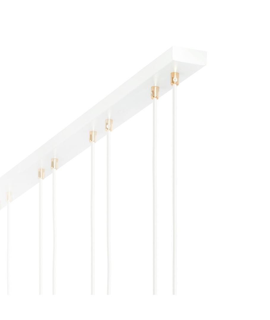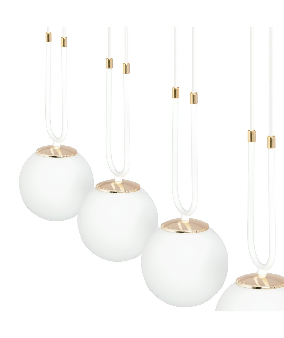 De delikate glasskulene i hvitt gir en mykhet og ynde, mens gyldne detaljer tilfører en livlig og strålende dimensjon.