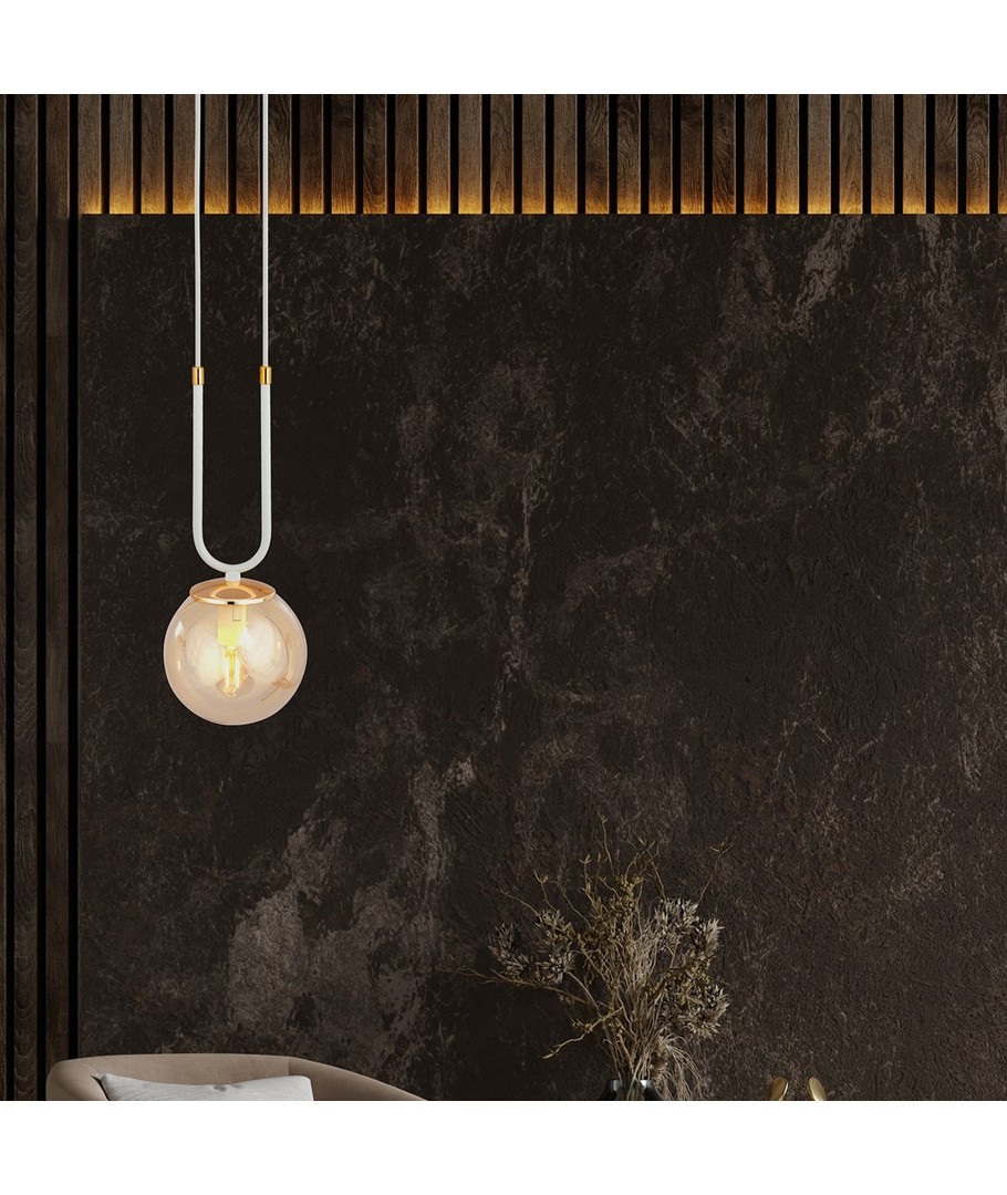 Opplev den utsøkte eleganse med Glam 1 pendellampen, perfekt for det moderne hjem. Denne lampen fra GLAM-serien fanger glamourens stil og tilfører en sofistikert atmosfære til ethvert rom. De delikate glasskjermene i rav kombinert med dekorative, gyldne detaljer, skaper et lysende midtpunkt som fremhever ethvert interiør med sin skjønnhet. Lampens enkle hvite design gjør den ideell for både minimalistiske og overdådige interiørstiler, og den passer inn i både stue, kjøkken og andre rom der eleganse verdsettes.