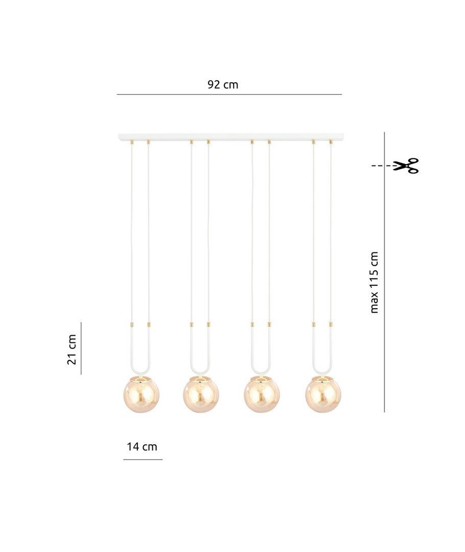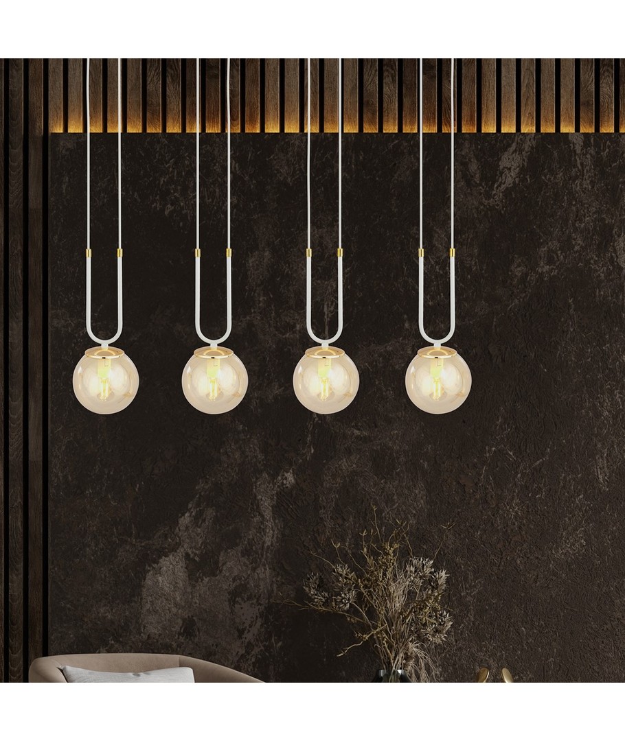 Glam 4 pendellampe kombinerer stil og funksjonalitet med sin moderne design i hvit og rav. Perfekt for å sette det lille ekstra preg på interiøret ditt. Denne elegante lampen er designet for å gi en behagelig belysning, ideell for stuer, spisestuer eller soverom.