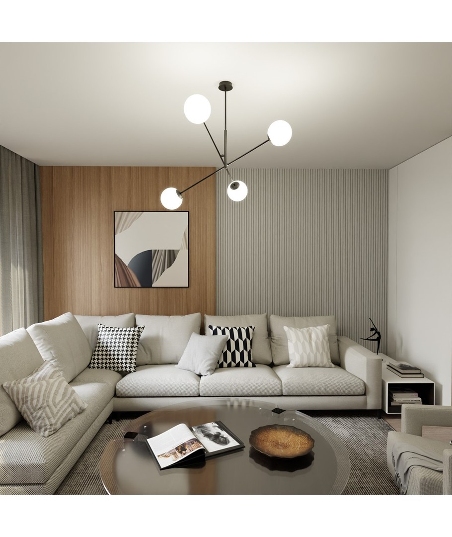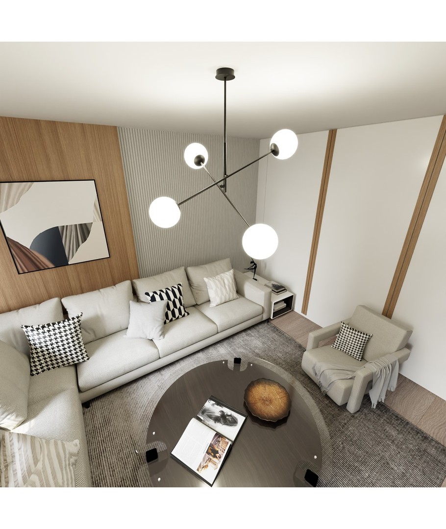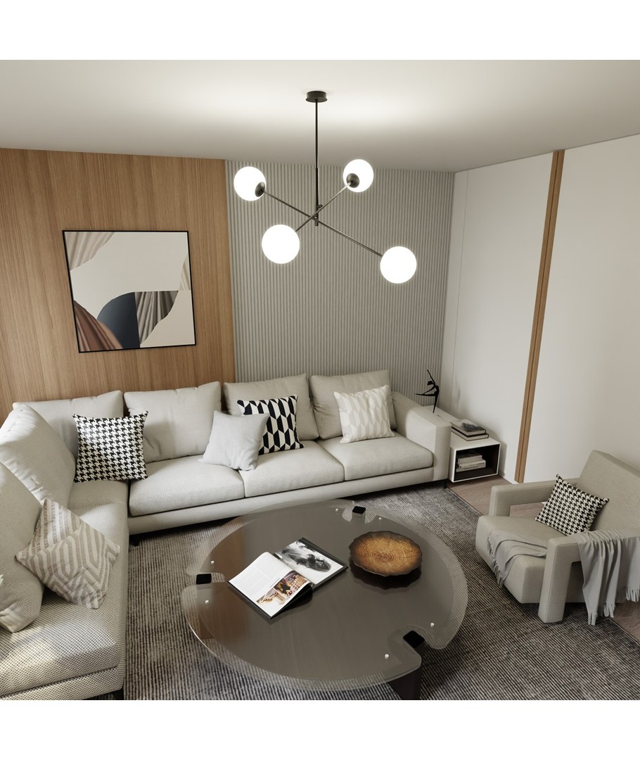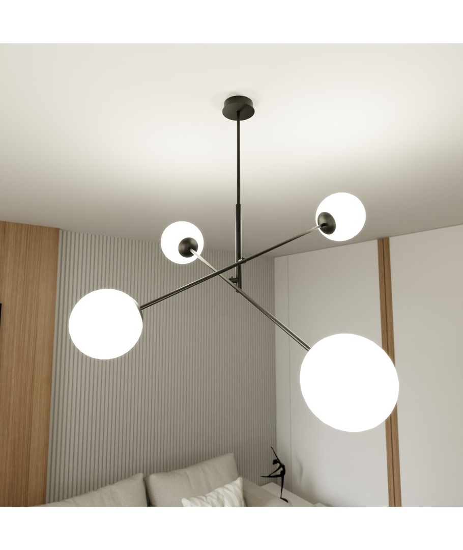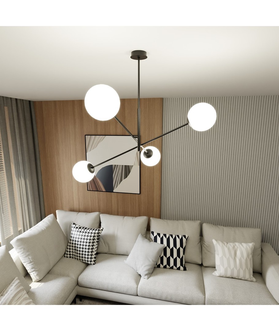 Linear 4 Sort/Opal pendellampe er en del av den populære Linear-serien, som kombinerer moderne design med tidløs eleganse. Med sine delikate glasslampeskjermer skaper denne lampen en atmosfære av letthet og raffinement. Den minimalistiske konstruksjonen gjør den ideell for både moderne og tradisjonelt innredede rom, idet den effektivt lyser opp store områder. Perfekt for å henge over et spisebord eller en kjøkkenøy, hvor den tilfører en unik karakter og stil til ditt hjem.