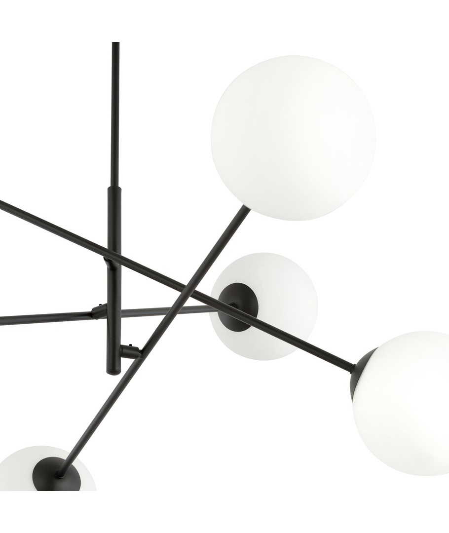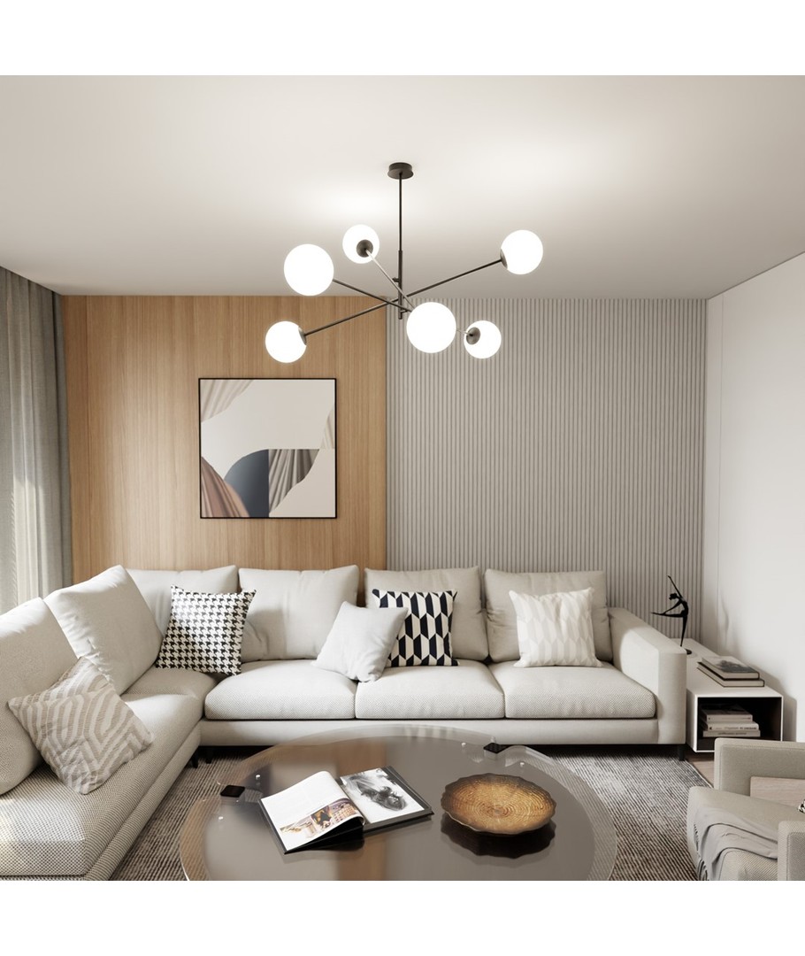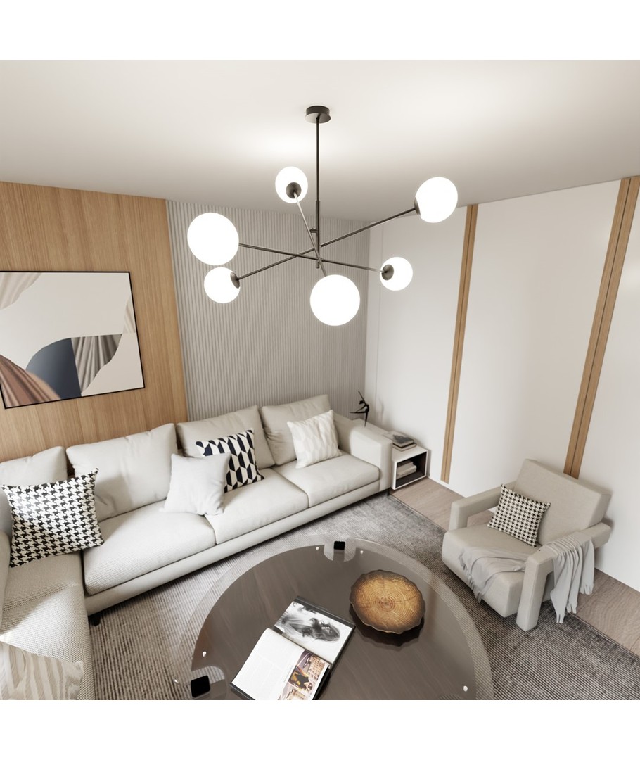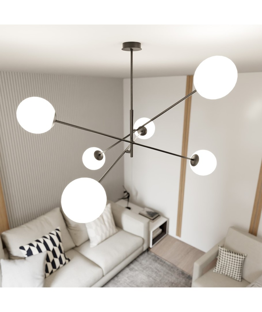 Med sine delikate glasskjermer tilfører lampen en følelse av letthet og eleganse til rommet. Designet sikrer at store områder effektivt blir opplyst, samtidig som lampen ubesværet integreres i diverse boliginnredninger.