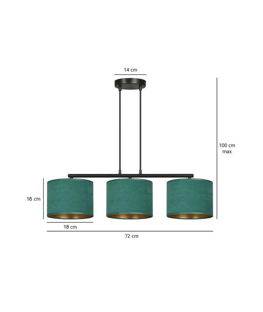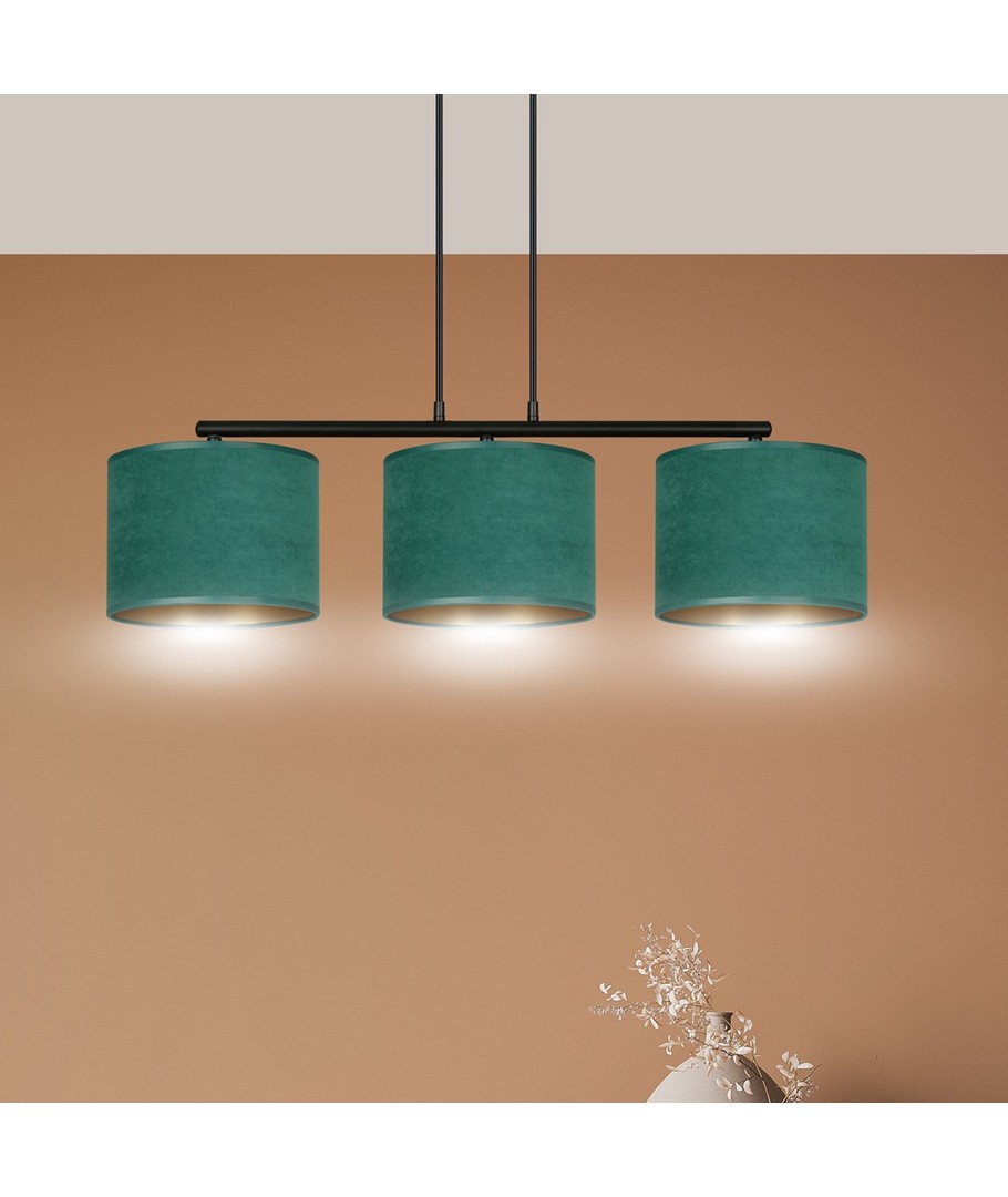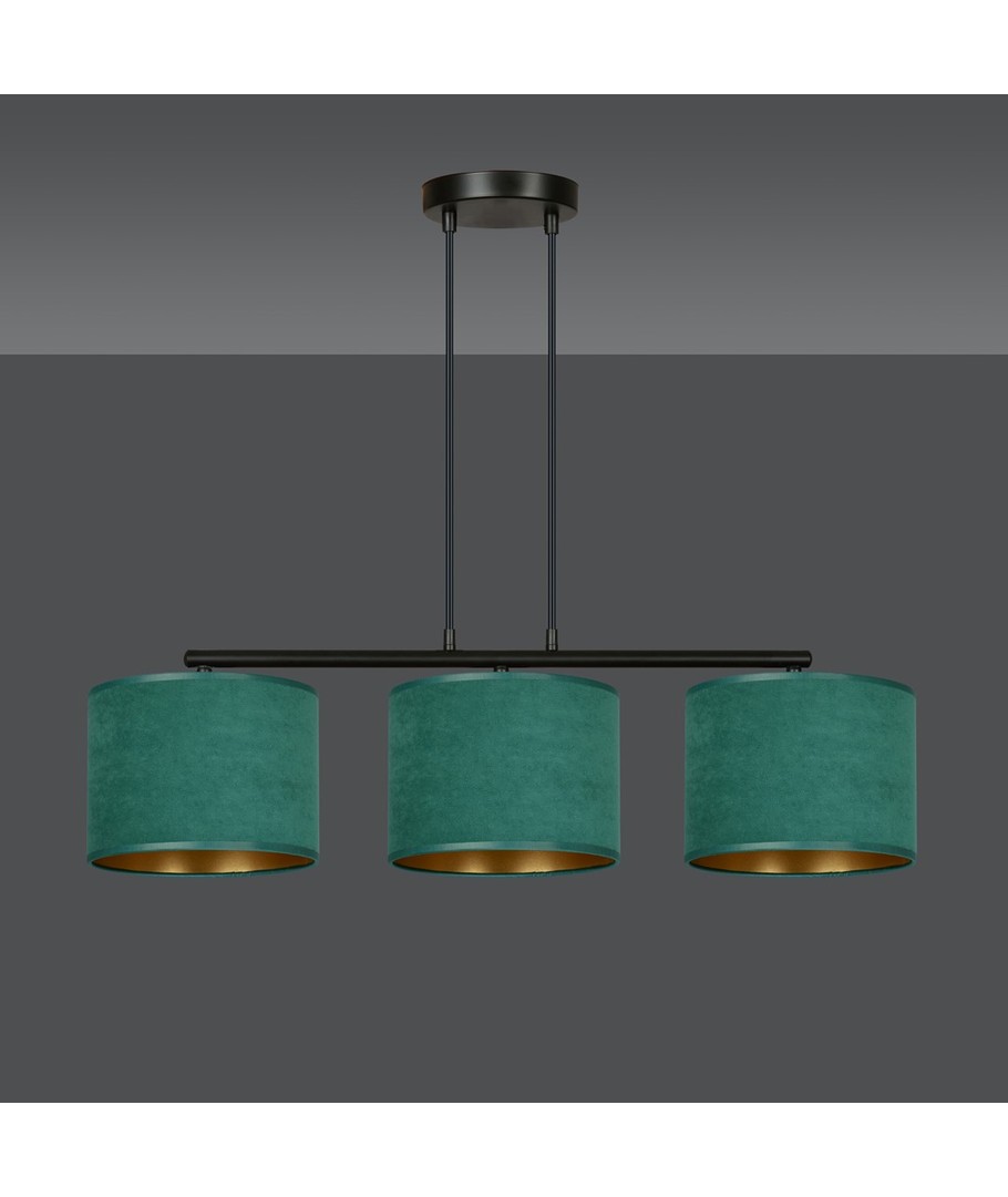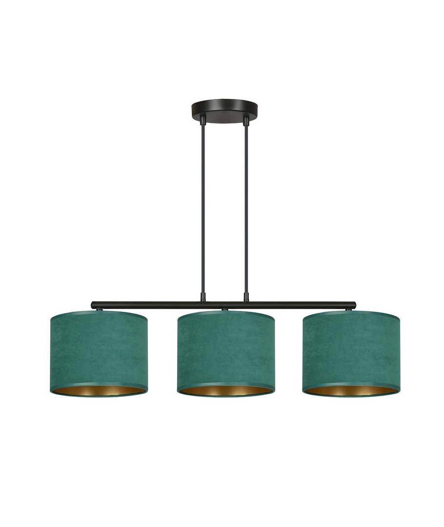 Hilde 3 Sort/Grønn pendellampe kombinerer moderne og klassisk design, noe som gjør den perfekt for ethvert interiør. Denne pendellampen har en justerbar ledningslengde som gir mulighet for tilpasning etter dine unike behov. Lampeskjermene er laget av et holdbart materiale med en fløyelsaktig tekstur og en gyllen innside som tilfører en luksuriøs følelse. Den enkle konstruksjonen og elegante fargekombinasjonen gjør denne lampen til et allsidig valg som passer perfekt over spisebordet eller i stuen.