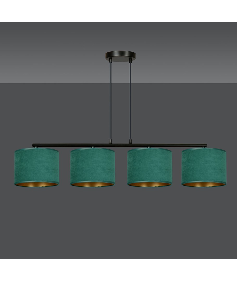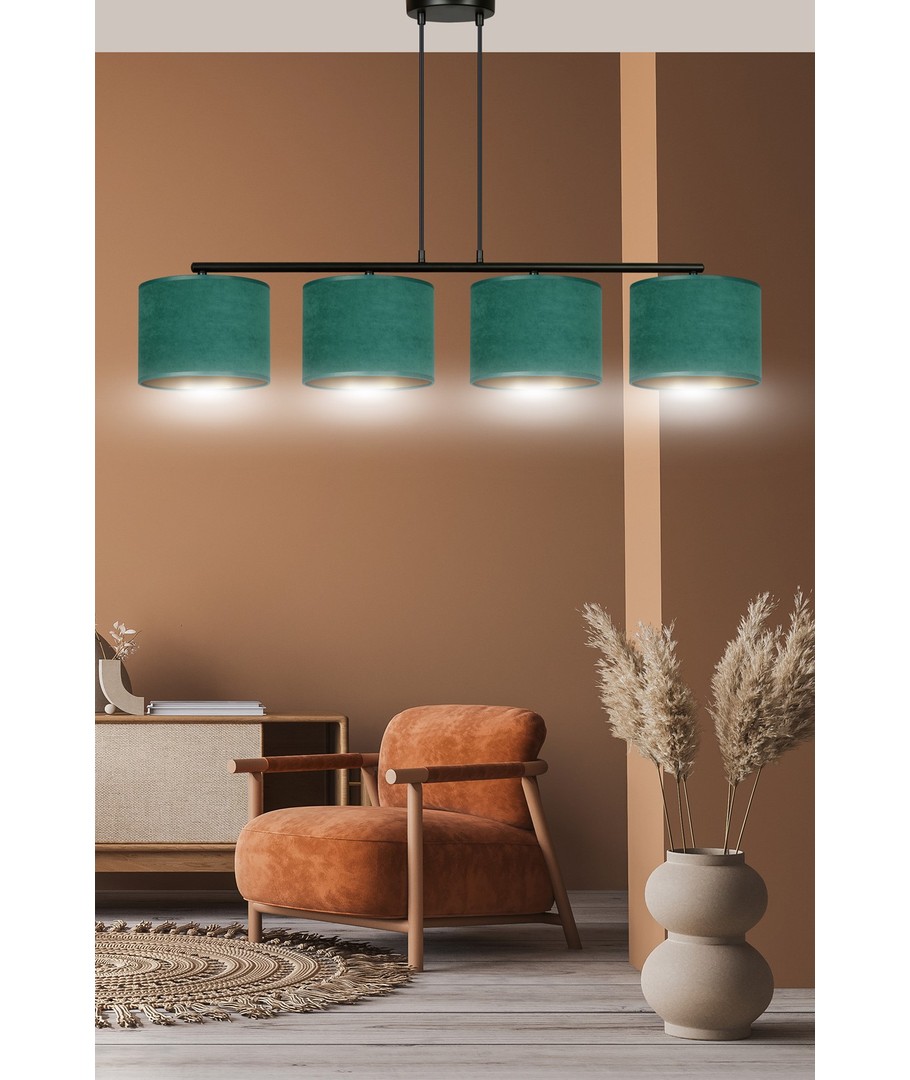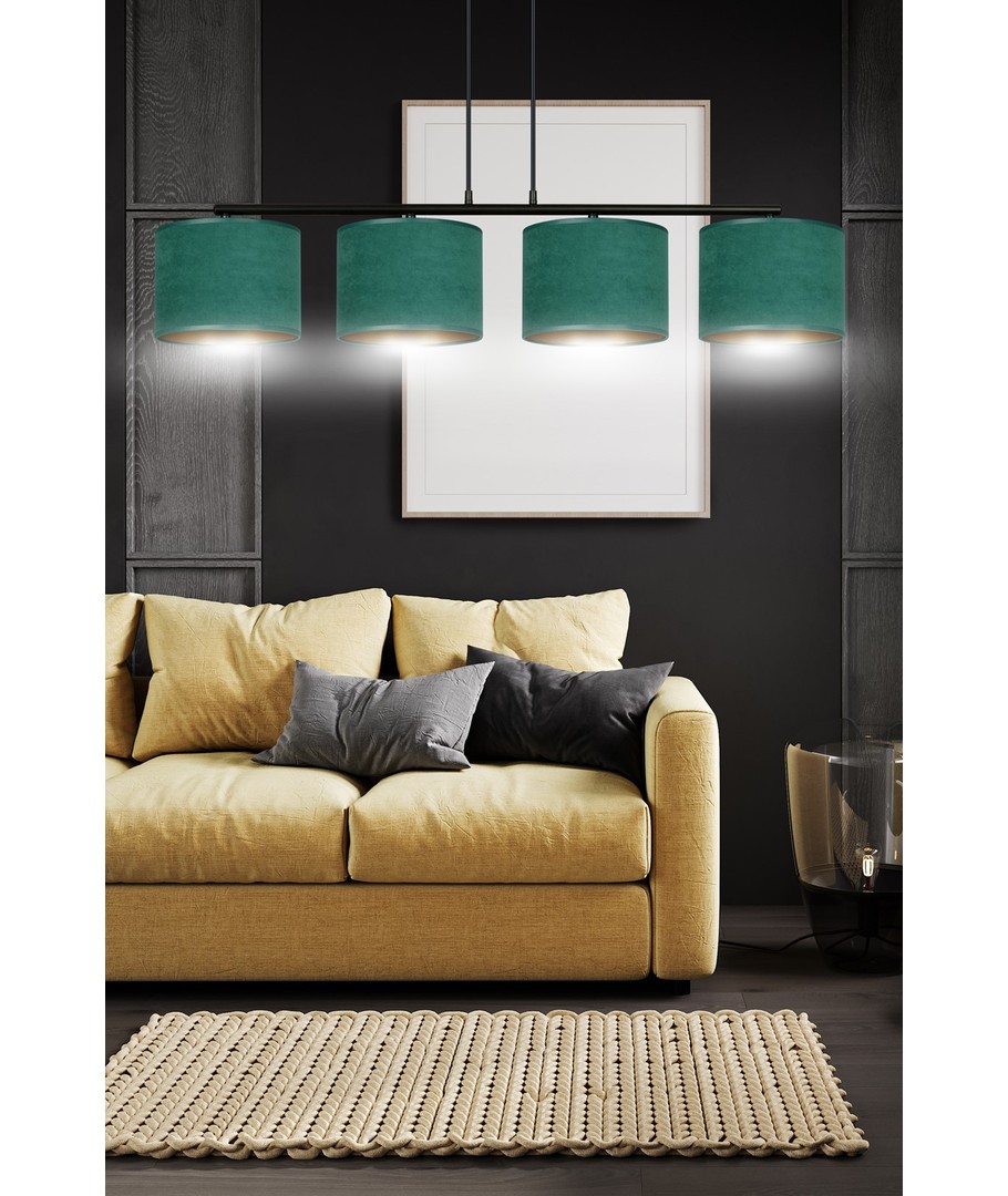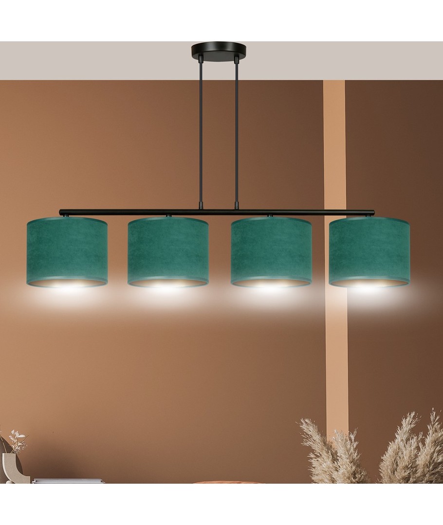 Hilde 4 Svart/Grønn pendellampe er en stilfull belysningsløsning perfekt for både moderne og klassiske interiører. Dens enkle konstruksjon og elegante fargesammensetning gjør den til et allsidig valg, som passer til forskjellige rom. Lampens lengde kan justeres, noe som gjør det mulig å tilpasse etter individuelle behov. De grønne lampeskjermene, laget av et holdbart materiale med en myk, velourlignende tekstur og gyllen innside, tilfører et snev av luksus til enhver innredning. Designet sikrer at uansett plassering, vil lampen være et iøynefallende og funksjonelt element i hjemmet.