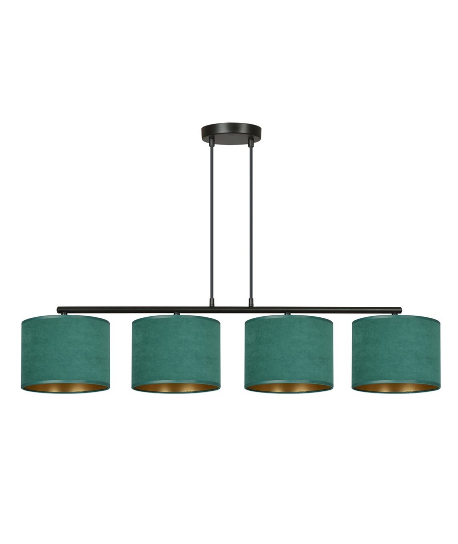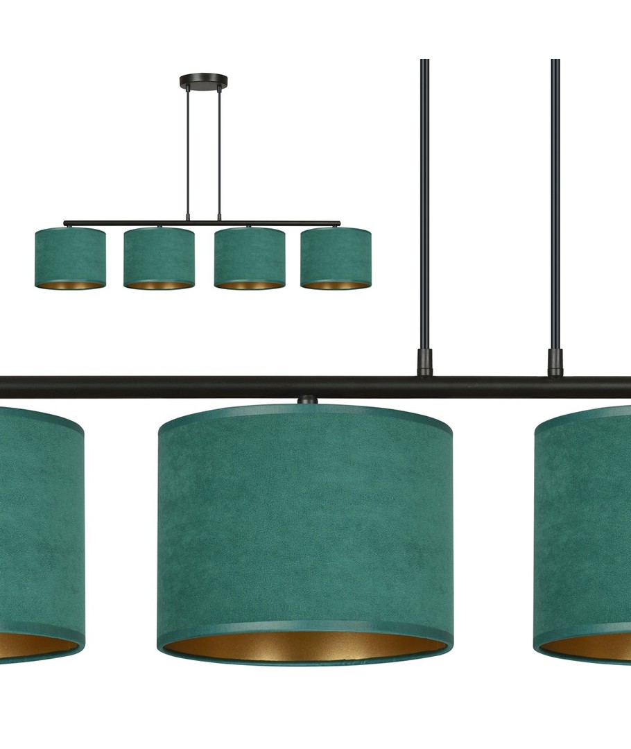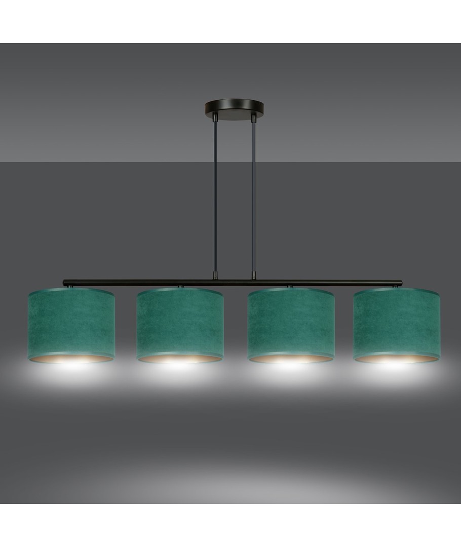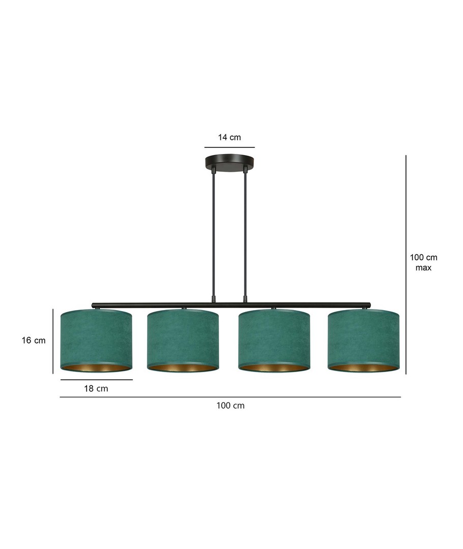 Hilde 4 Svart/Grønn pendellampe er en stilfull belysningsløsning perfekt for både moderne og klassiske interiører. Dens enkle konstruksjon og elegante fargesammensetning gjør den til et allsidig valg, som passer til forskjellige rom. Lampens lengde kan justeres, noe som gjør det mulig å tilpasse etter individuelle behov. De grønne lampeskjermene, laget av et holdbart materiale med en myk, velourlignende tekstur og gyllen innside, tilfører et snev av luksus til enhver innredning. Designet sikrer at uansett plassering, vil lampen være et iøynefallende og funksjonelt element i hjemmet.