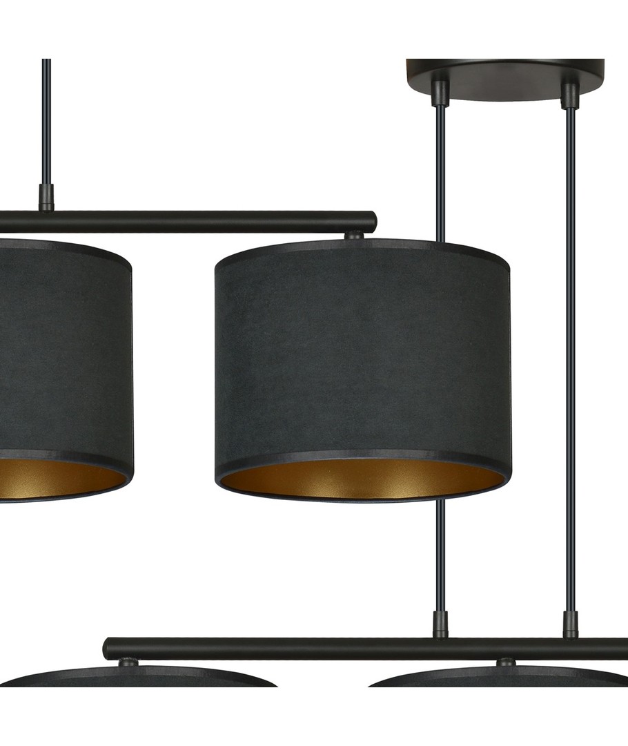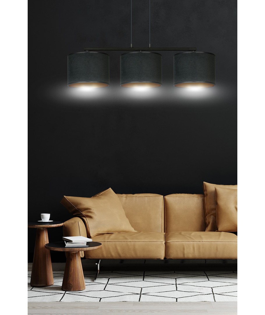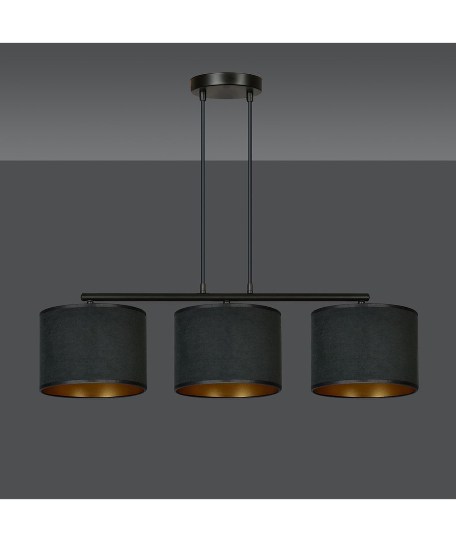 Hilde 3 Sort pendellampe er den perfekte kombinasjon av moderne design og klassisk eleganse. Denne allsidige lampen passer perfekt inn i både moderne og klassiske interiører. Med sine justerbare ledninger kan du tilpasse høyden, slik at den passer til dine individuelle behov. Lampeskjermene er fremstilt av holdbart materiale og presenterer en fløyelsmyk overflate med en gyllen innside, som gir en varm og innbydende belysning. Den enkle konstruksjonen og elegante fargeskjema gjør lampen til et opplagt valg for ethvert rom.