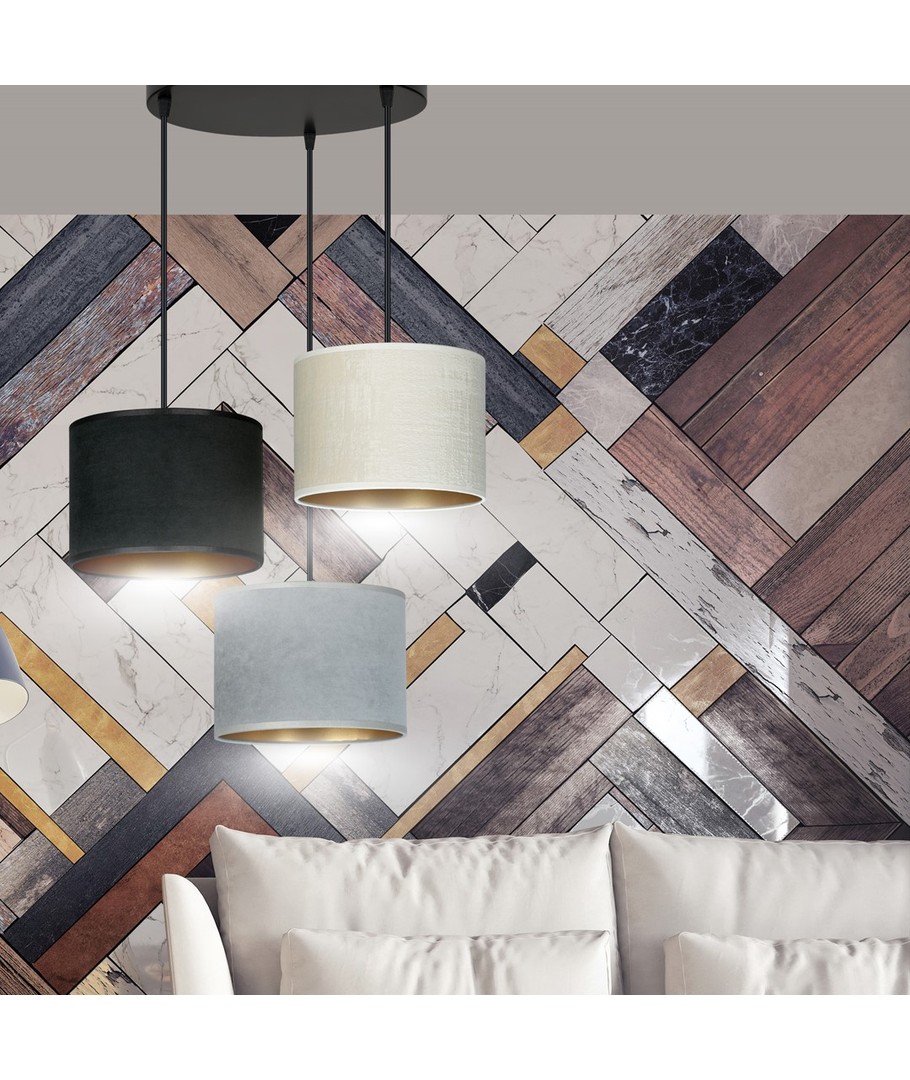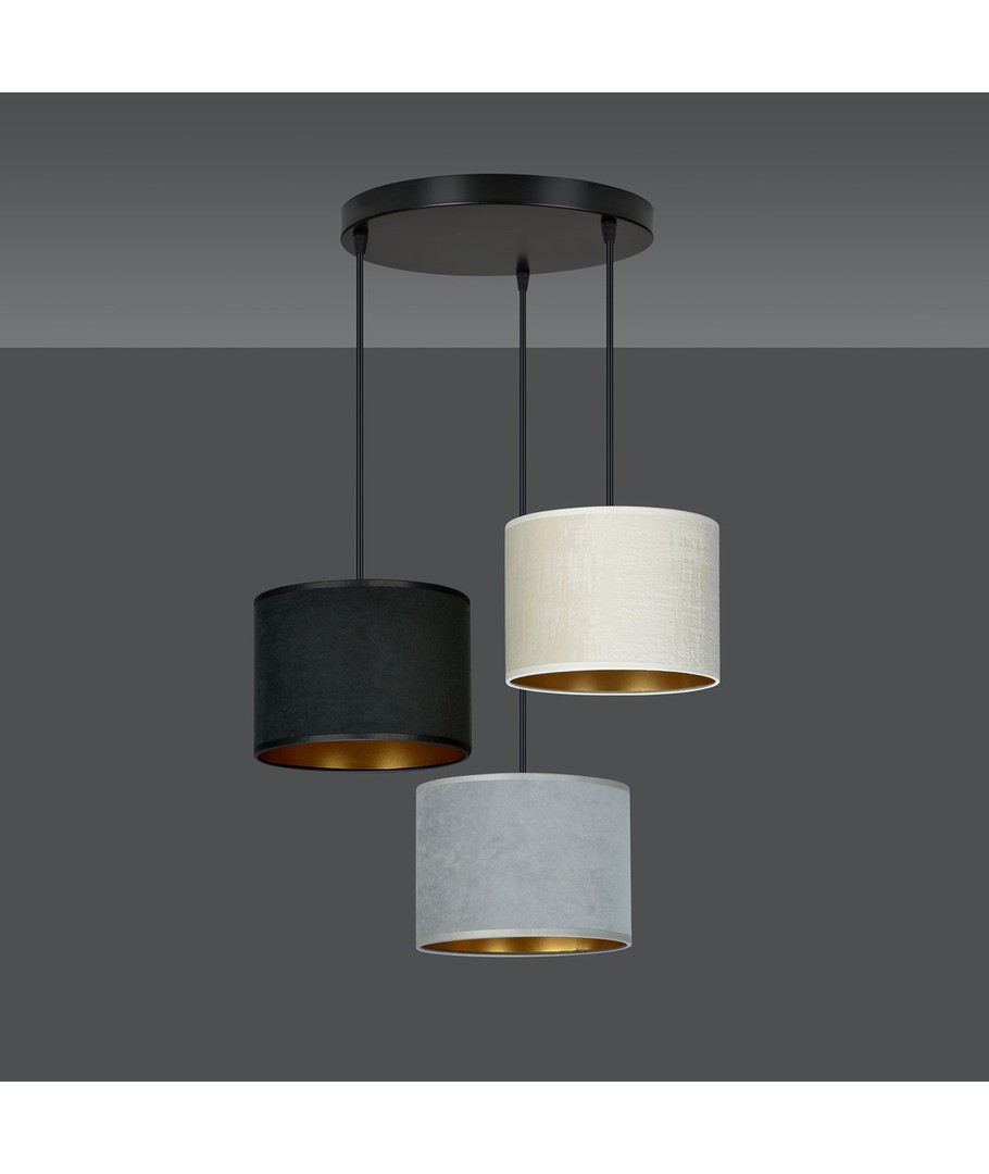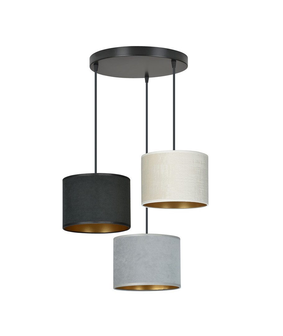 Hilde 3 Sort Premium Mix pendellampe er den ideelle belysningsløsning for moderne og klassiske hjem. Med dens justerbare ledninger kan lampen lett tilpasses etter dine behov, noe som gjør den både funksjonell og fleksibel. Lampeskjermene er laget av slitesterkt materiale med en fløyelsaktig tekstur og en gyllen innside, som tilfører en varm glød til ethvert rom.