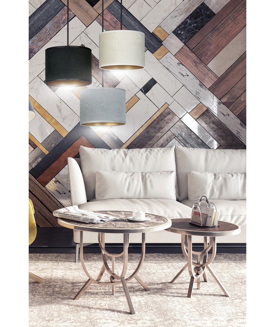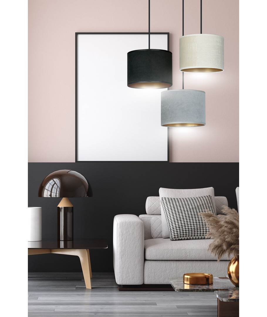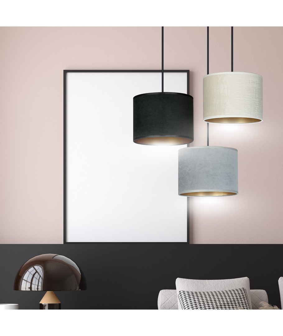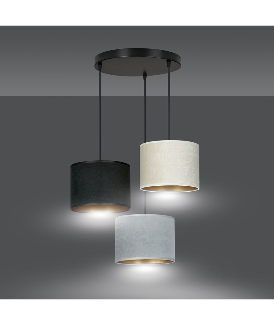 Hilde 3 Sort Premium Mix pendellampe er den ideelle belysningsløsning for moderne og klassiske hjem. Med dens justerbare ledninger kan lampen lett tilpasses etter dine behov, noe som gjør den både funksjonell og fleksibel. Lampeskjermene er laget av slitesterkt materiale med en fløyelsaktig tekstur og en gyllen innside, som tilfører en varm glød til ethvert rom.
