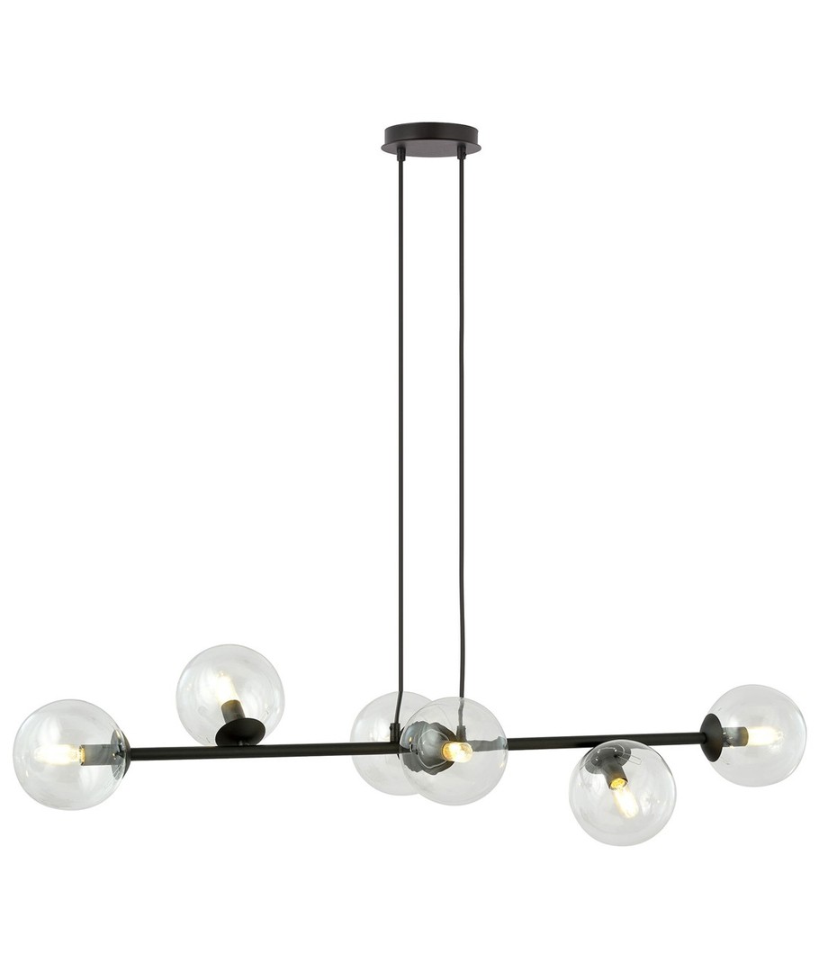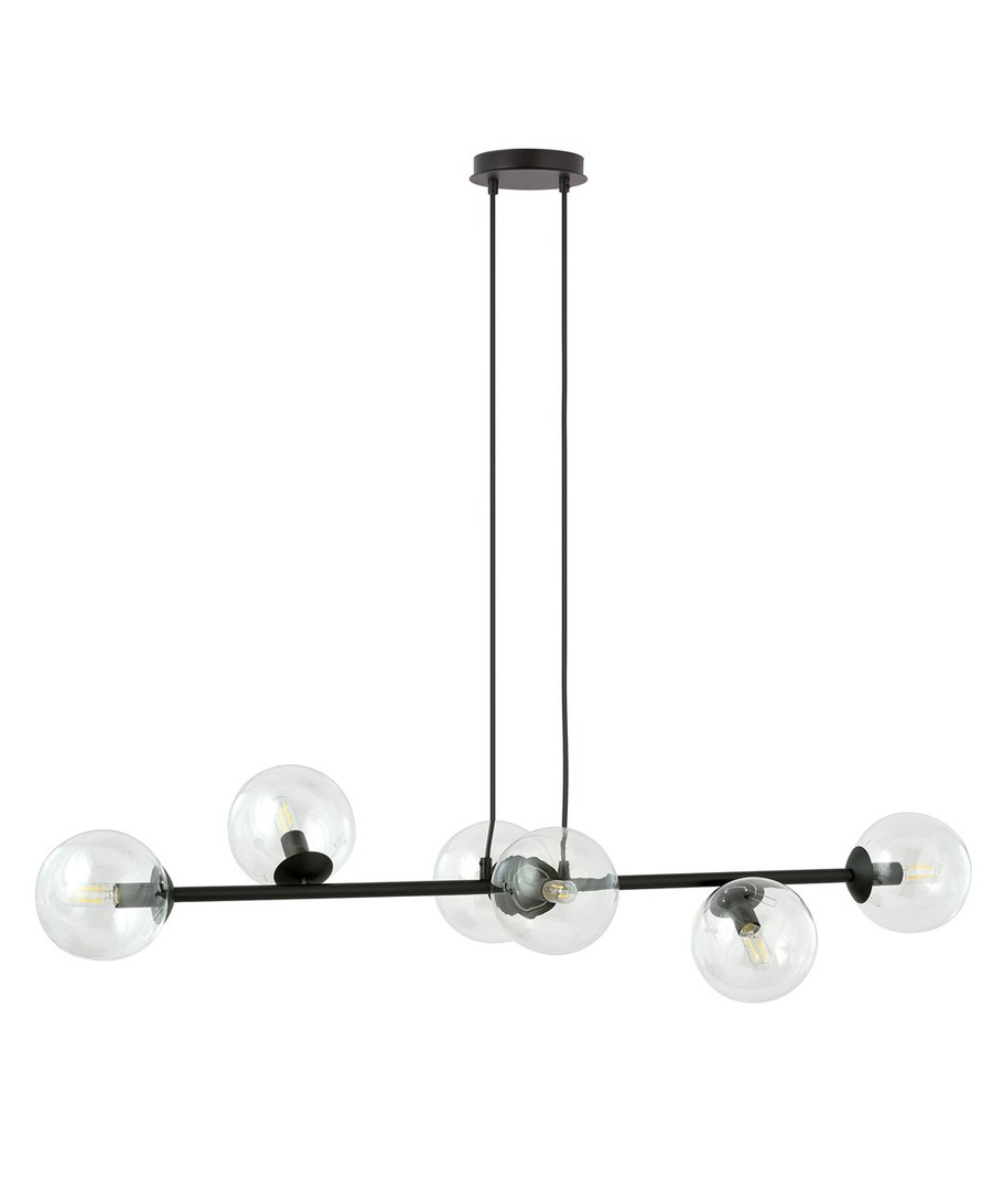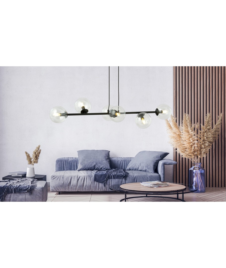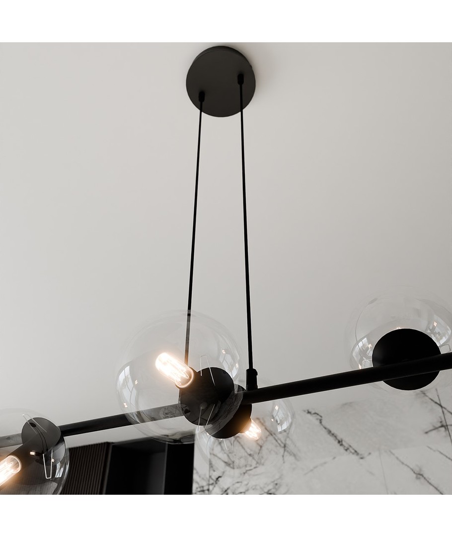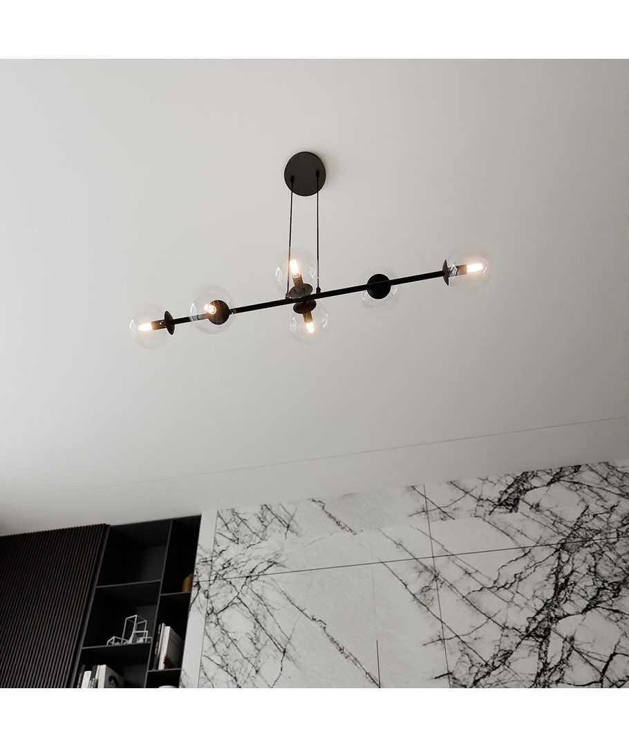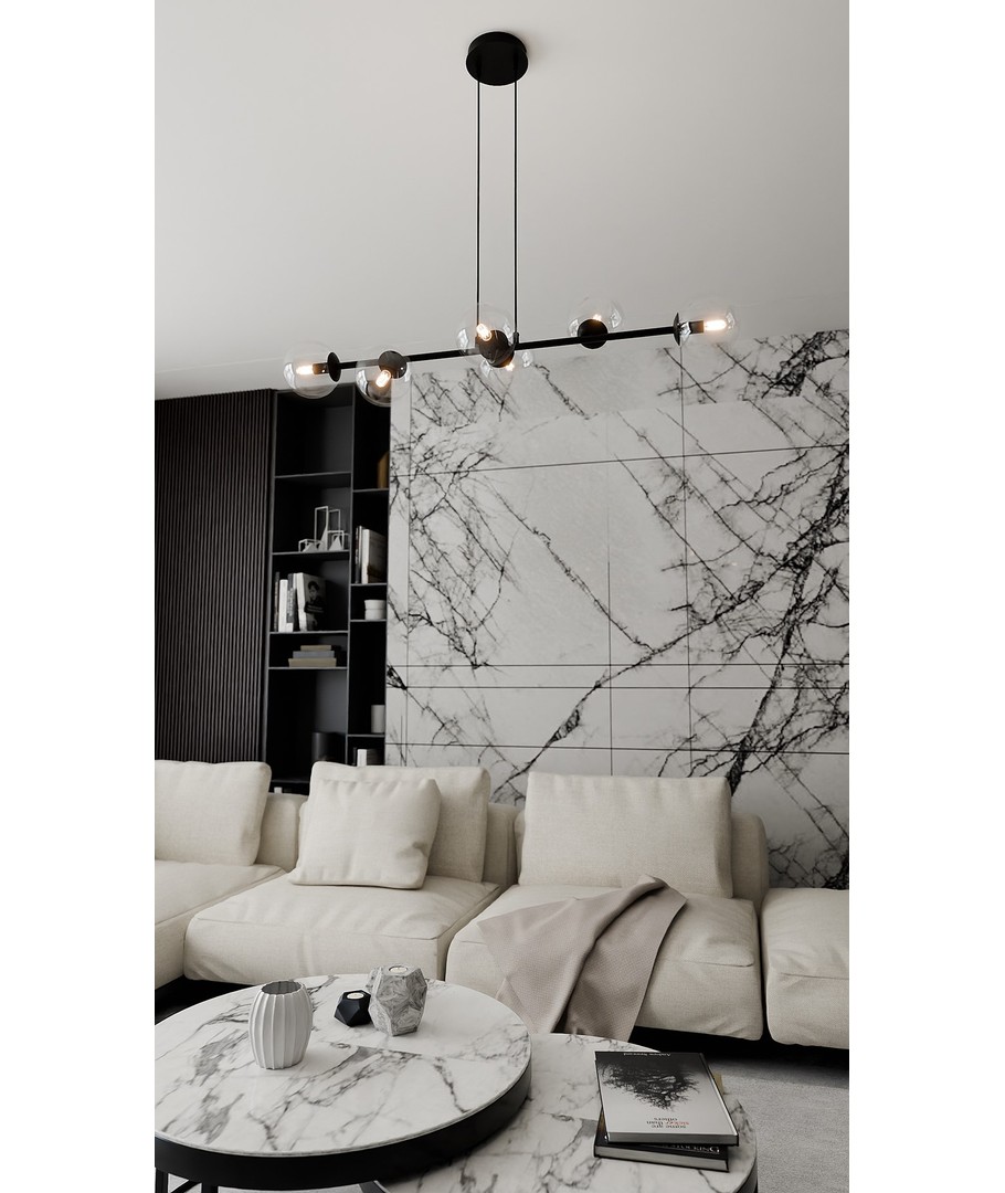 Rossi 6 pendellampe kombinerer minimalistisk estetikk med moderne design, som passer perfekt inn i enhver stilren innredning. De elegante, transparente lampeskjermene gir et flott lys som skaper en behagelig atmosfære i rommet. Med dens justerbare høyde kan du lett tilpasse lampen etter dine behov, noe som gjør den ideell både til spisebordet og stuen. Det pulverlakkerte stålet i svart gir en robust og holdbar finish, som står i kontrast til de klare glasskjermene, og lampens tidløse design sikrer at den forblir moderne og stilfull i mange år.