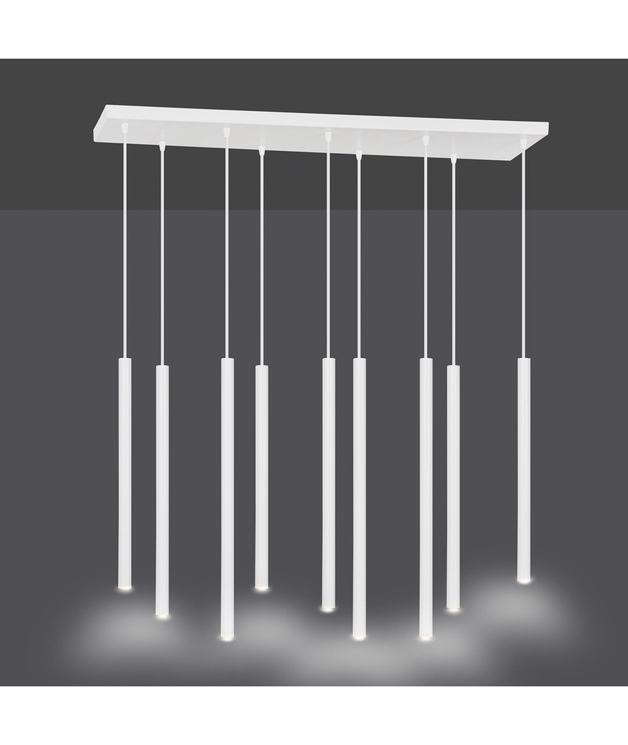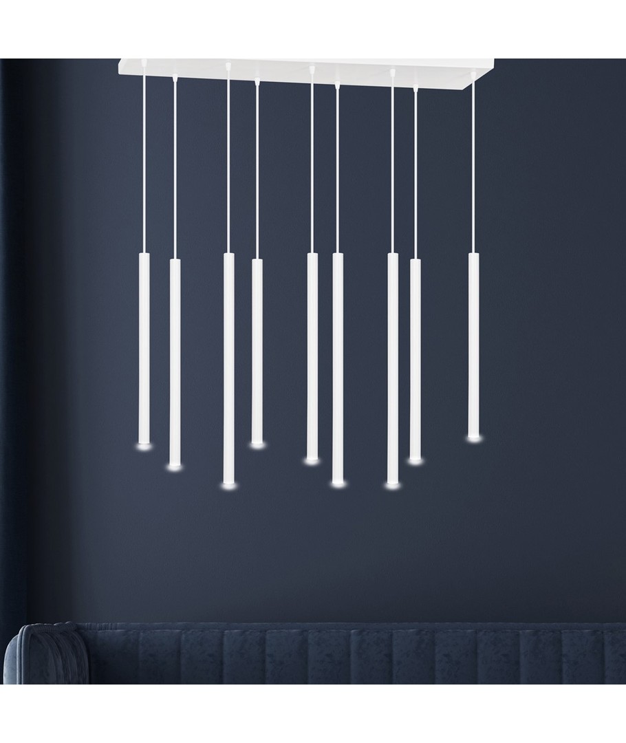 Opplev den moderne elegansen med Selter 9 Hvit pendellampe. Denne unike taklampen kjennetegnes av sine lange, slanke metallblader og en minimalistisk struktur som gir et lett og utrolig originalt utseende. Designet er perfekt for de som søker utradisjonelle løsninger og en stilfull innredning. Med sitt iøynefallende og moderne utseende er Selter-serien et fremragende valg for å tilføre et snev av moderne sjarm til ethvert rom.